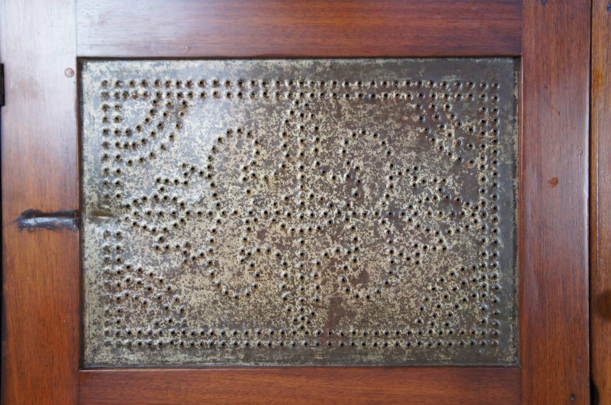A pie safe with a punched tin front promotes air circulation throughout the cabin while preventing dirt, insects and even hungry children from getting to the baked goods inside.