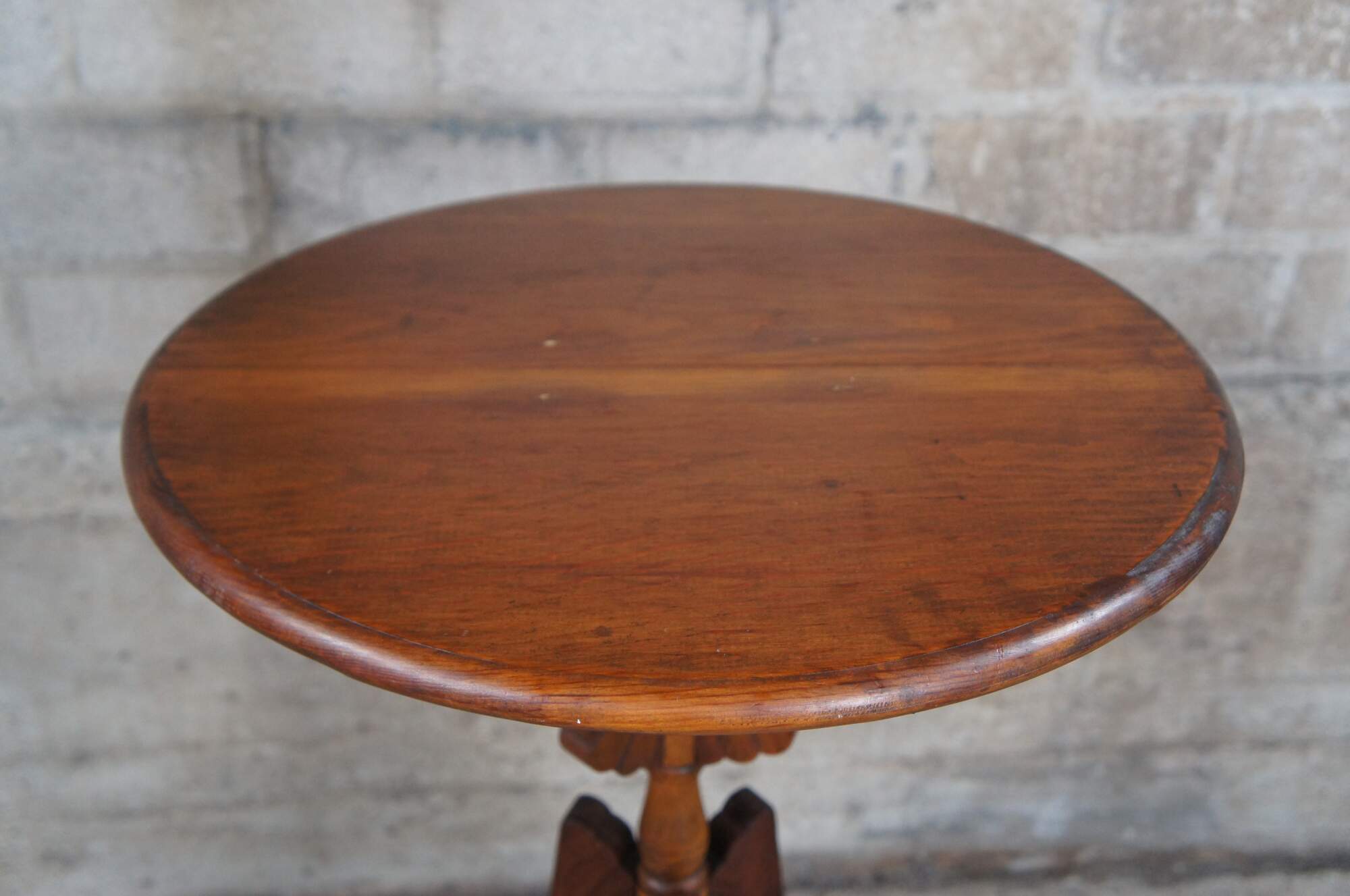 Antique Eastlake Victorian round oak parlor pedestal table featuring a tripod base with carved leaves and drop finial.