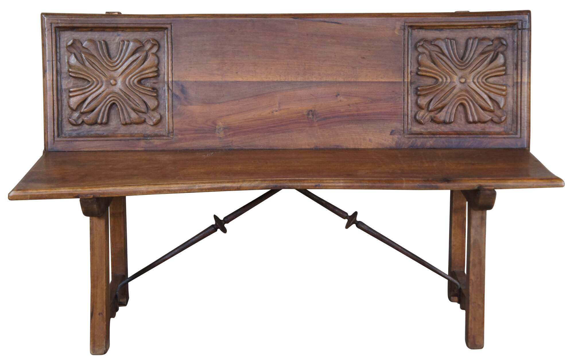 Antique Spanish Renaissance entryway bench, banquette or "Escano" in Spanish. Circa 19th Century. Made from walnut with beautifully carved medallions along the back and iron braces between the legs.