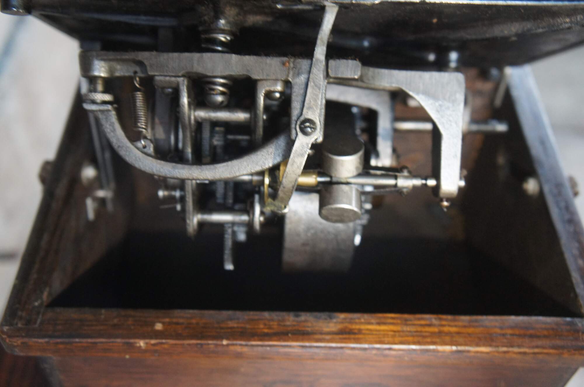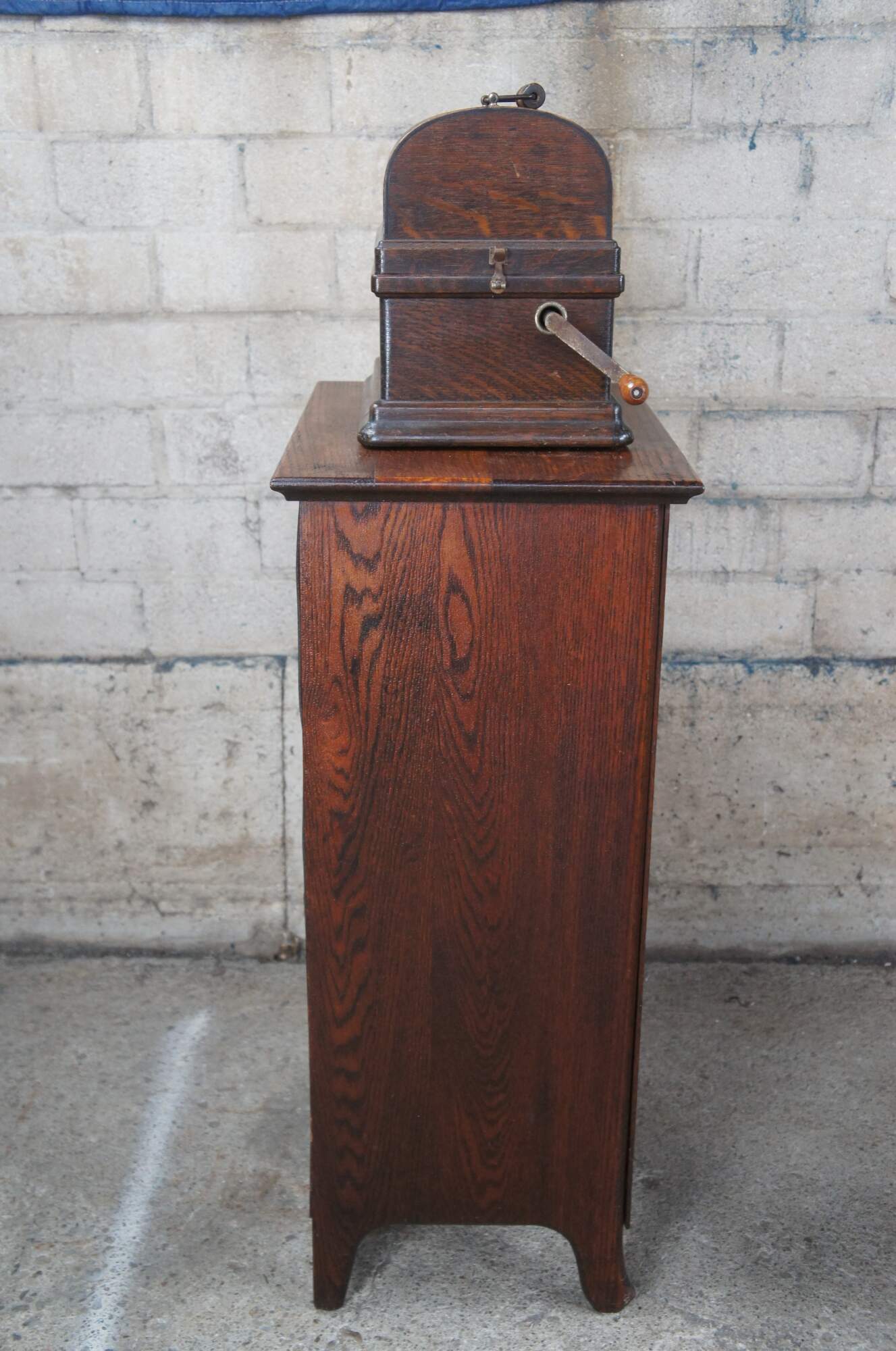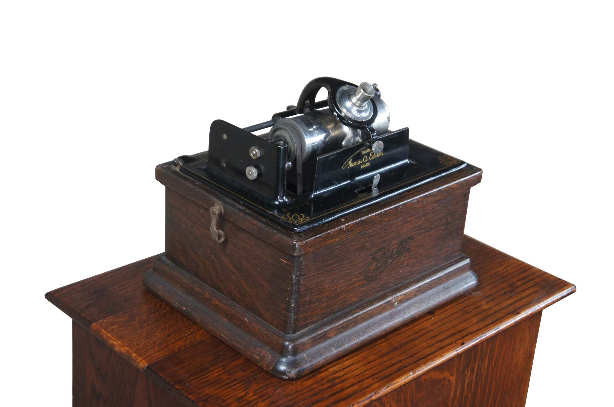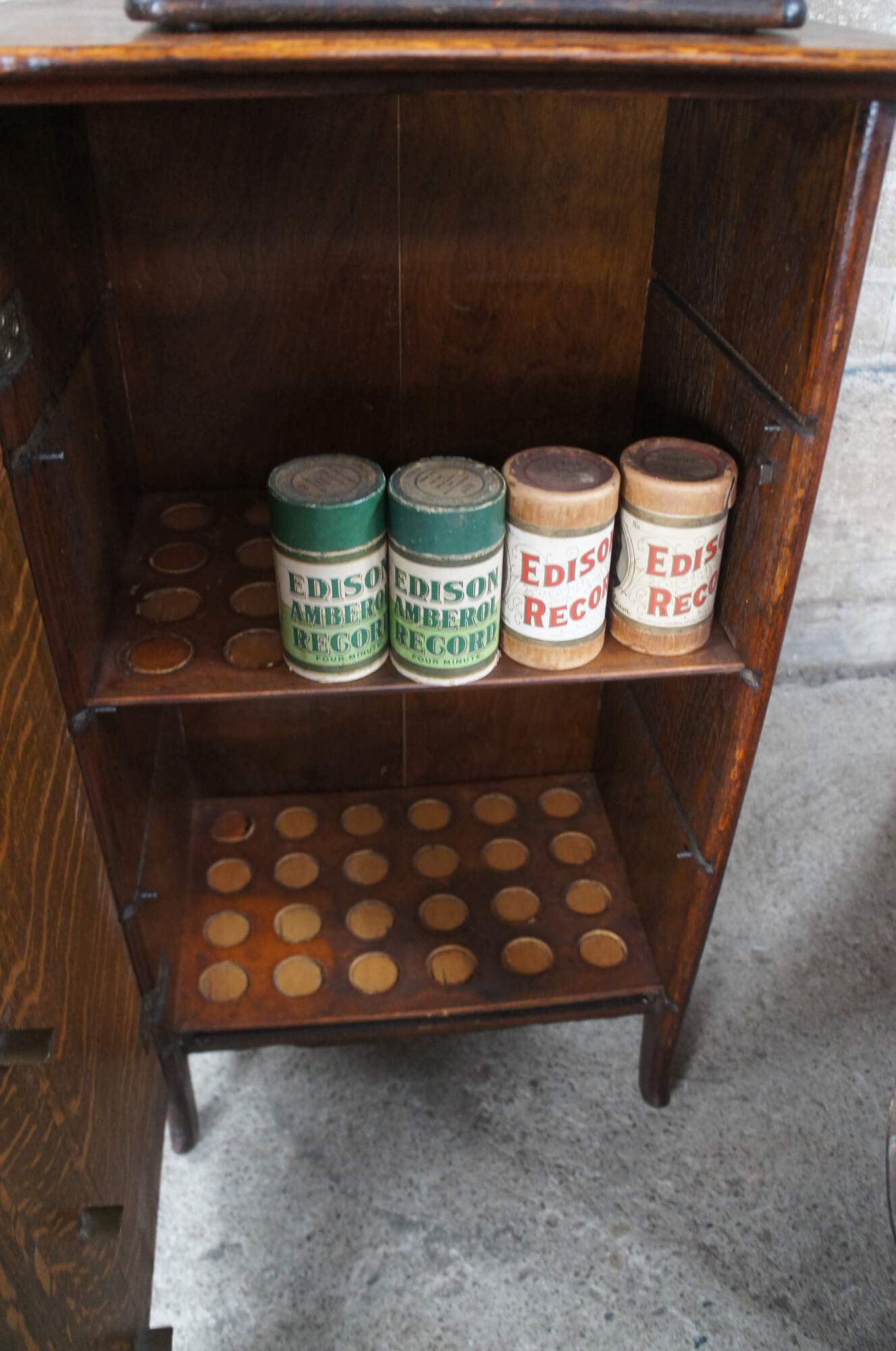 An exception Early Thomas Edison Model A Cylinder Phonograph with original horn, tube cabinet & 93 records. Phonograph box and cabinet are made from oak in Late Victorian manner with a few quartersawn boards. Horn is red with hand painted motifs. Cylinders come with original boxes for storage. Serial no 30819
