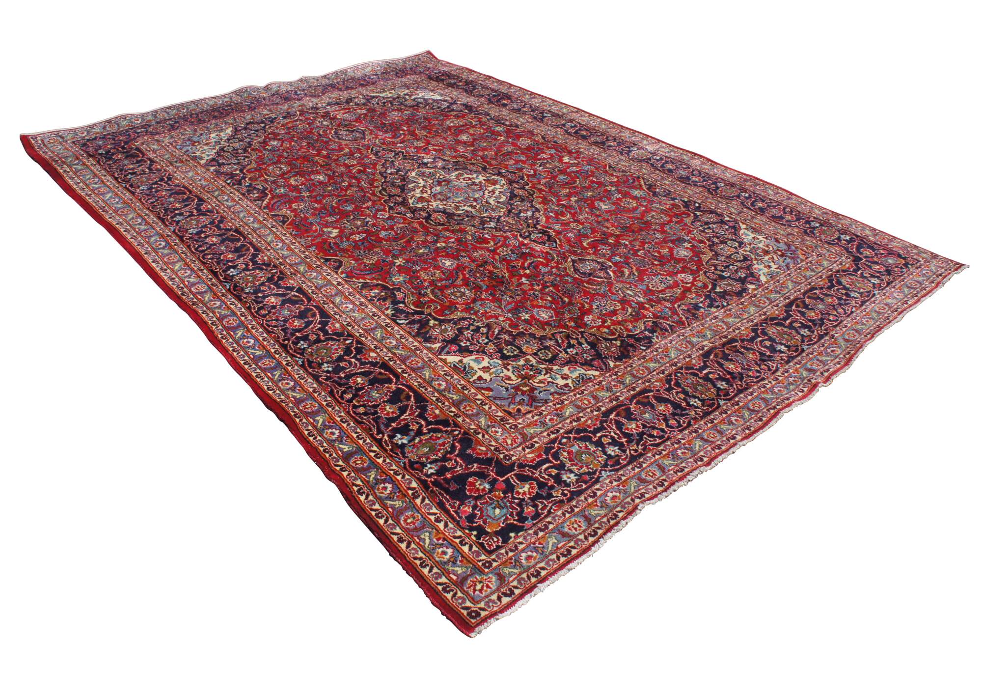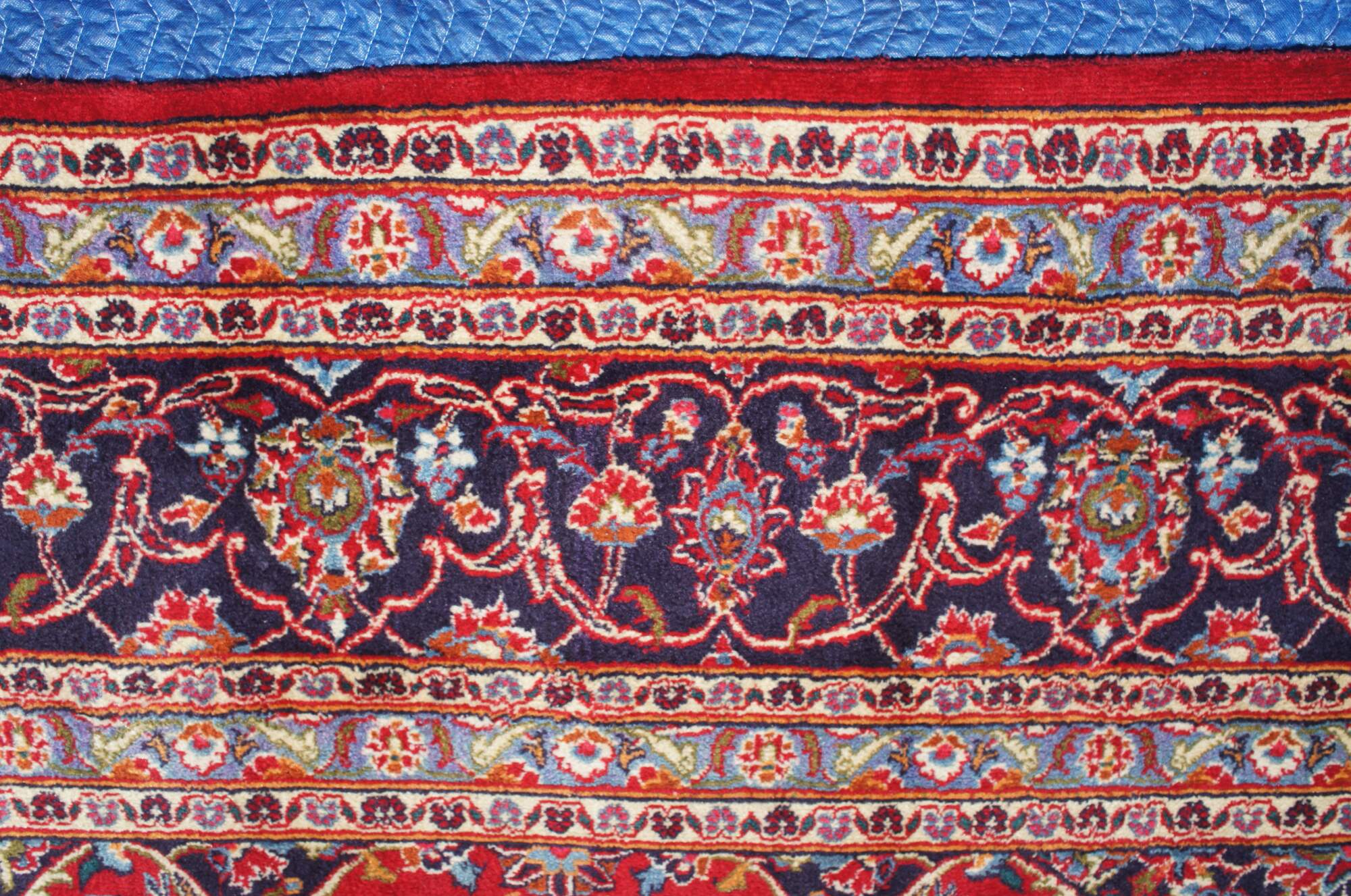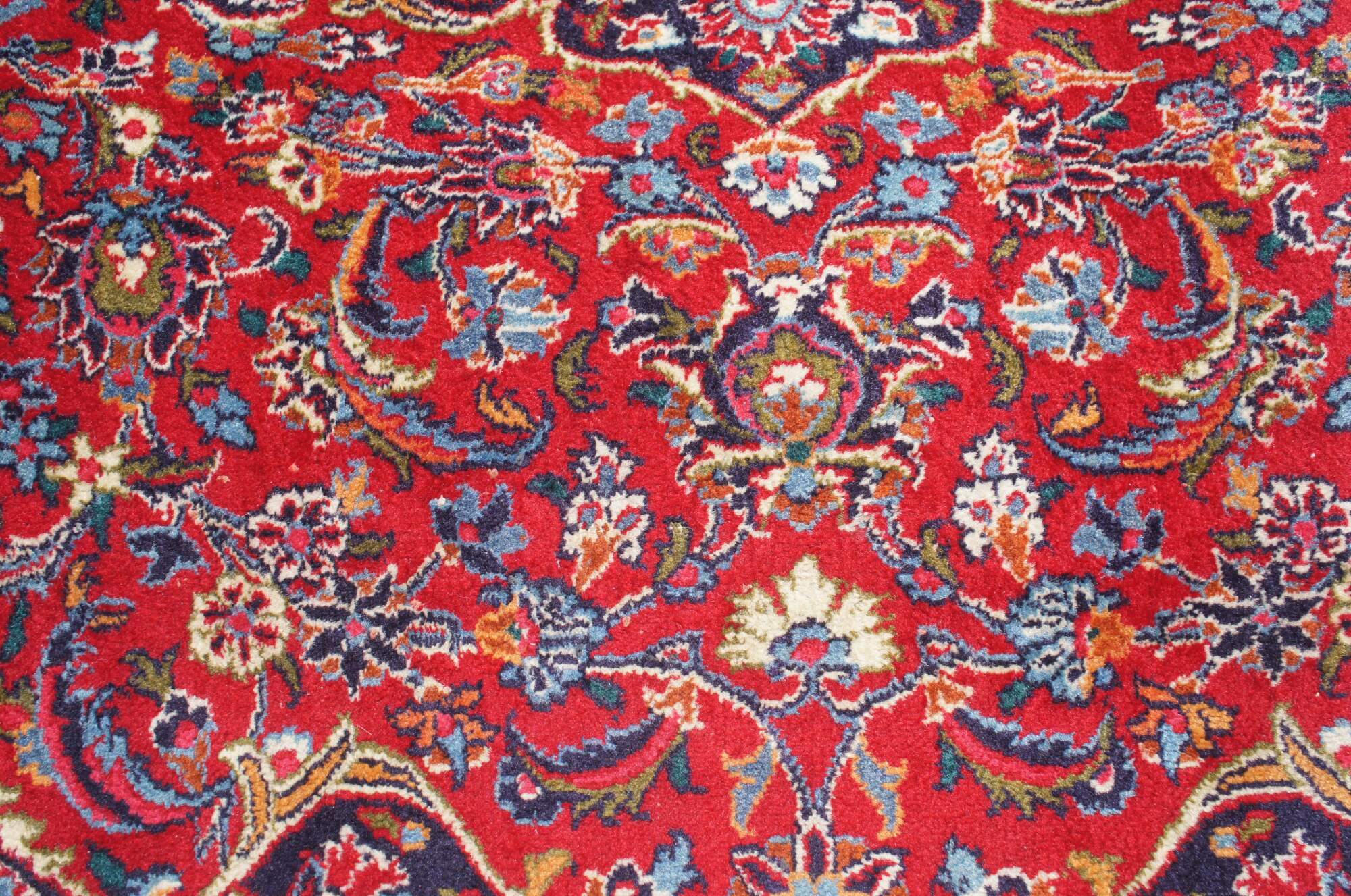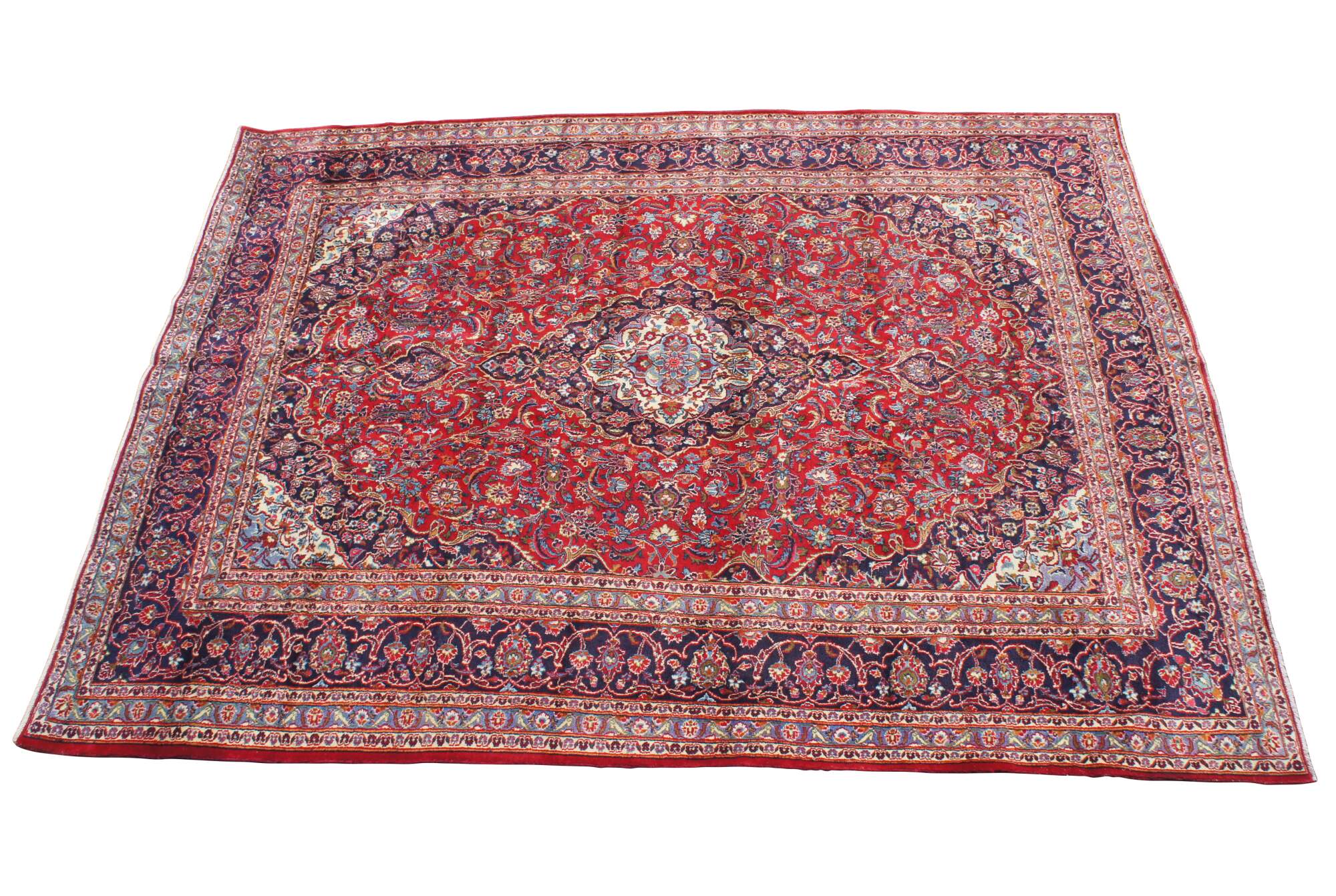 A vibrant mid 20th century hand knotted wool area rug. Made from 100% wool with a field of red and blue with interlaced floral deisgn. 121-144 knots per square inch