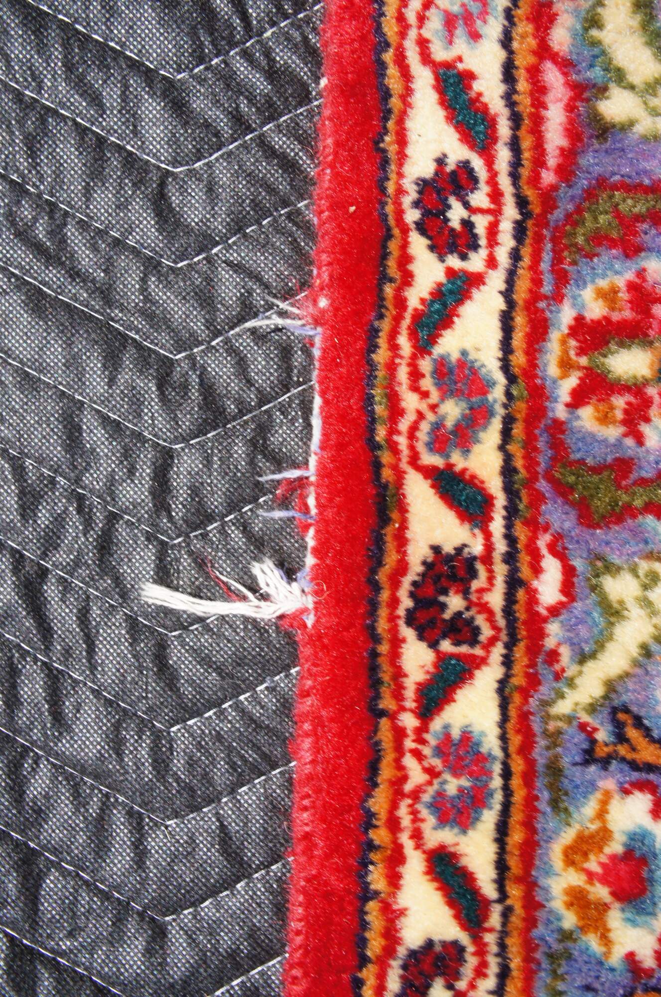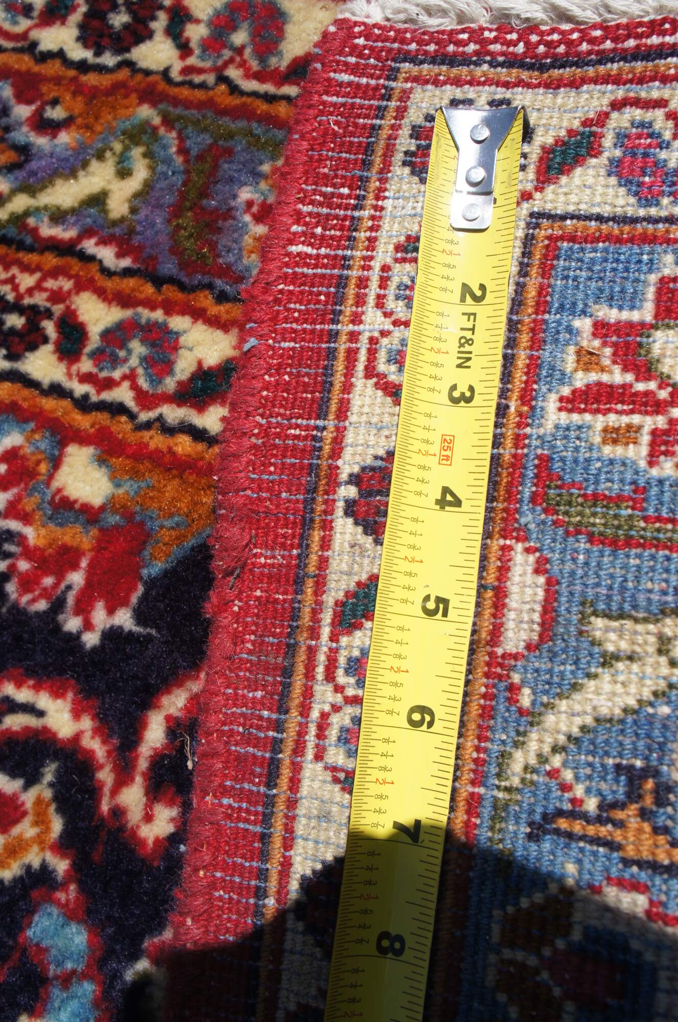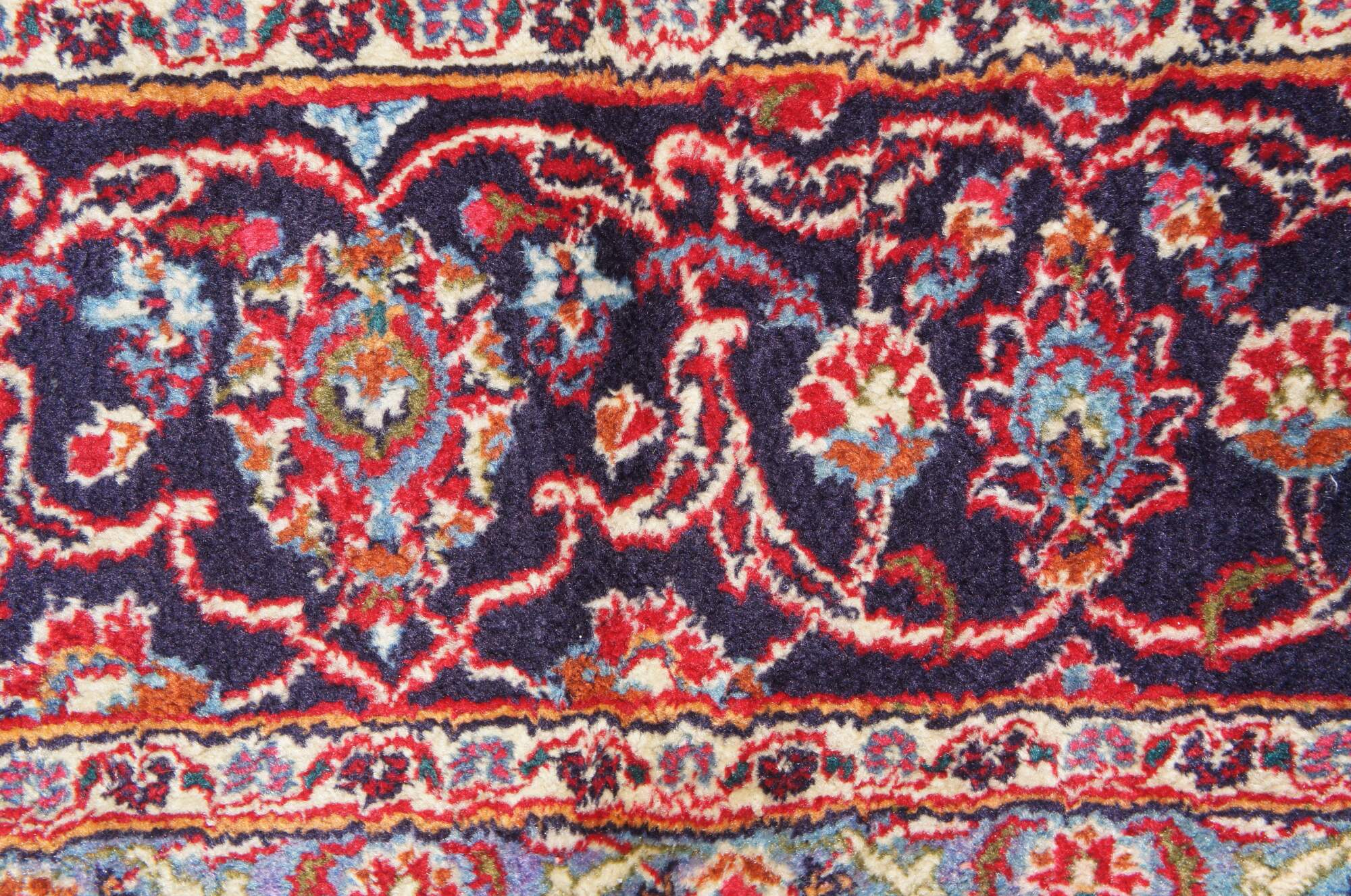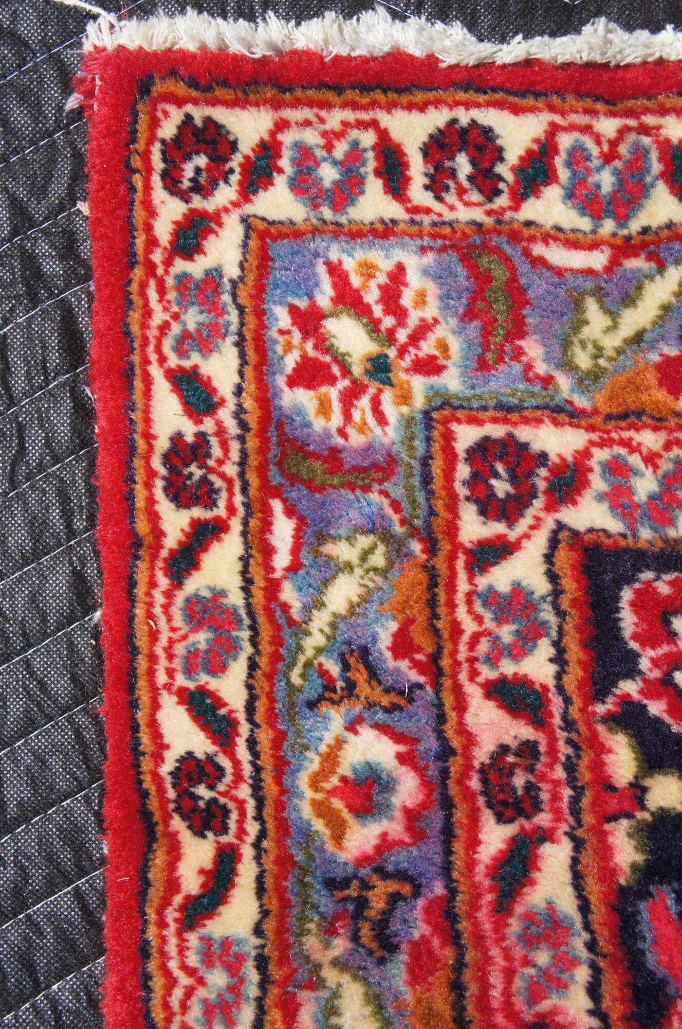 A vibrant mid 20th century hand knotted wool area rug. Made from 100% wool with a field of red and blue with interlaced floral deisgn. 121-144 knots per square inch