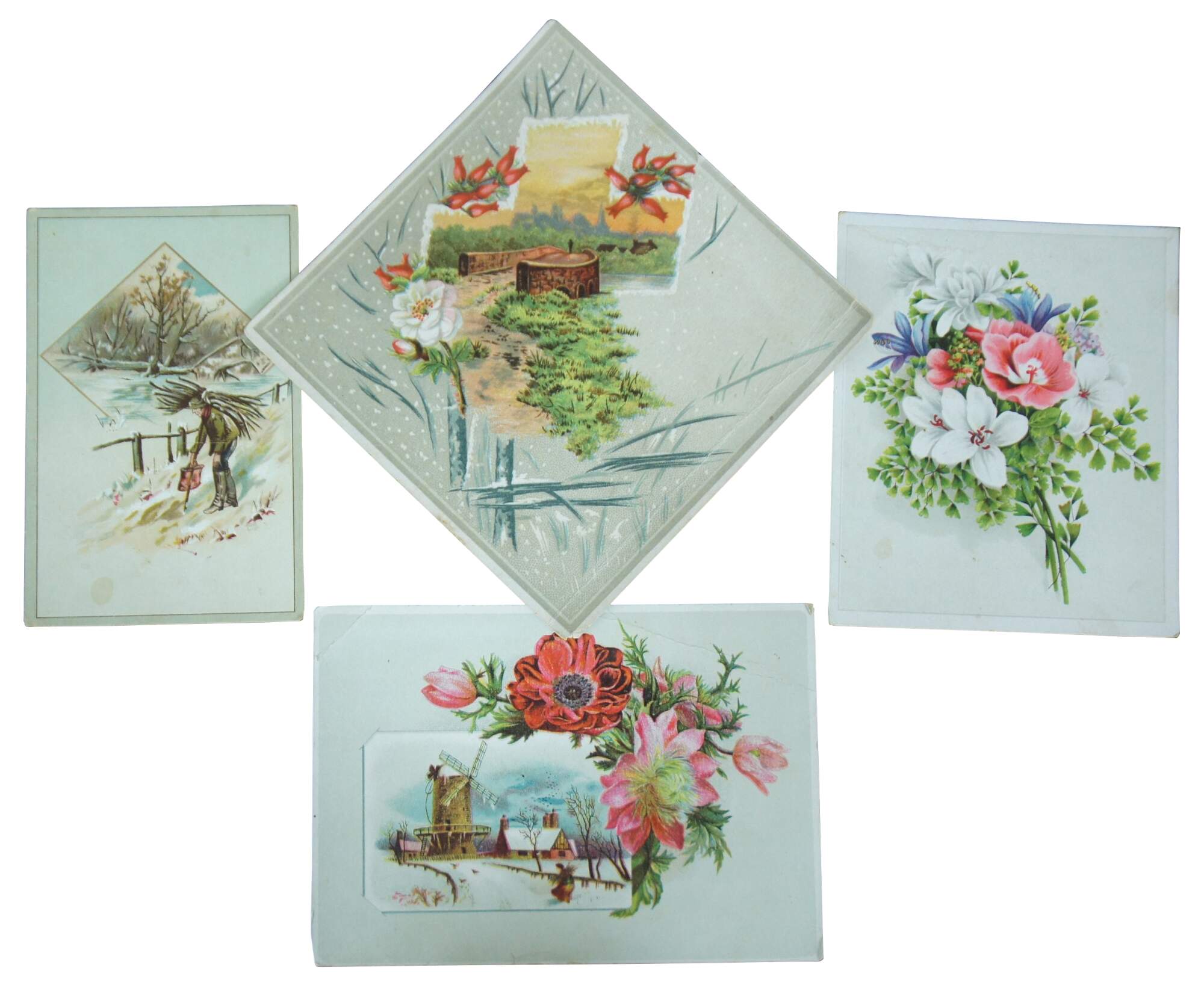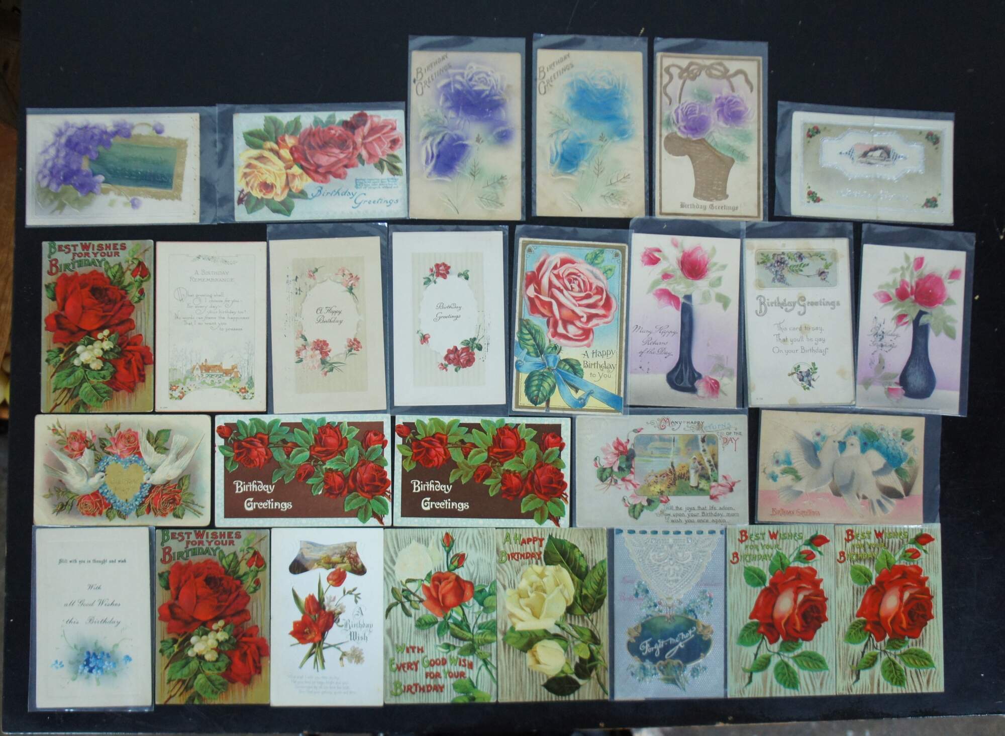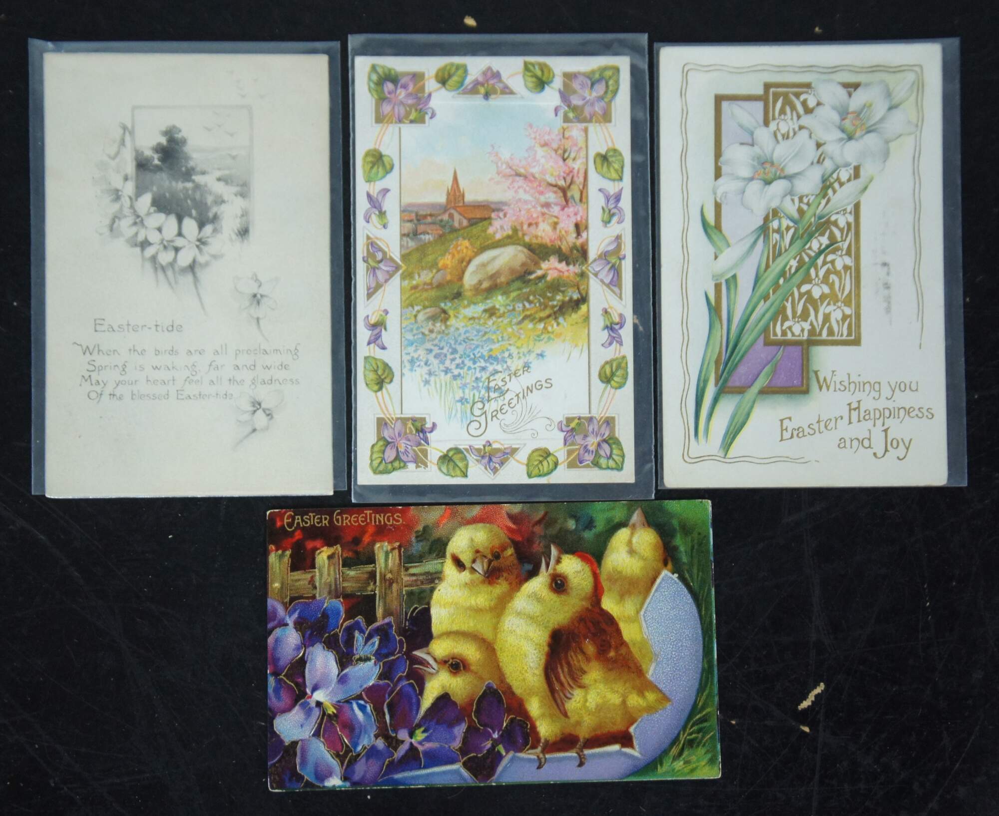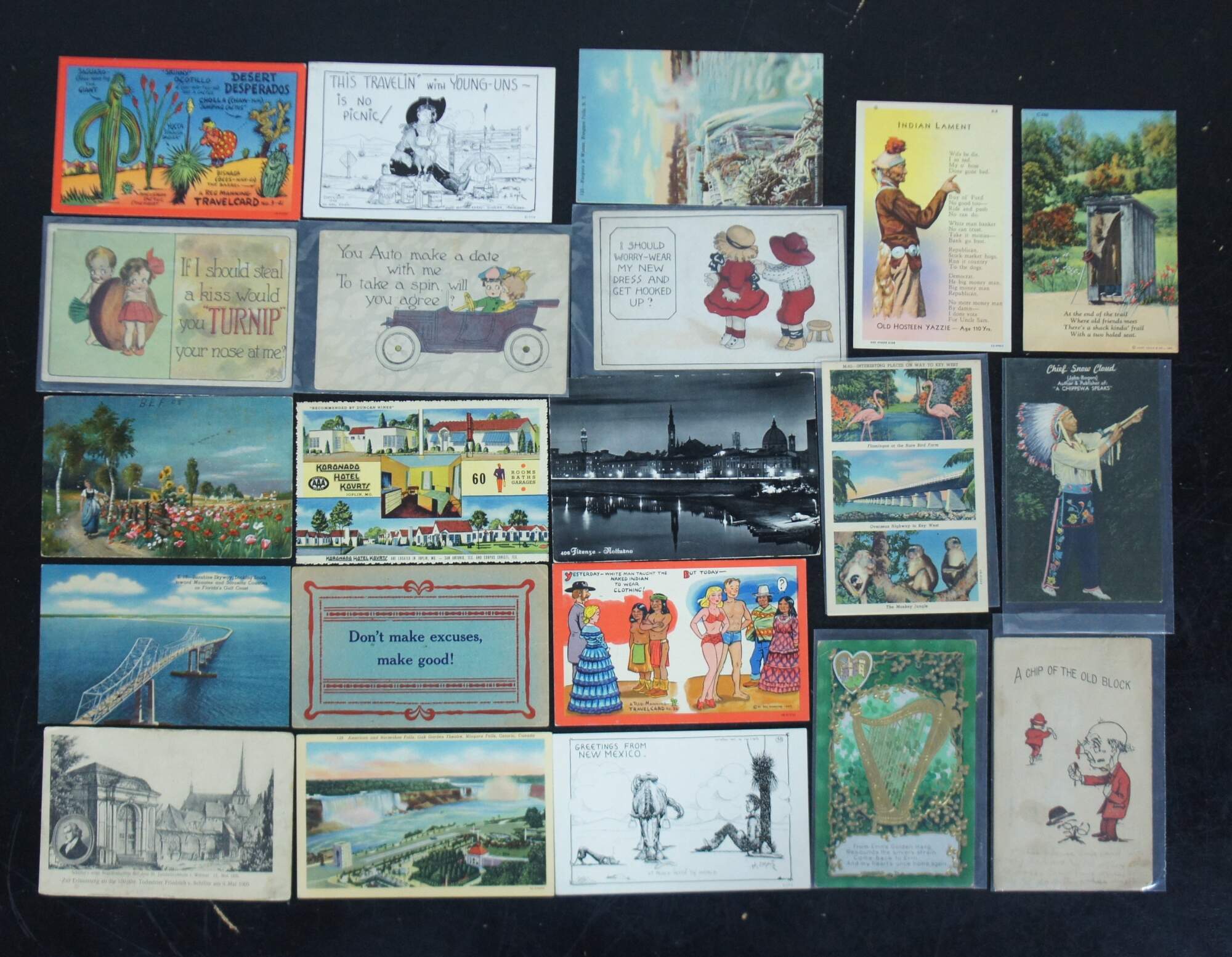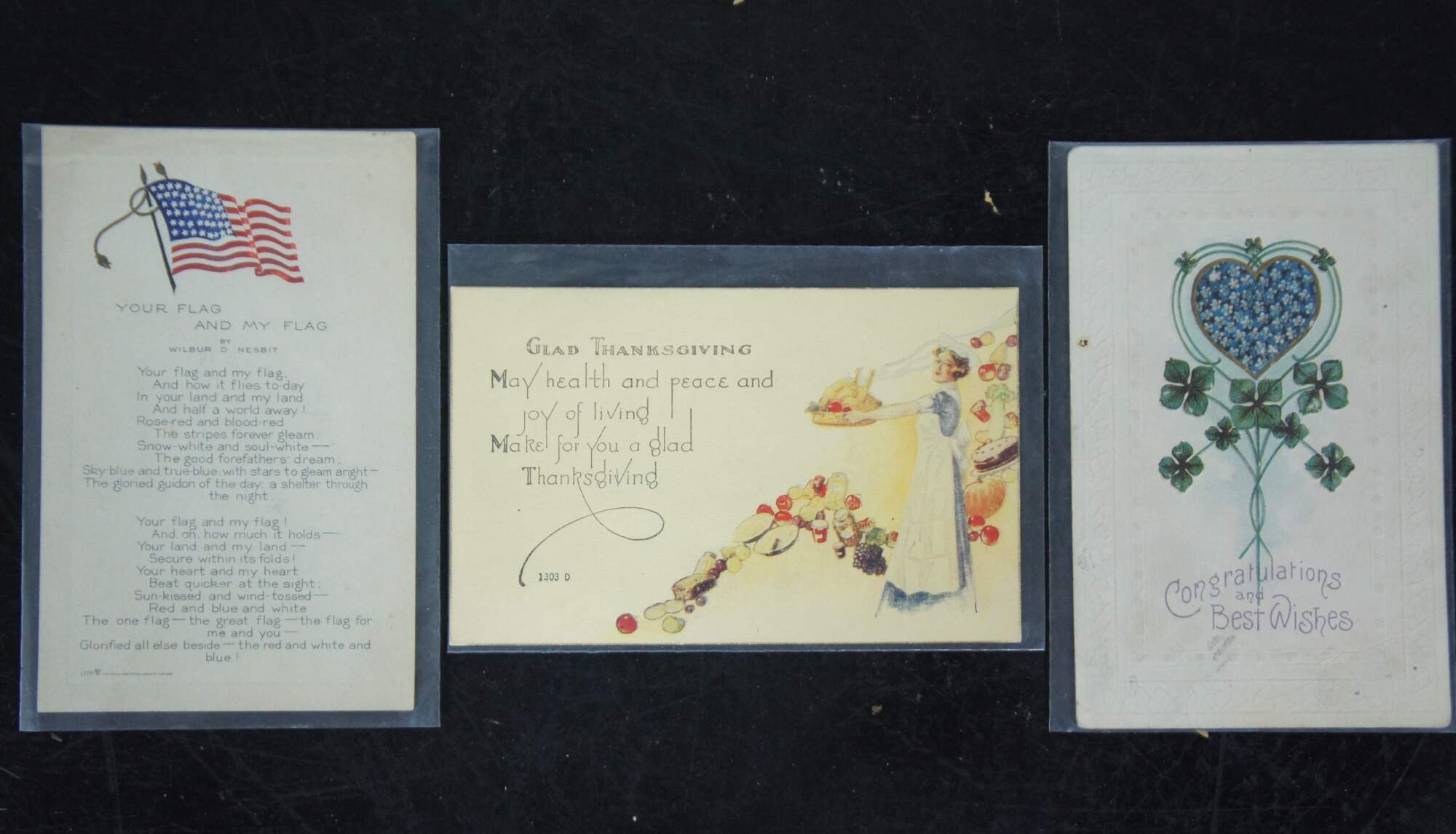 Lot of 138 vintage and antique postcards for a variety of holiday greetings and travel locations, plus a handful of Lion Coffee print advertisements.