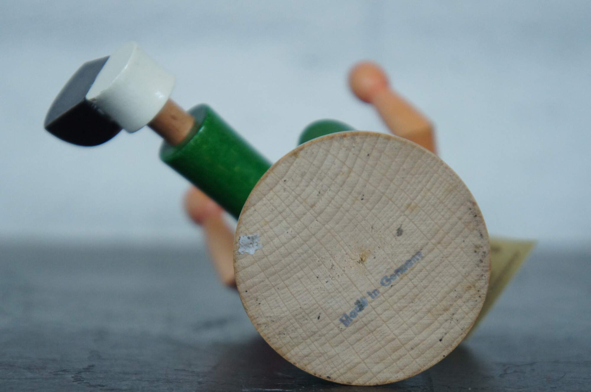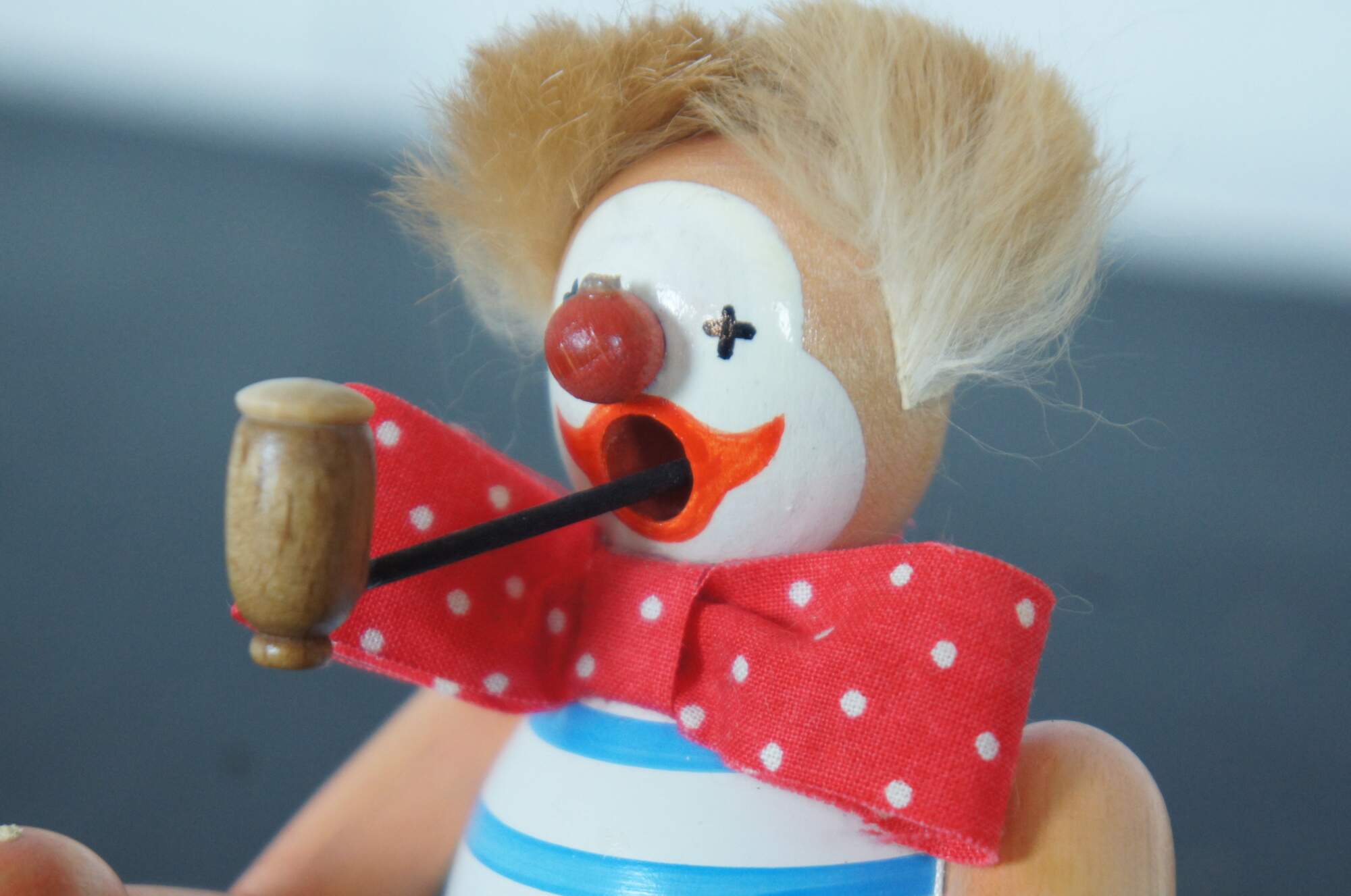 Vintage German painted wood clown incense smoker / burner figurine, originally would have been “spinning” plates on sticks and balancing something on his nose. Opens to reveal brass edged compartment. Made in Seiffen Erzgebirge.