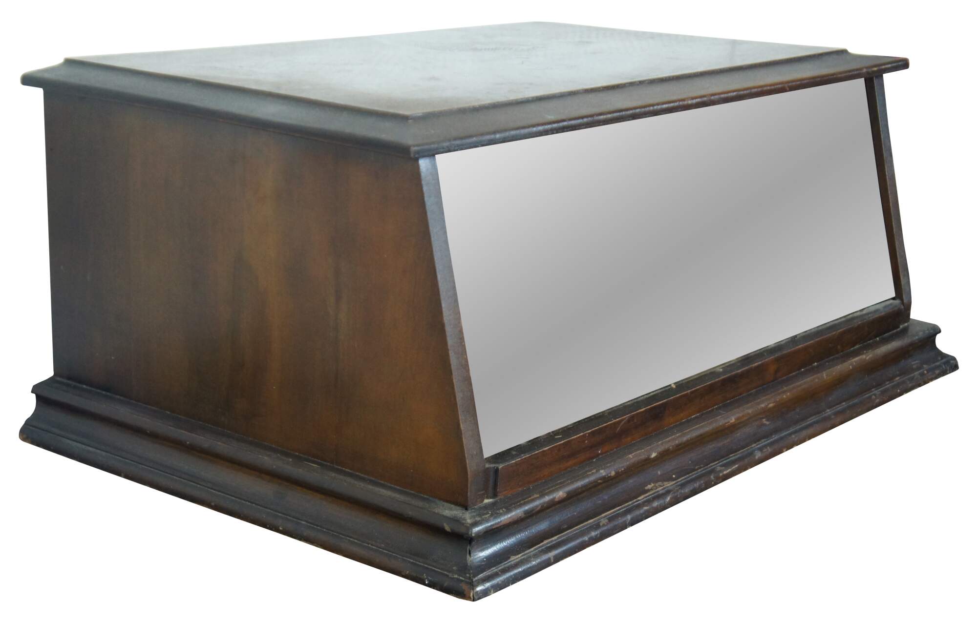 Antique early 20th century countertop display case with a solid walnut top and sides, angled glass front and non original interior lighting.