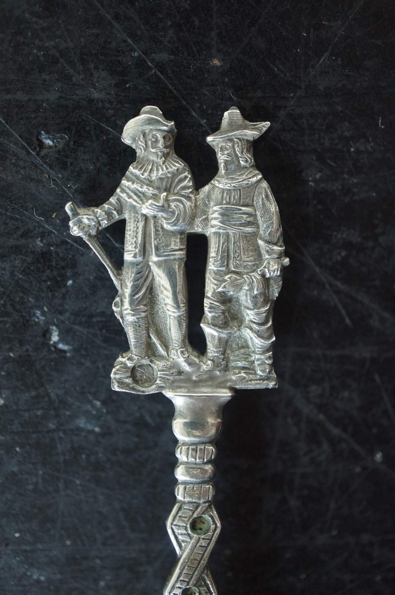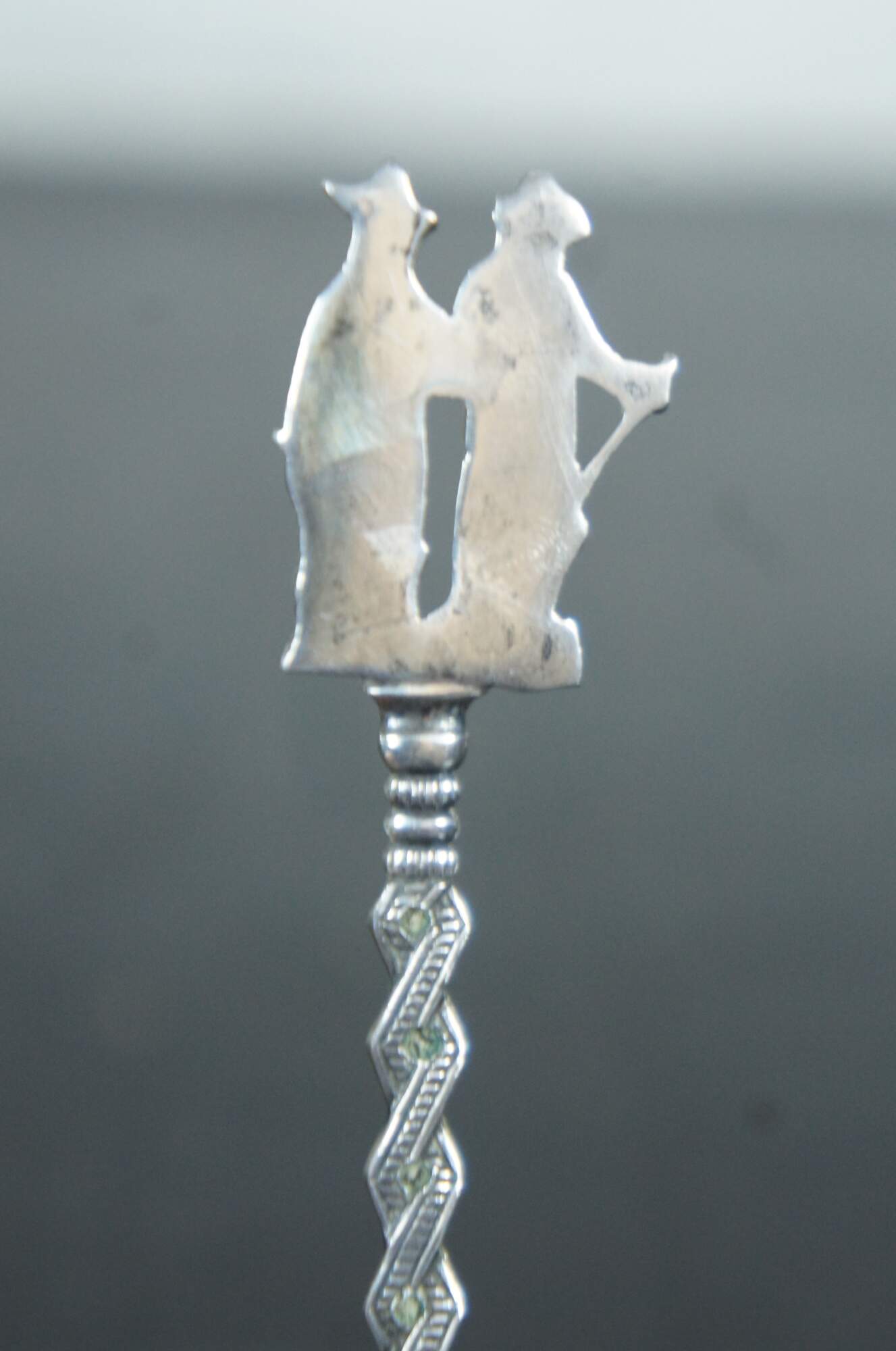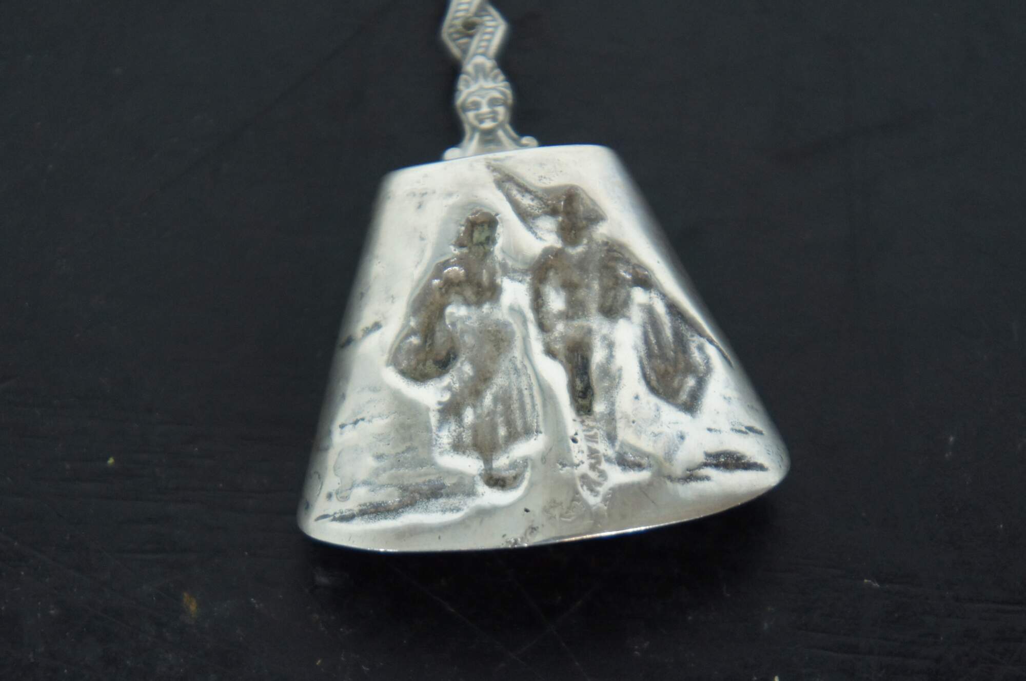 Antique 1850’s Dutch repousse 835 silver sugar shovel with a molded bowl showing a man and woman with a fishing net and basket, an interlocking zig zag handle and a topper in the shape of two noblemen talking. Bowl is stamped with the lion passant indicating second standard purity, topper stamped with the Minerva head duty mark, and handle stamped with date mark T (indicating manufacture in 1853).