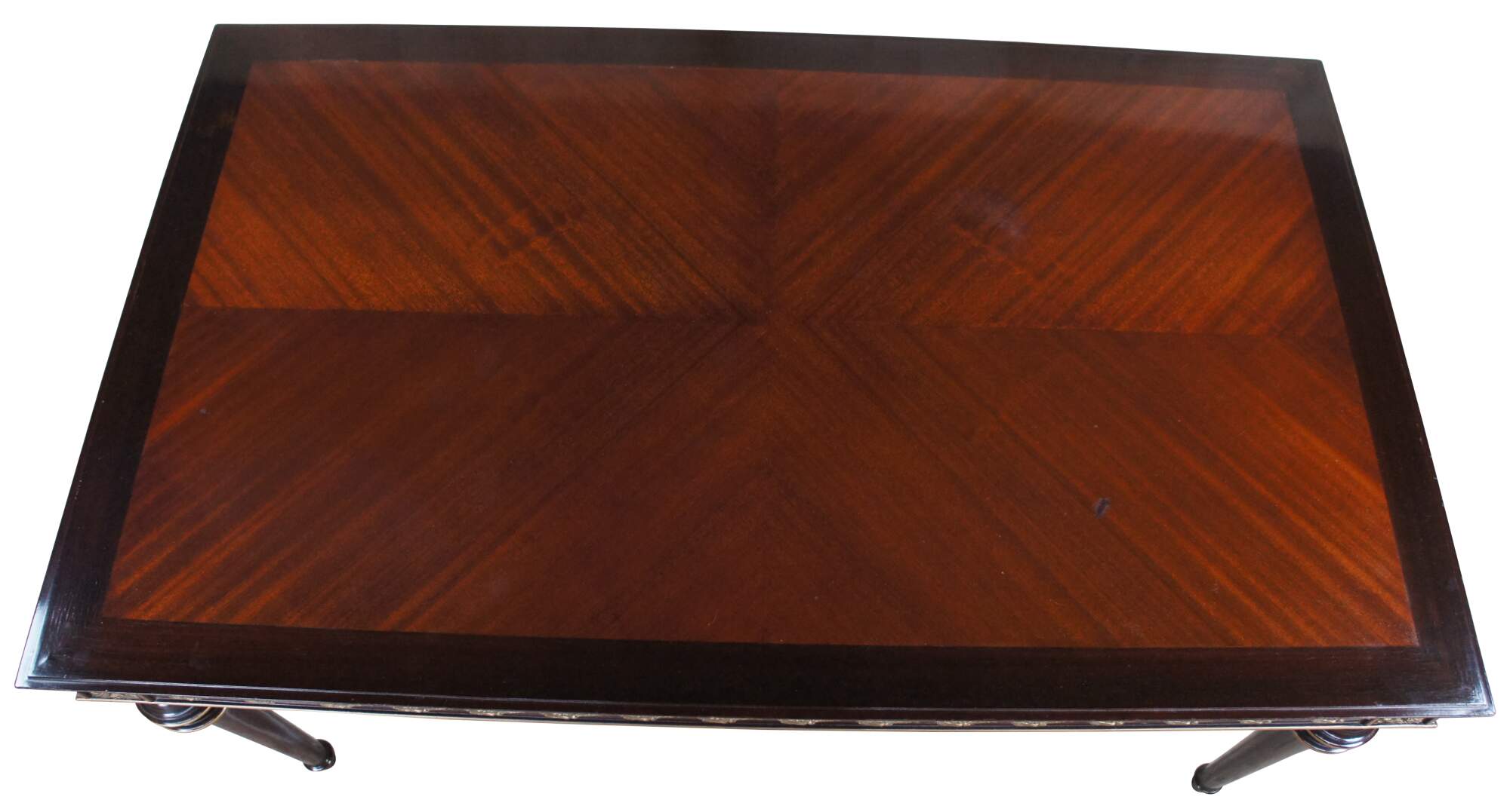 Vintage French Louis XVI inspired dining table or desk. Made in Cairo Egypt (Arabska Republika Egiptu) by Abbas, circa 1972. Made mahogany featuring an ornate frieze of brass ormolu medallions and gold trim over turned tapered legs.