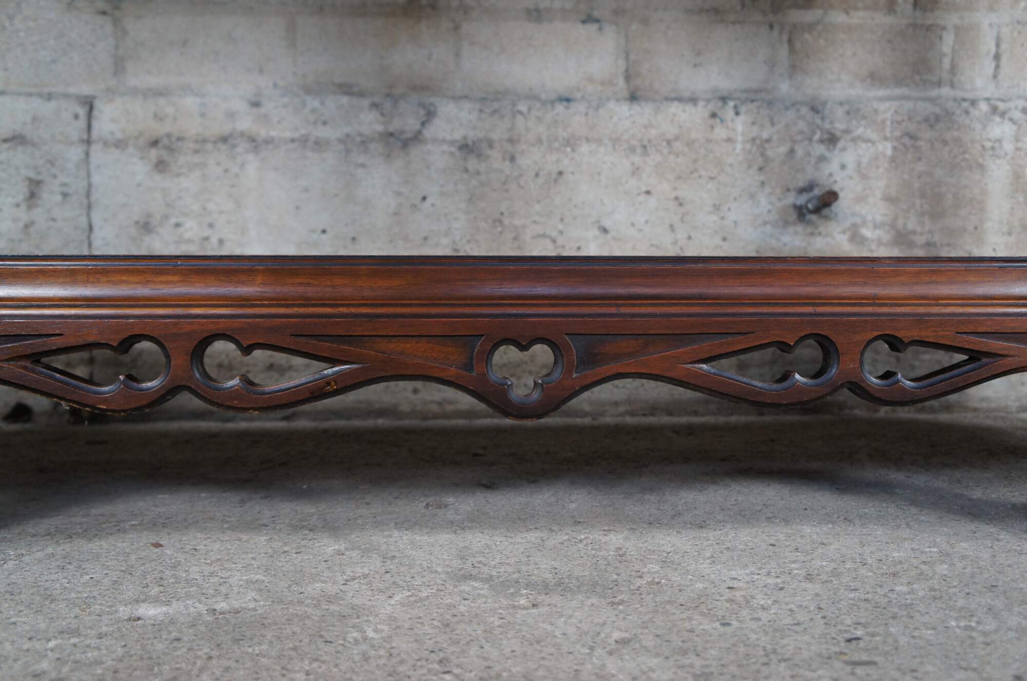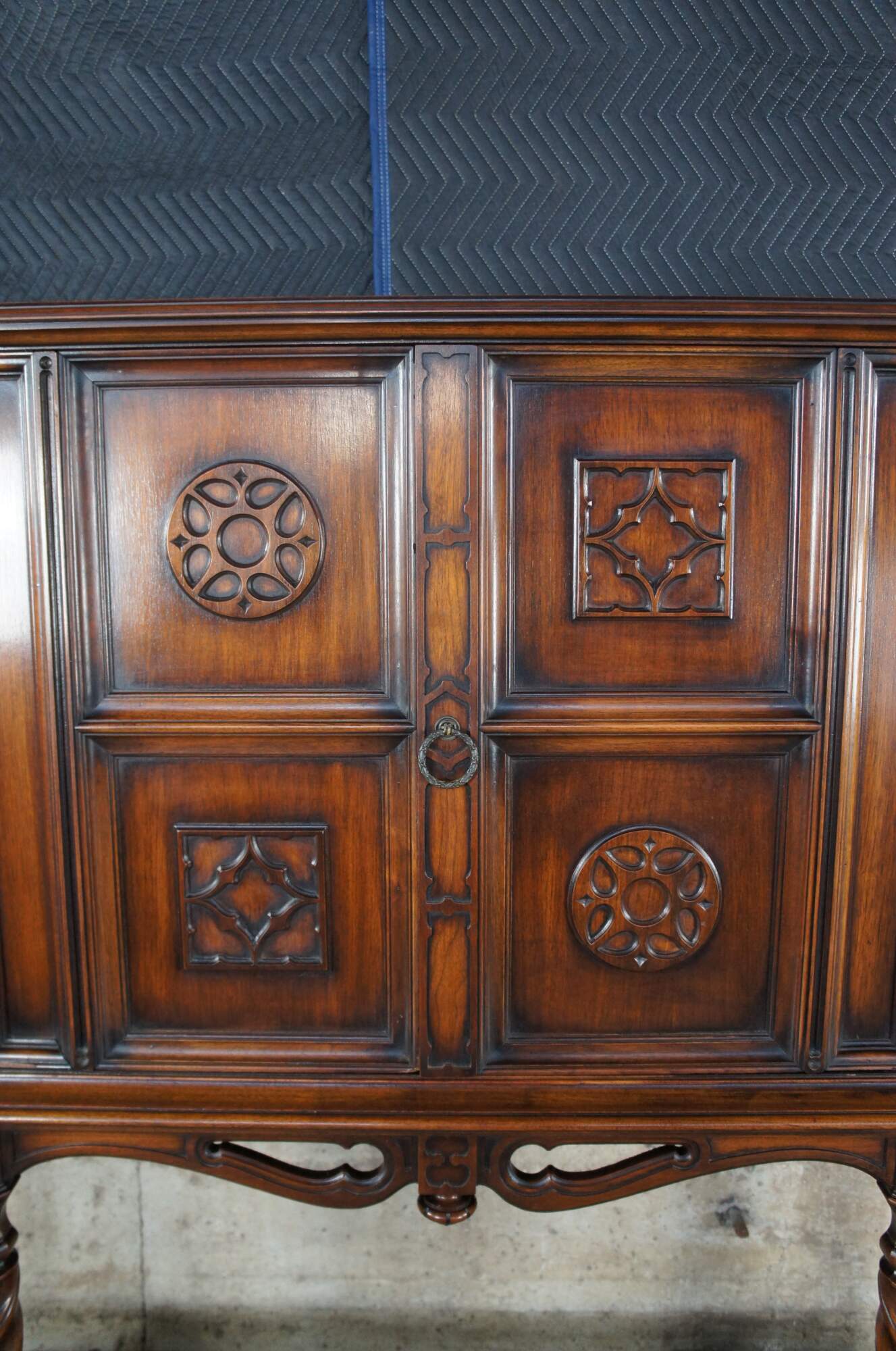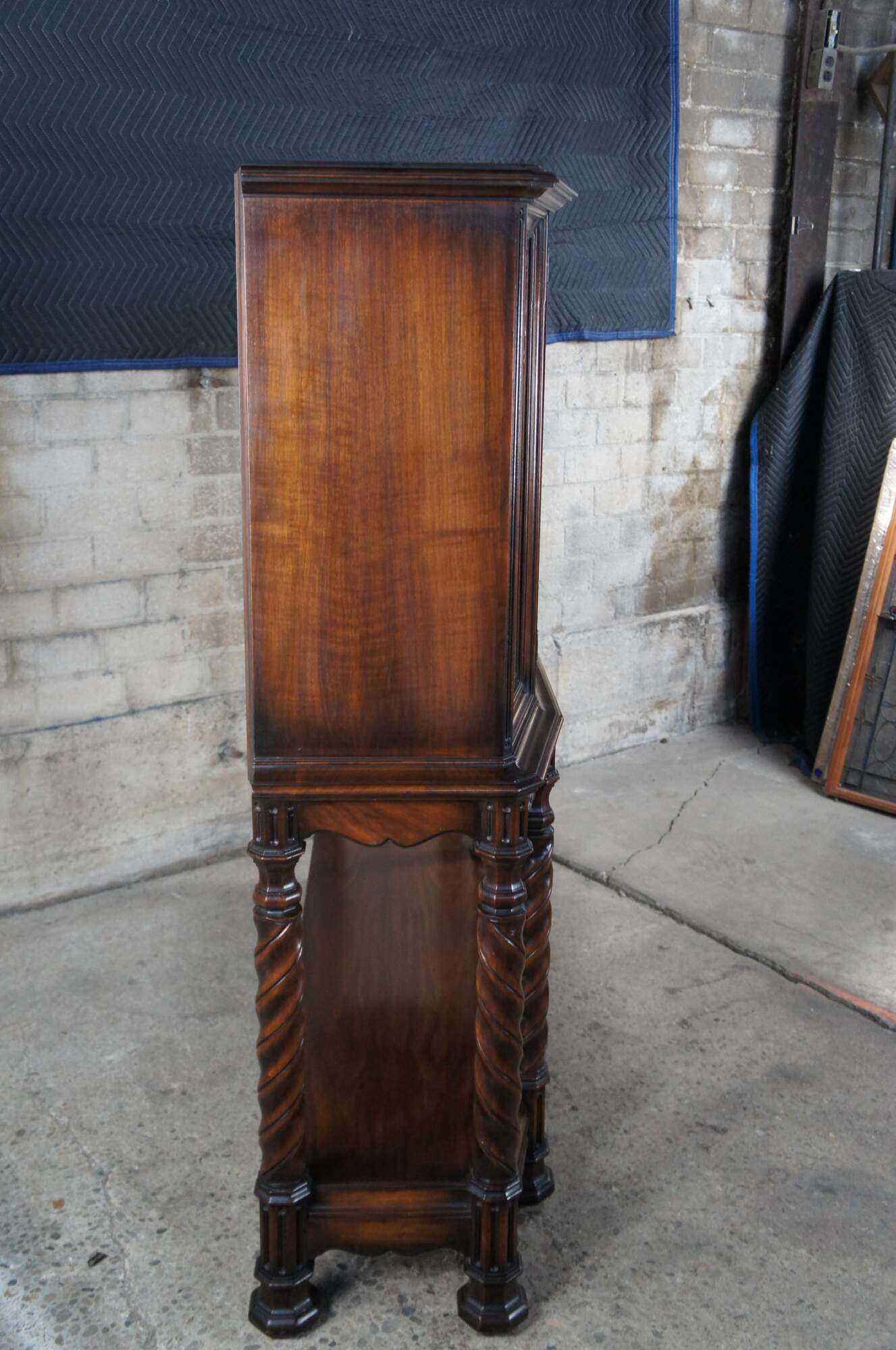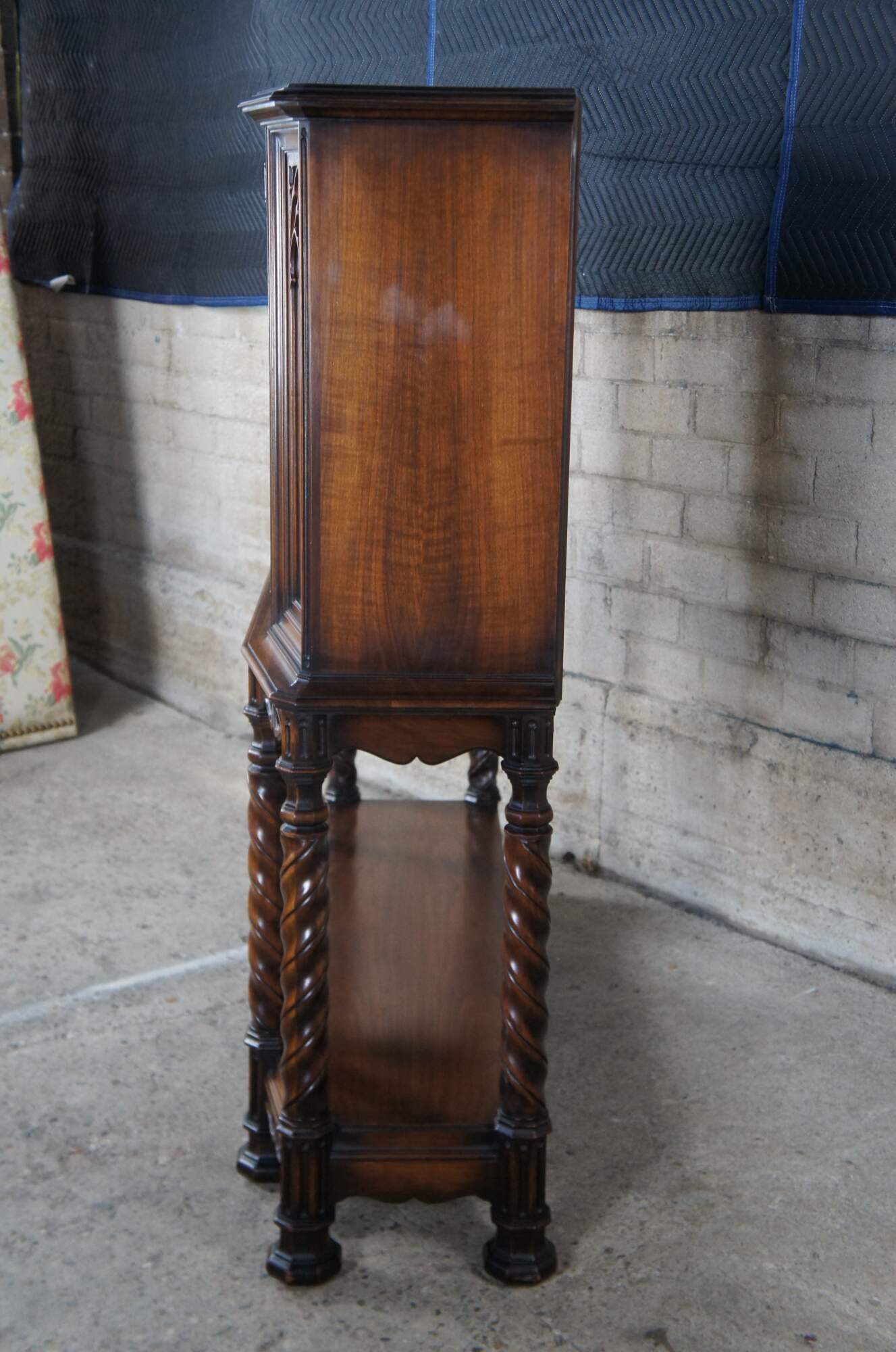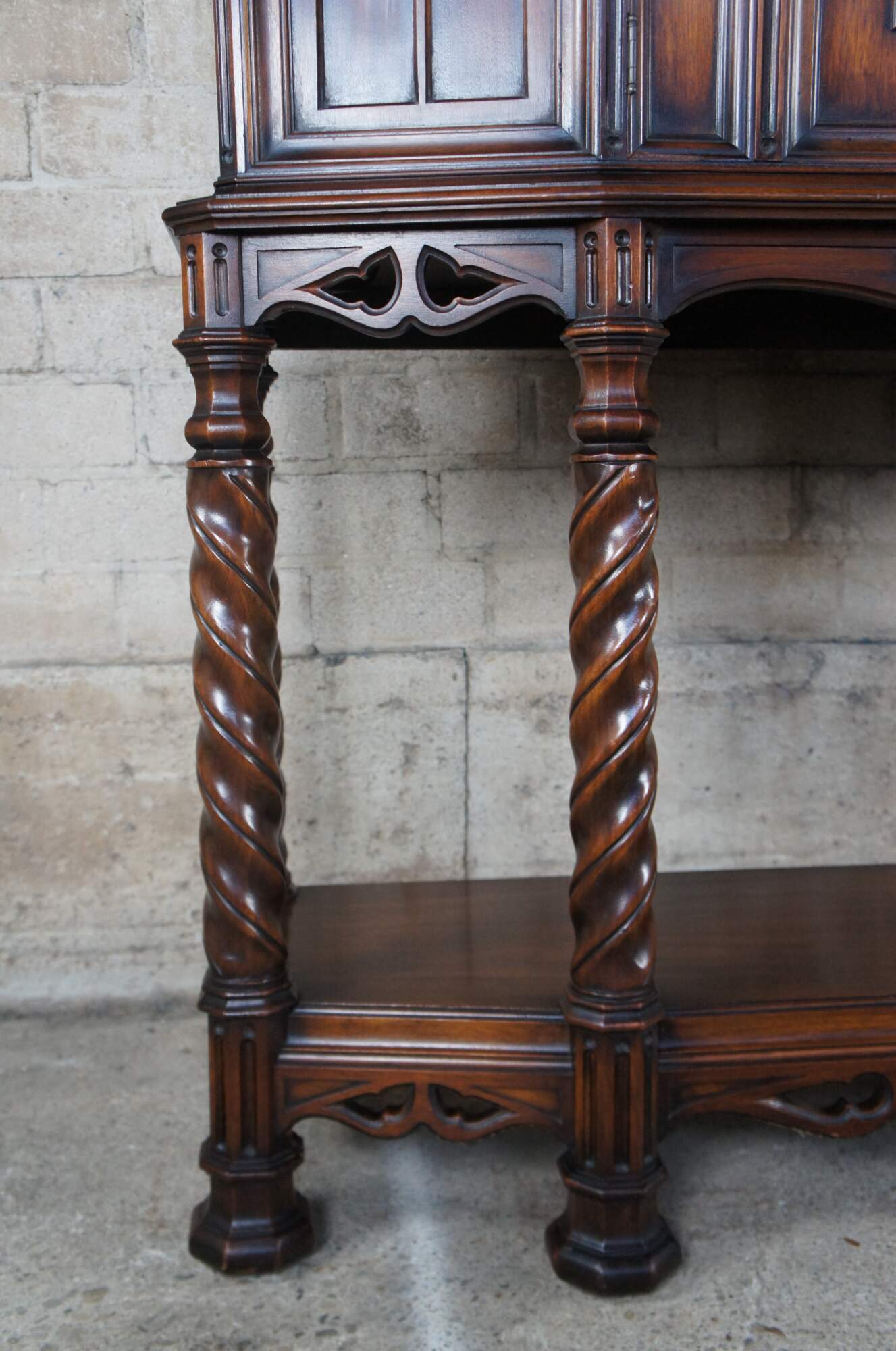 An exquisite early 20th century Rockford Furniture Co Gothic Revival livery cupboard, china hutch, buffet, console or drybar. Made of walnut featuring three long interior shelves with plate grooves concealed by carved doors, pierced aprons with drop finial, six barley twisted support legs and octagonal feet.