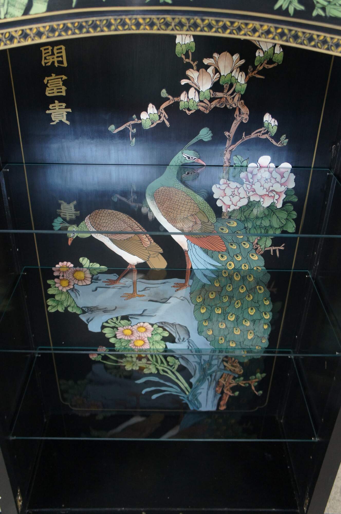 Mid century Oriental illuminating curio display cabinet featuring black lacquer finish with gold accents and two Peacocks nesting in a flowering tree with hummingbirds / birds.