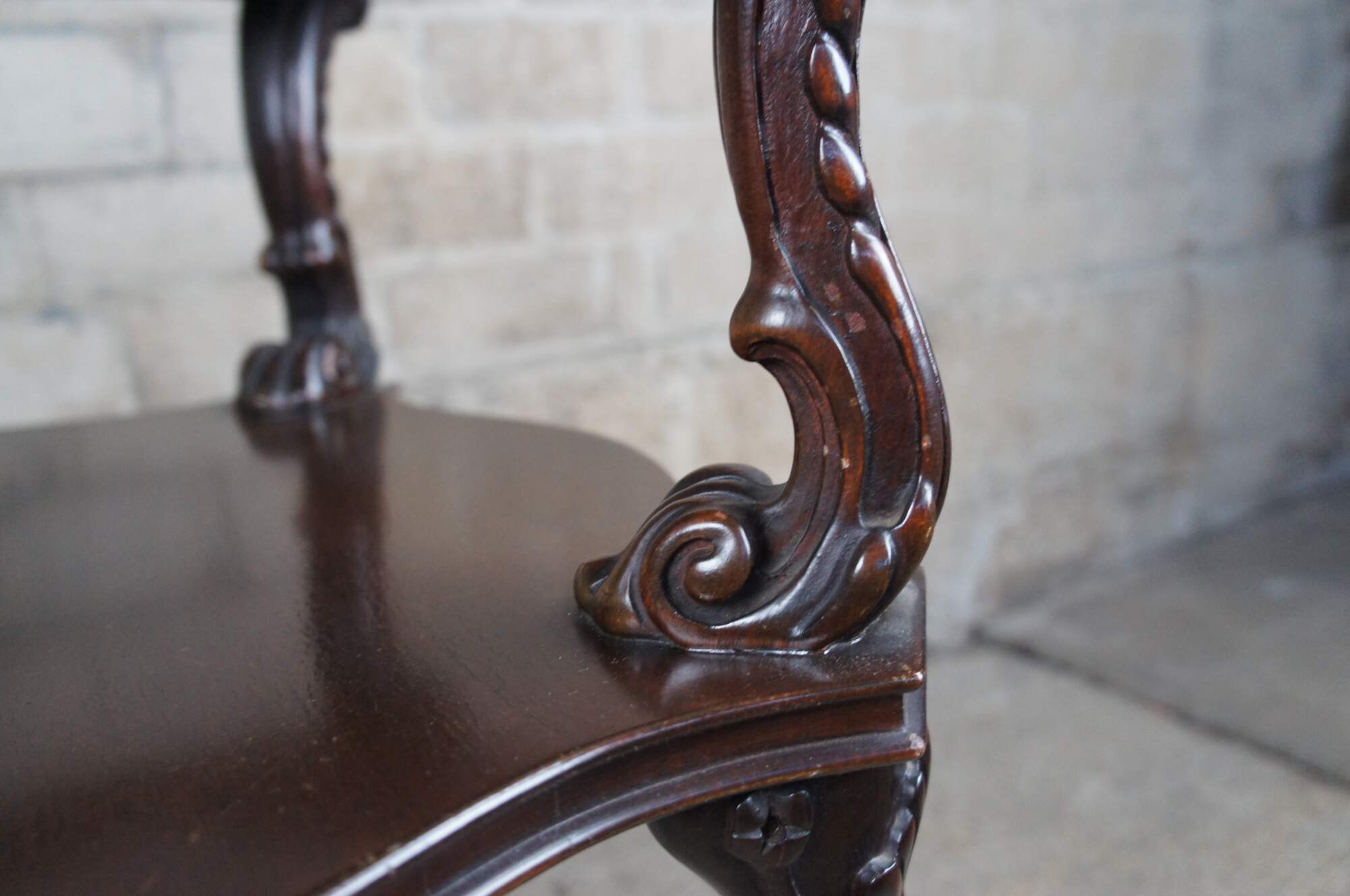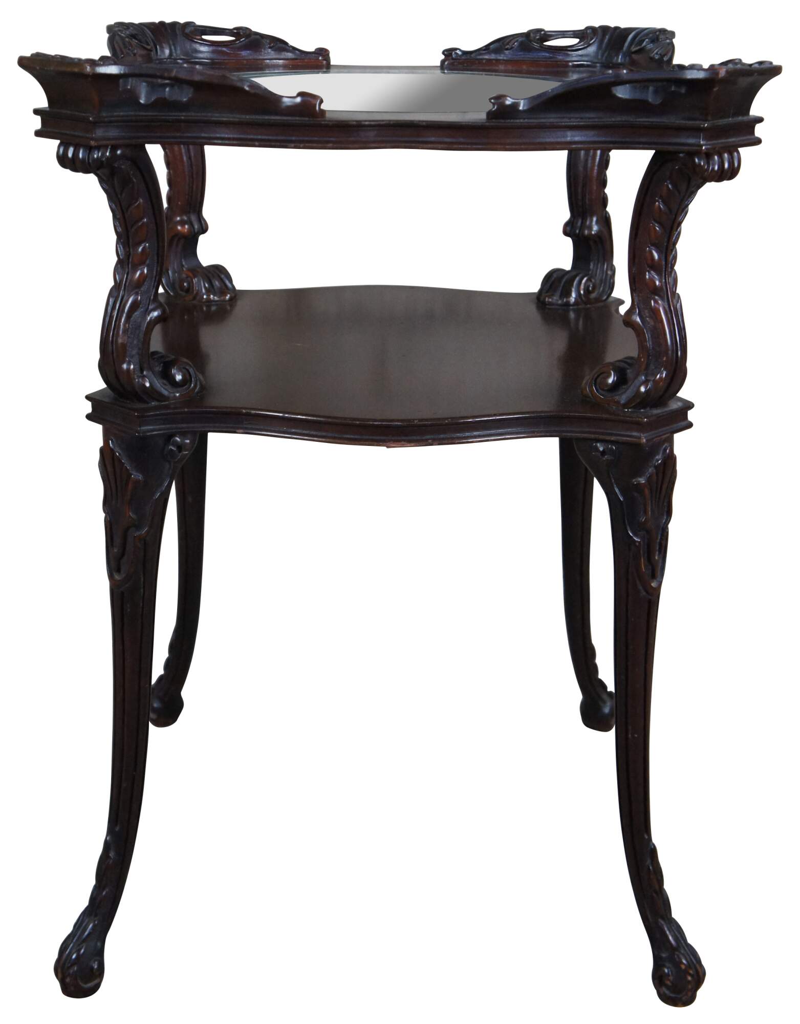 Adams Always Fine Furniture Louis XV style tiered end tables, circa 1930-40s. Beautifully designed with acanthus and scalloped details. Features an inset round glass top resting on a raised wooden top supported by ""s"" scrolls with raised and carved details along each corner. The circular glass inserts have a round frosted detail along the underside. Supported by long cabriole legs terminating into ""c"" scrolled feet. Made in America