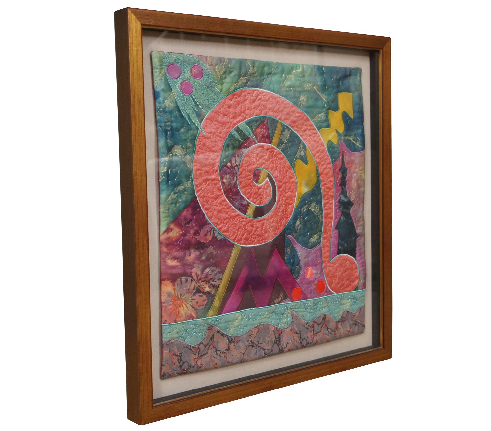 Vintage original hand stitched textile art by Ohio quilt artist Linda Fowler, showing a bold pink spiral over an abstract backdrop resembling a landscape in many colors, accented with metallic gold stitching.