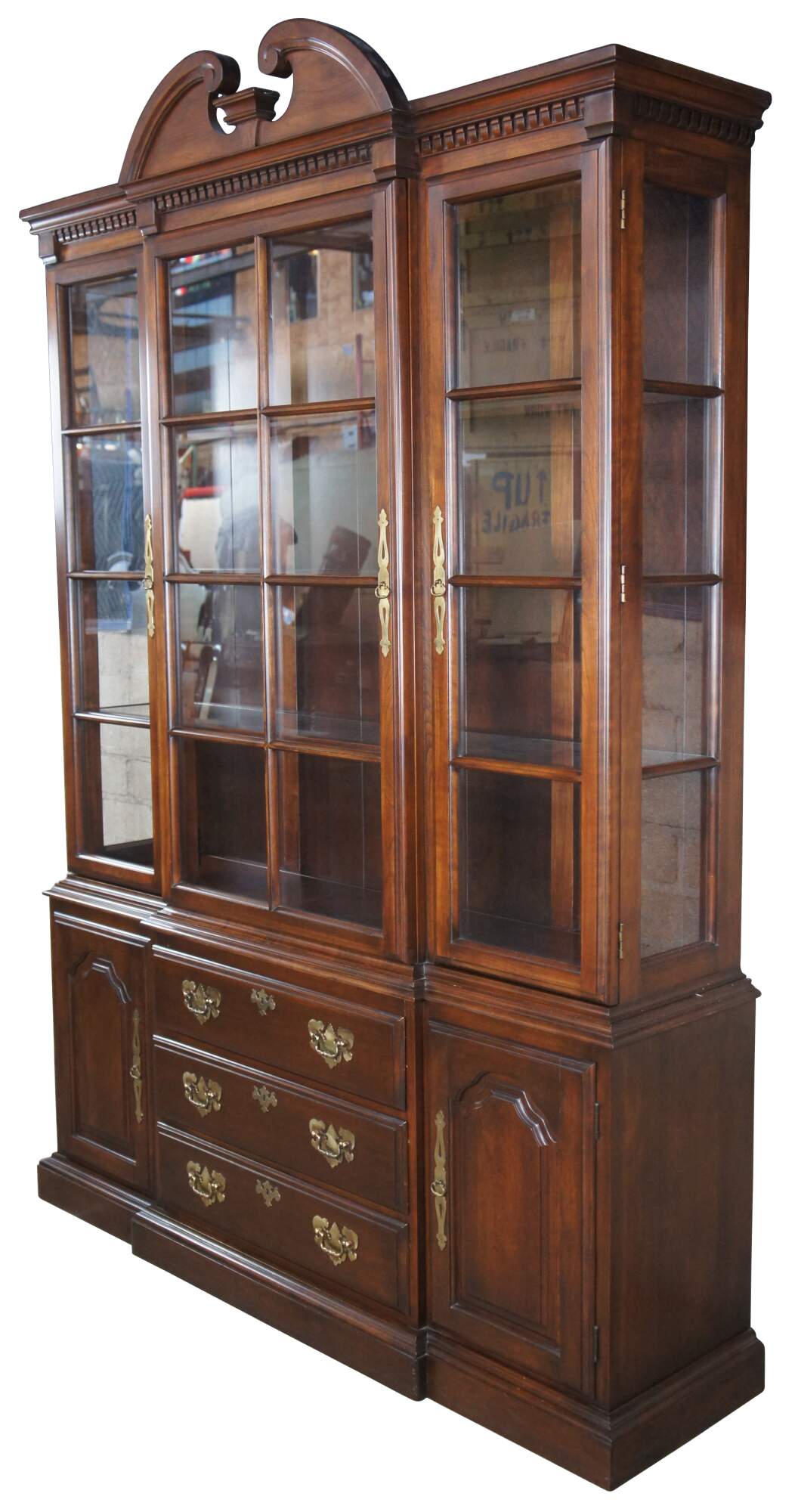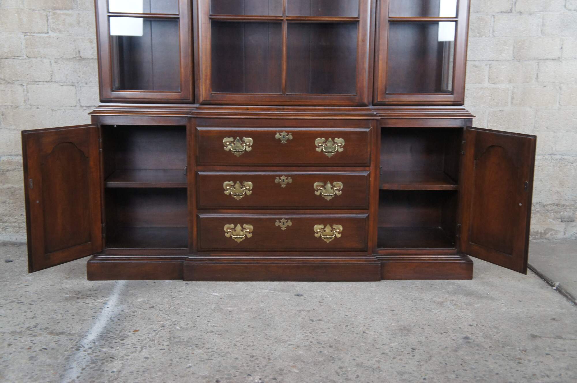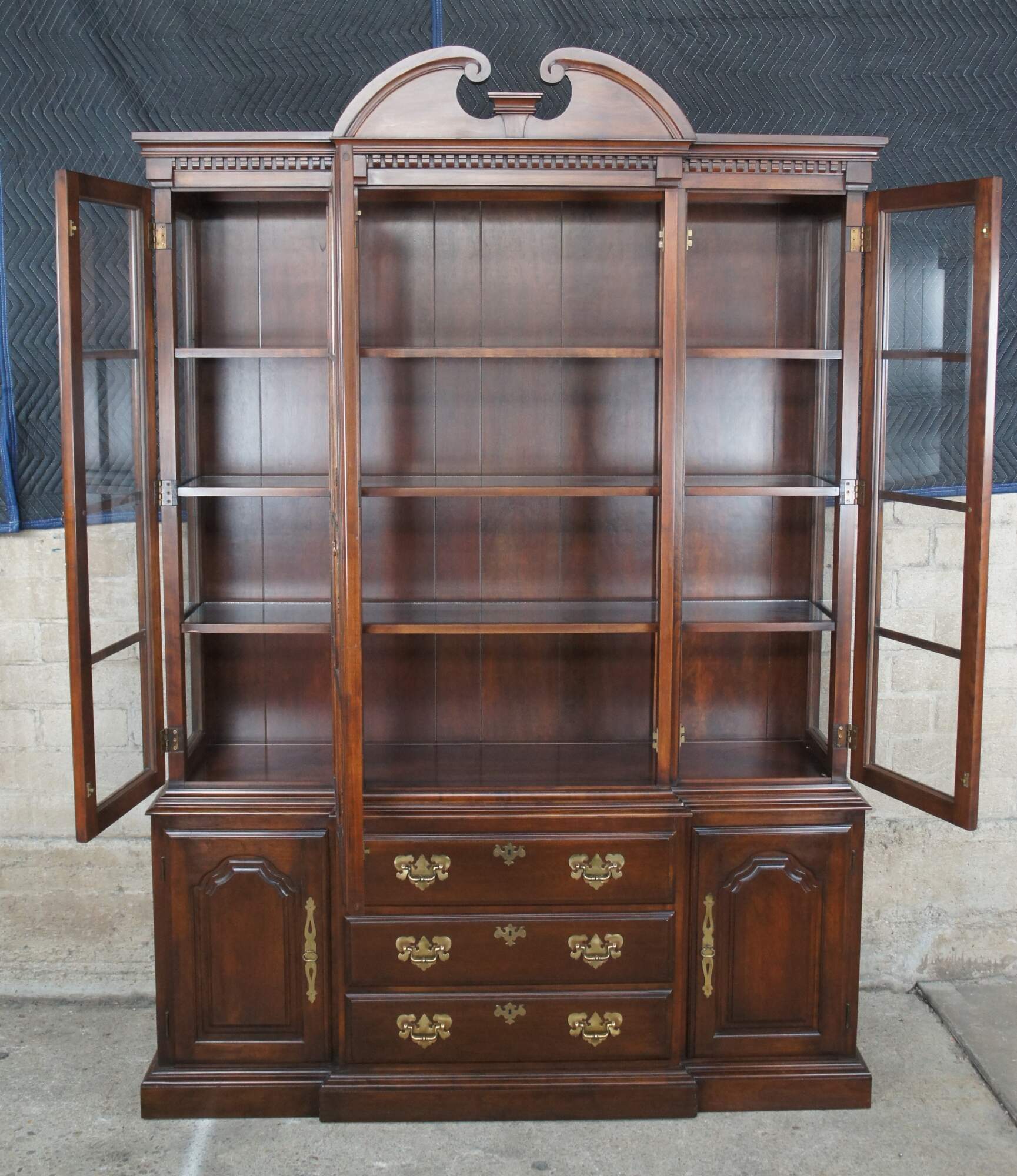 A lovely traditional Queen Anne Style breakfront by Harden Furniture. Made from cherry with a large upper display case featuring 3 glass shelves, a dentil carved molding and open pediment. Lower section is centered by three dovetailed drawers that are flanked by outer cabinets for china storage. Drawers and doors feature solid brass hardware.