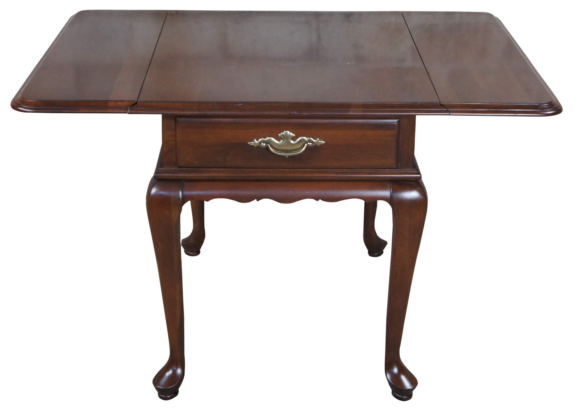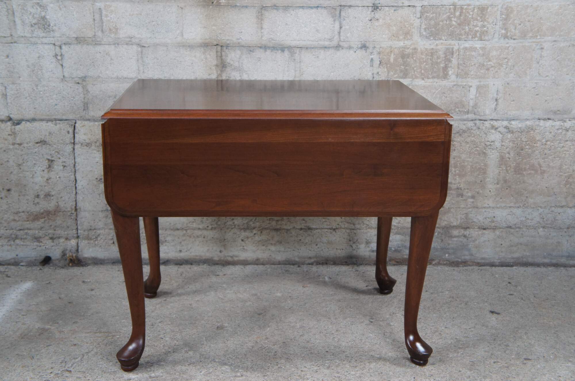 Vintage 1980s Ethan Allen Georgian Court collection drop leaf Pembroke table. Made from Cherry featuring Queen Ann styling with pad feet, federal hardware and one drawer. 11-8164, 18 1082.