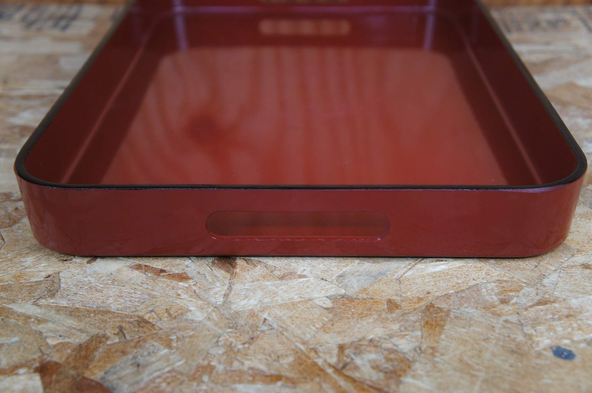 Mid century red lacquered chinoiserie tea / coffee serving tray featuring rectangular form with black accents and handles.