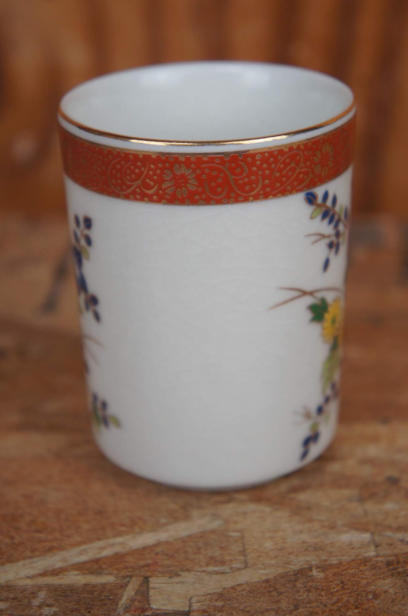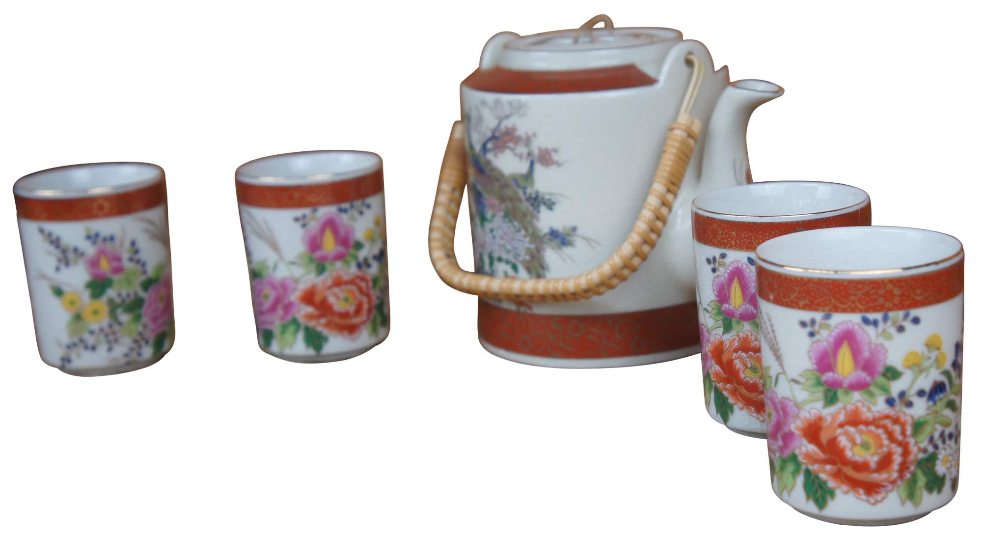 Vintage Satsuma ceramic tea set featuring a teapot with wicker handle and four cups decorated with floral bird peacock paradise theme .