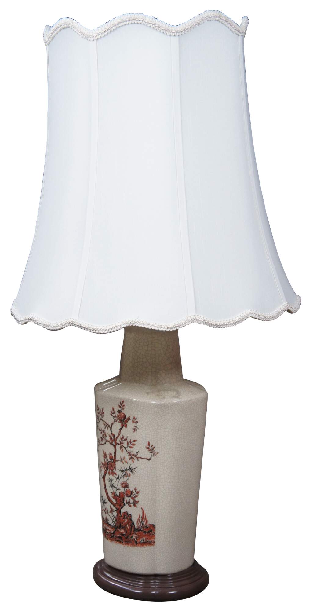 Vintage Chinese Chinoiserie porcelain crackle glaze vase or urn shaped lamp featuring a still life of a flowering tree and scalloped / serpentine tapered shade.