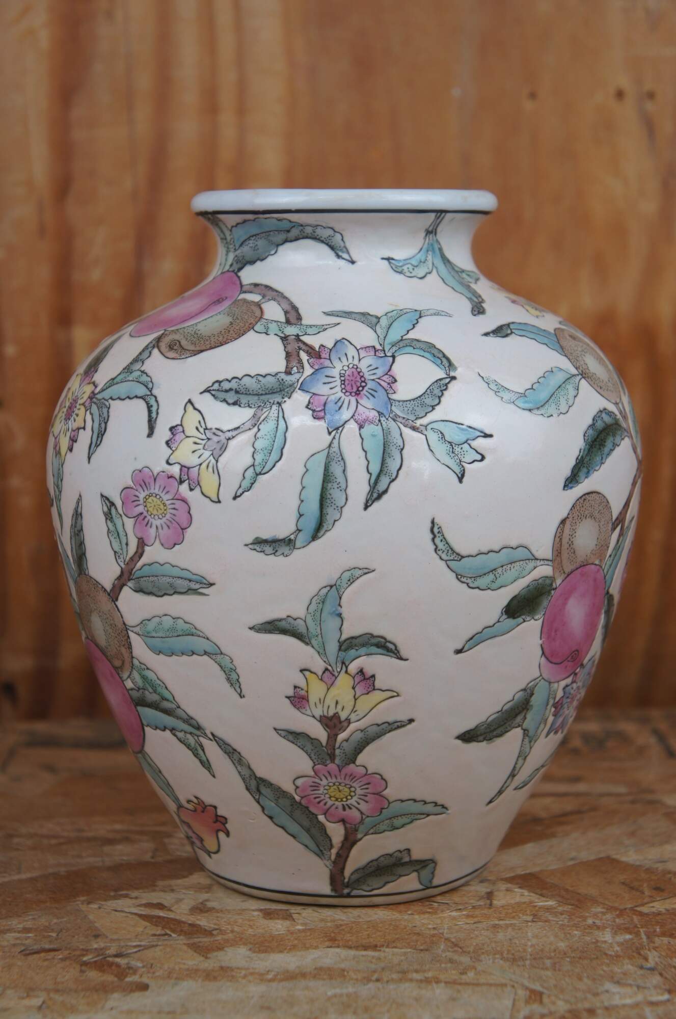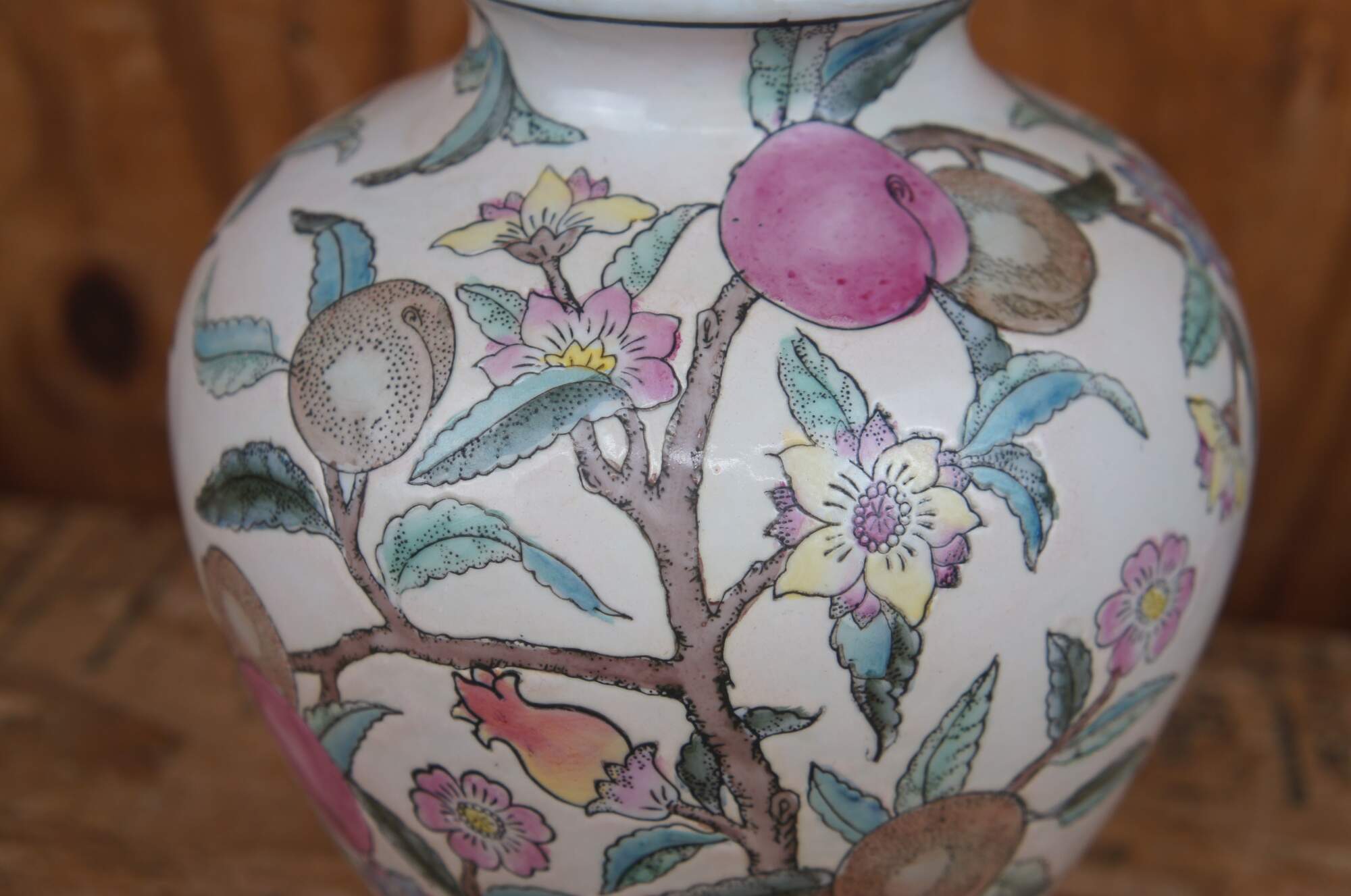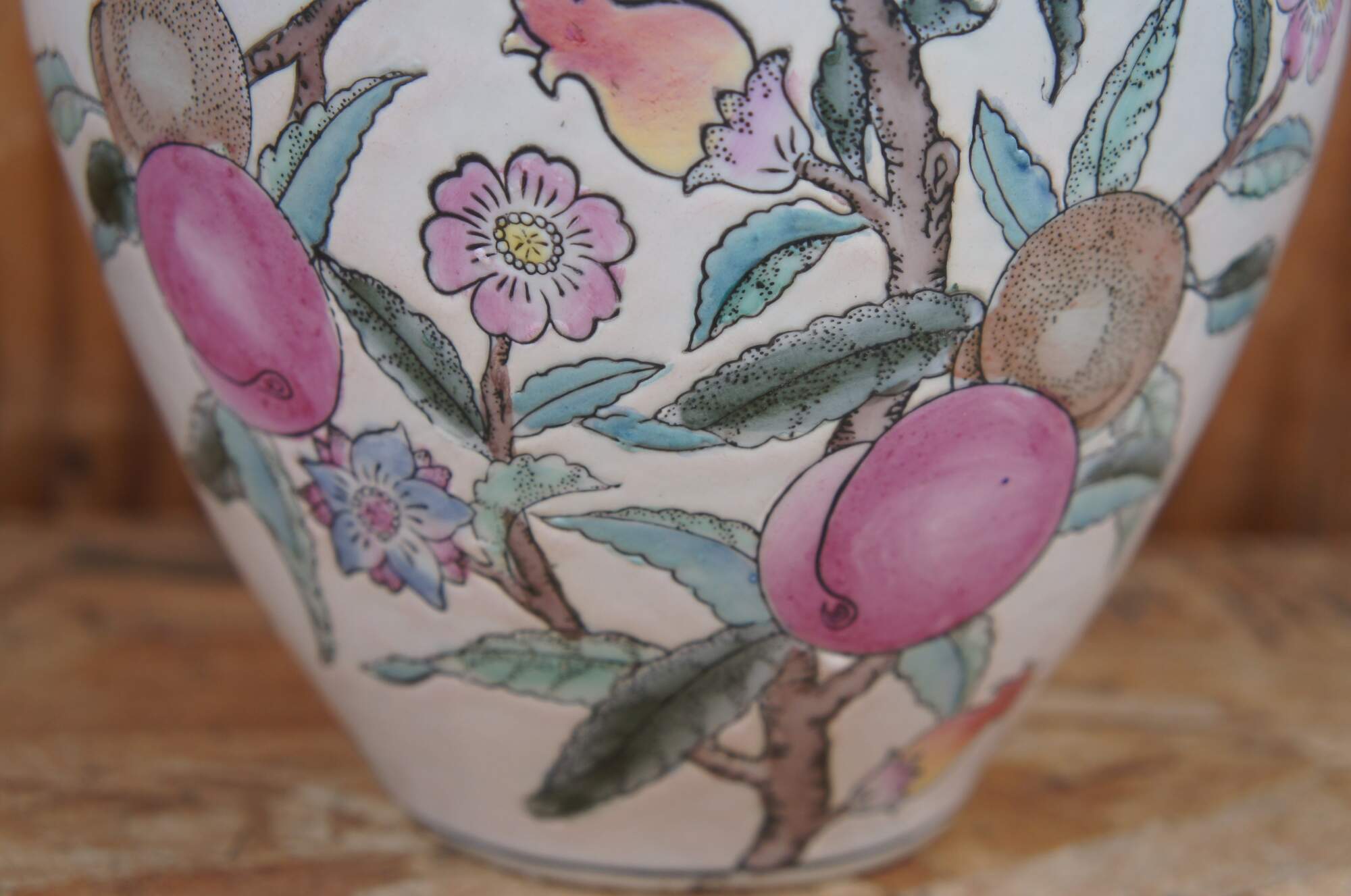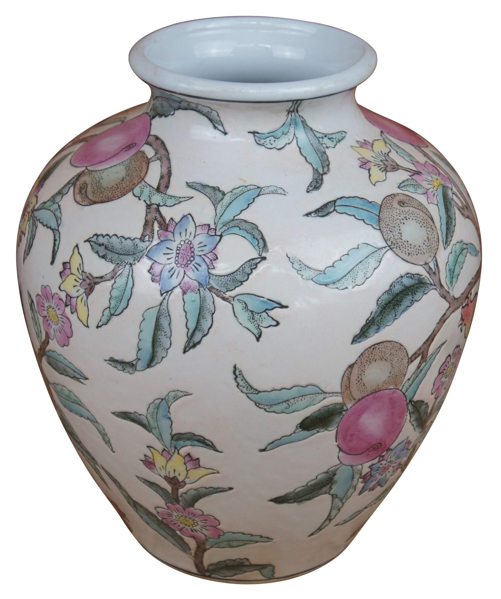 Vintage WBI Chinese enameled porcelain vase or urn featuring a colorful fruit and flowering tree motif.