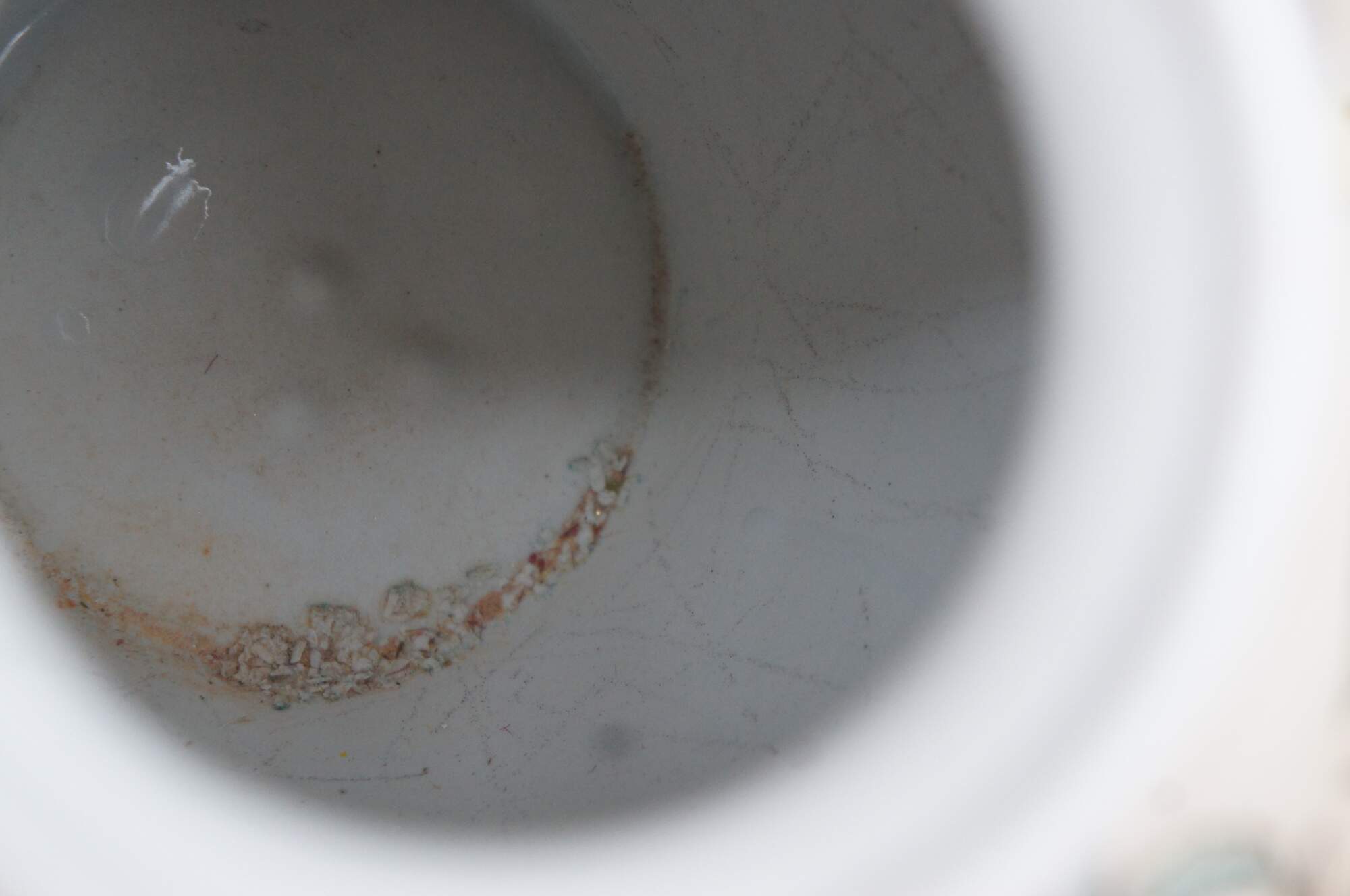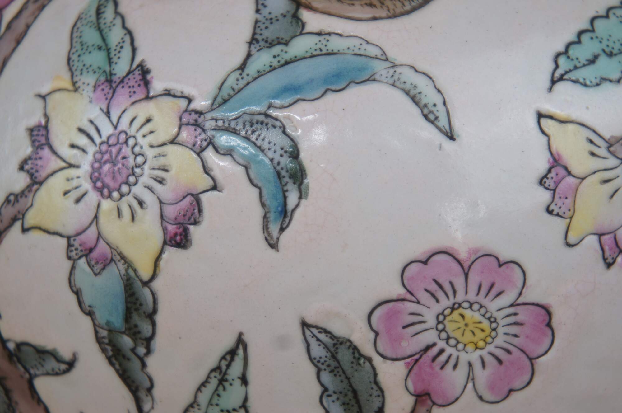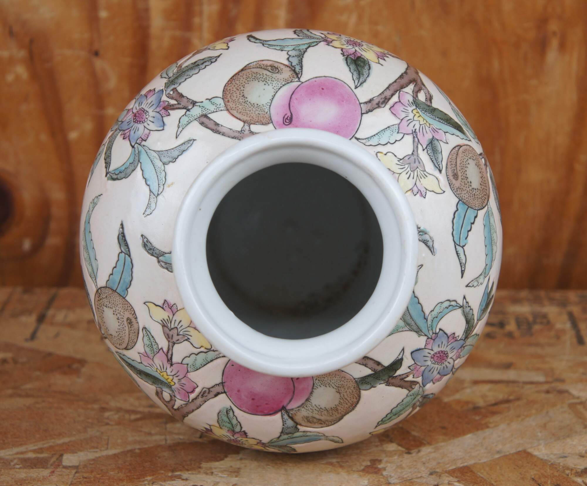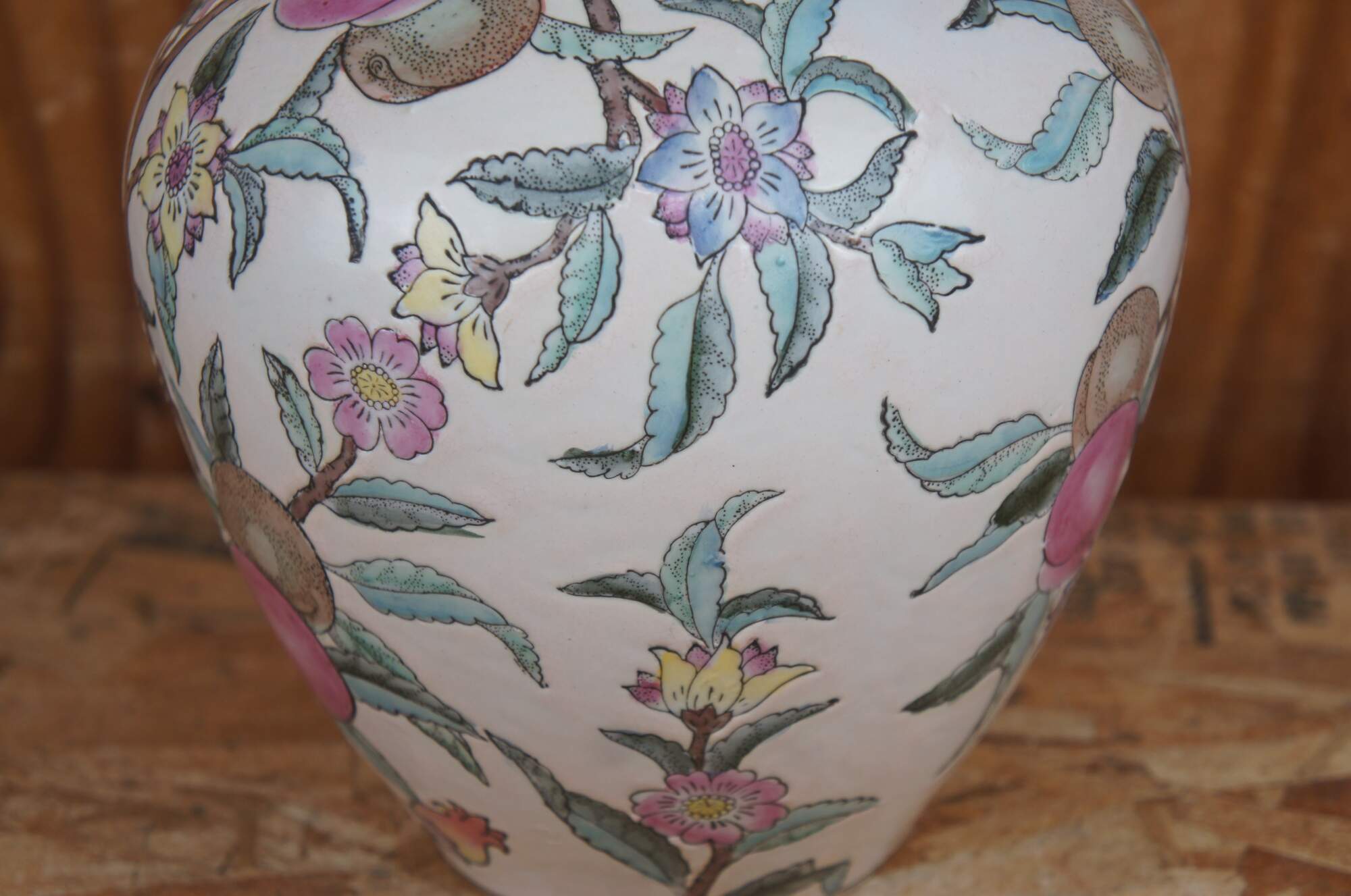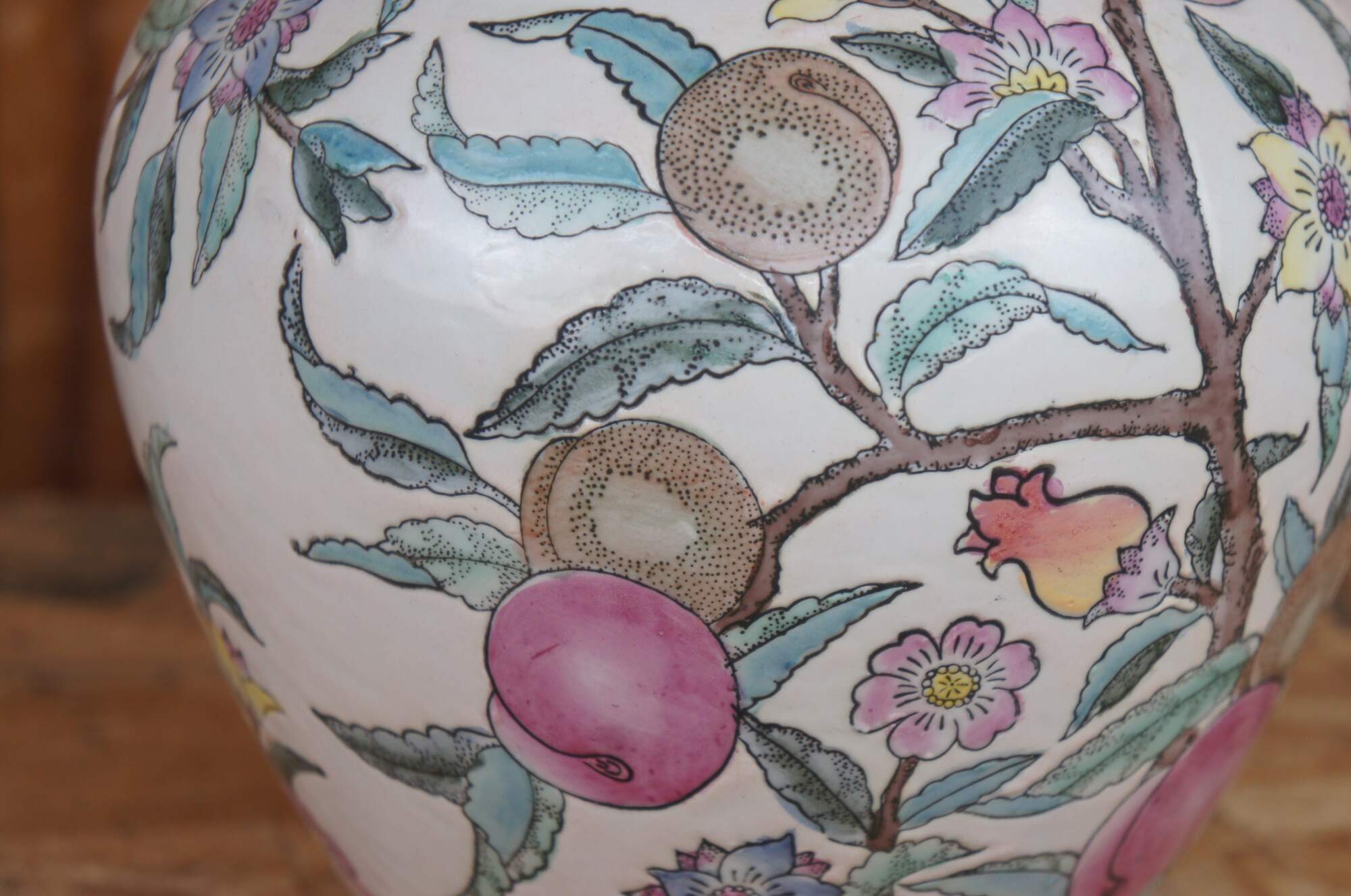 Vintage WBI Chinese enameled porcelain vase or urn featuring a colorful fruit and flowering tree motif.
