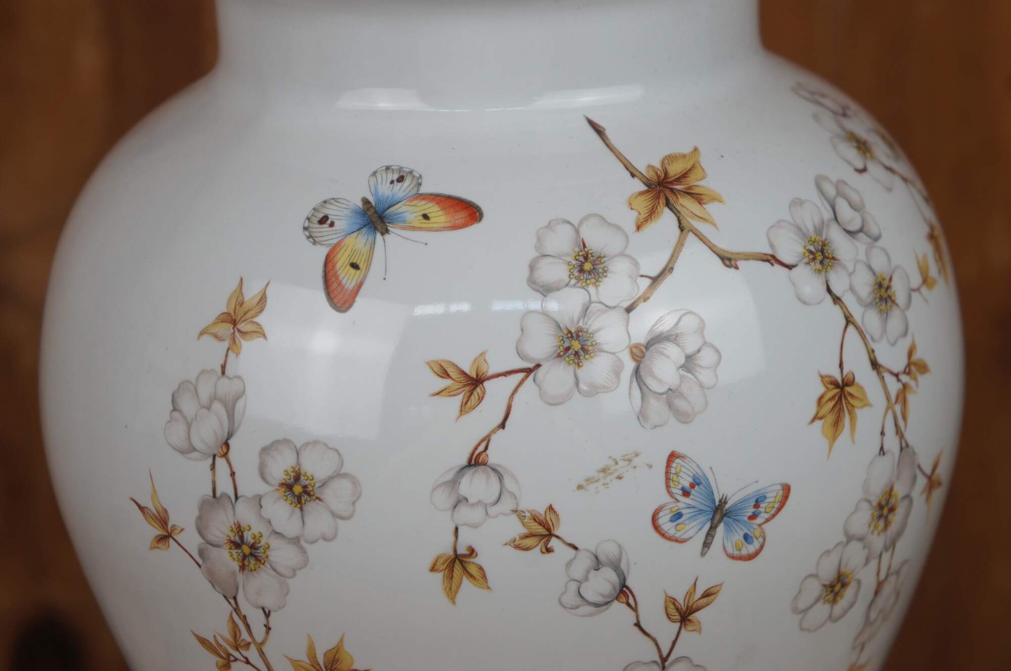 Two vintage Chinese porcelain mantel urns or vase lamps featuring a floral dogwood and butterfly motif on a white base with gold accents.