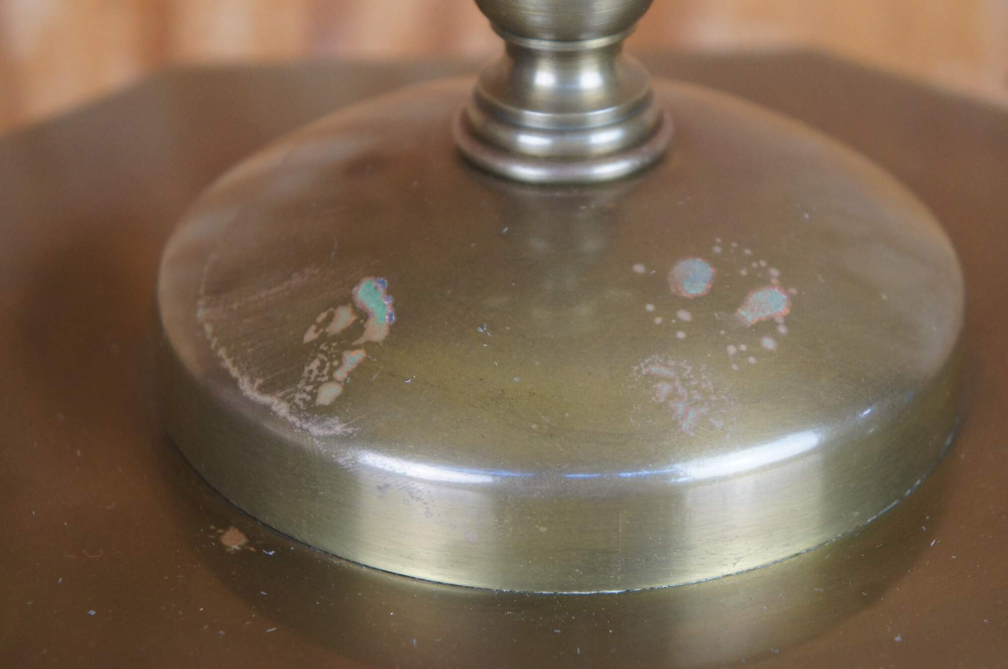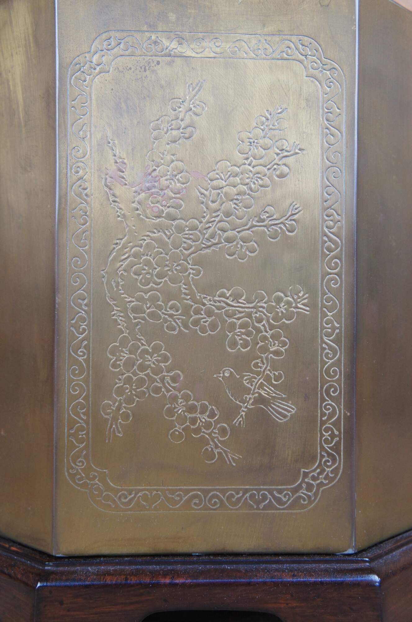 Vintage Frederick Cooper Chinese canister ginger jar or tea caddy table lamp featuring etched octagonal brass body with dogwood floral and bird motif.