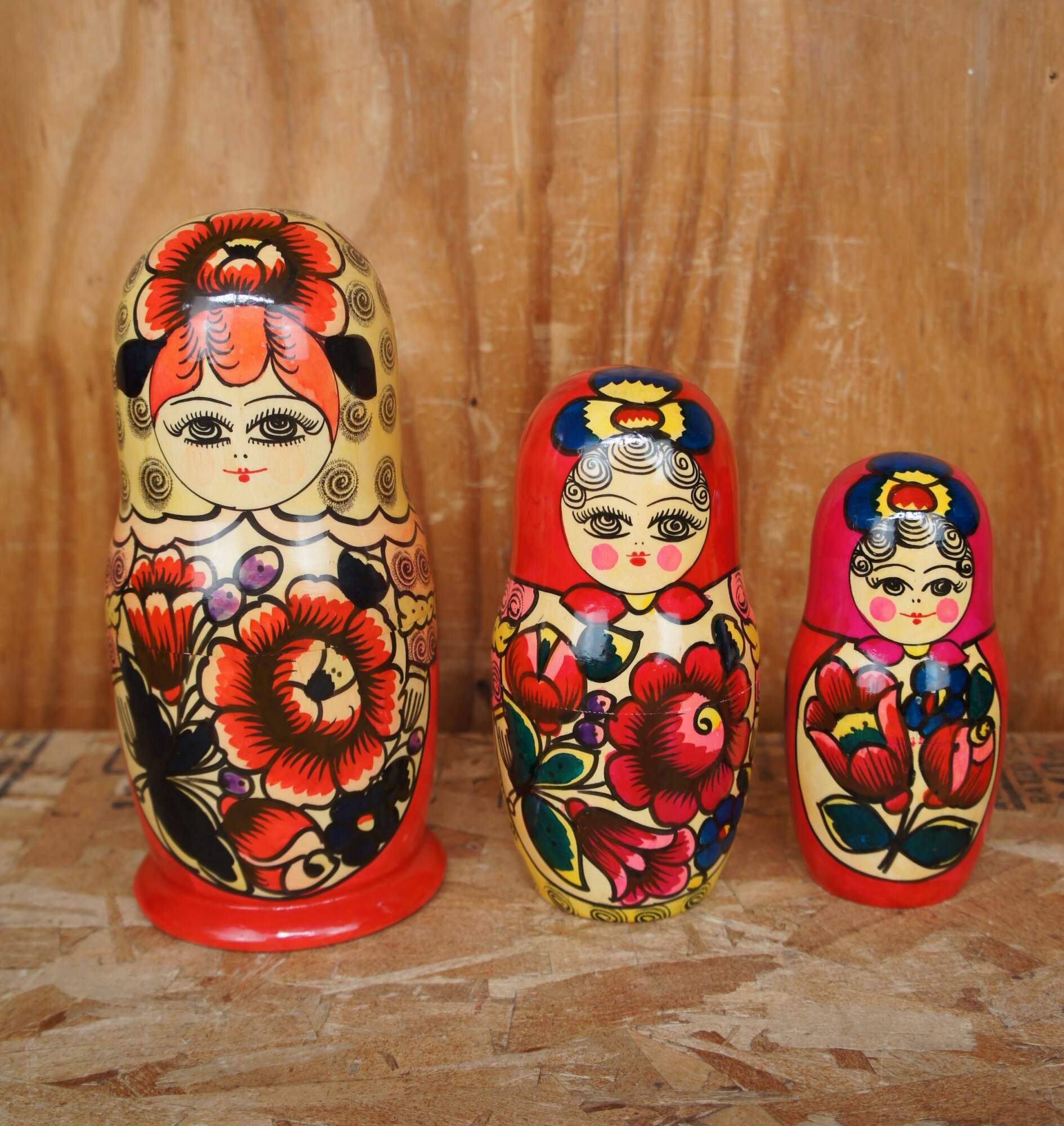 Two vintage USSR Matryoshka nesting puzzle dolls featuring hand painted details.