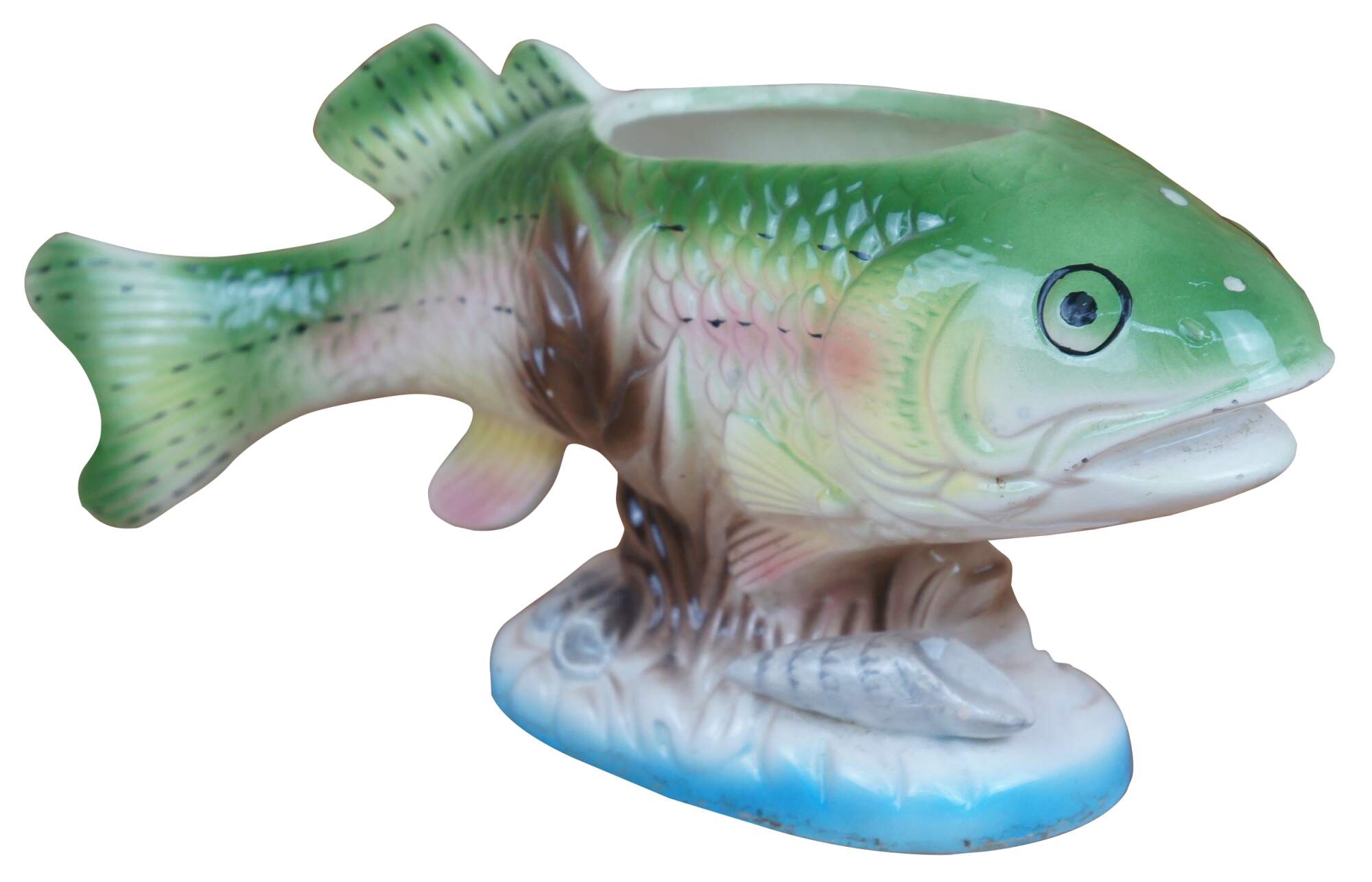 Mid century Rubens pocelain or ceramic planter vase in the form of a Rainbow Trout fish. Perfect for a lake house or cabin. T998.