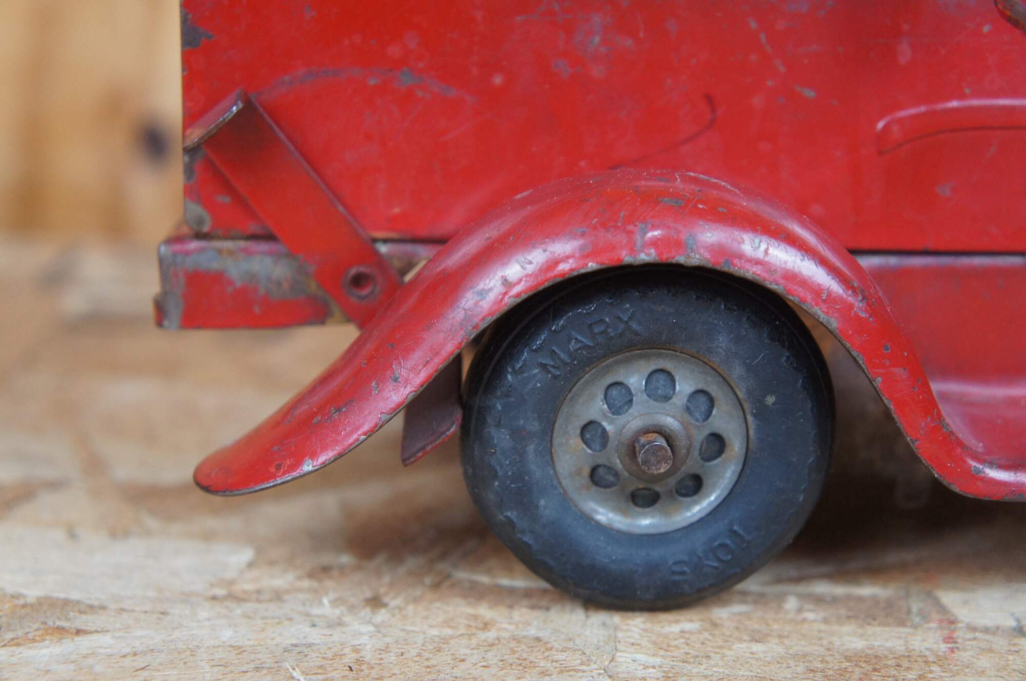 Mid century Marx Toys pressed steel fire truck engine. Circa 1940s.