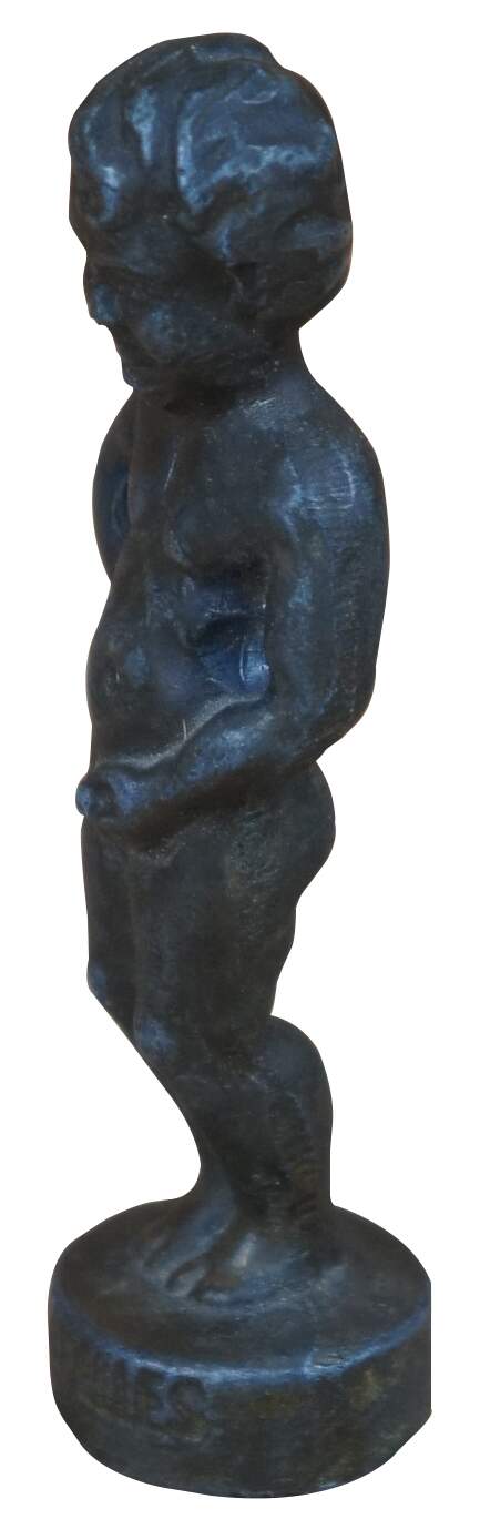 Vintage miniature metal Bruxelles peeing nude boy / cherub statue, figurine, paperweight or tobacco tamper. Made in Belgium.