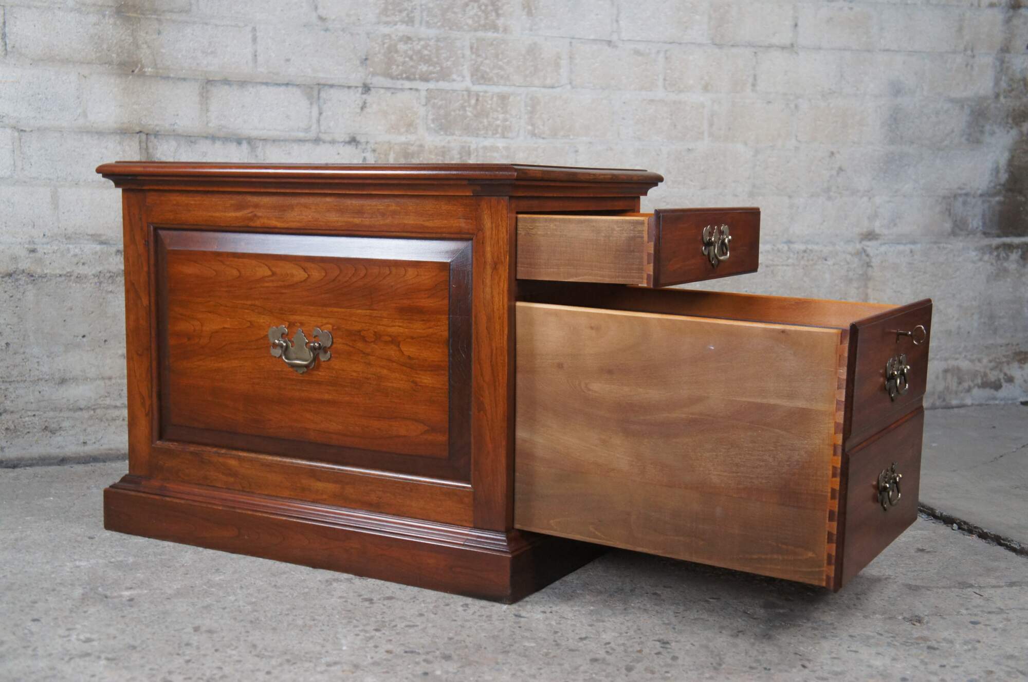 An exceptional and rare pair of side table or file cabinets by Pennsylvania House, circa 1960s. Made from solid cherry with oak drawer construction in Chippendale or Georgian manner. Features a upper drawer and large lower file drawer (dovetailed) for document storage. A versatile pair that can be used in an office, living space or bedroom.