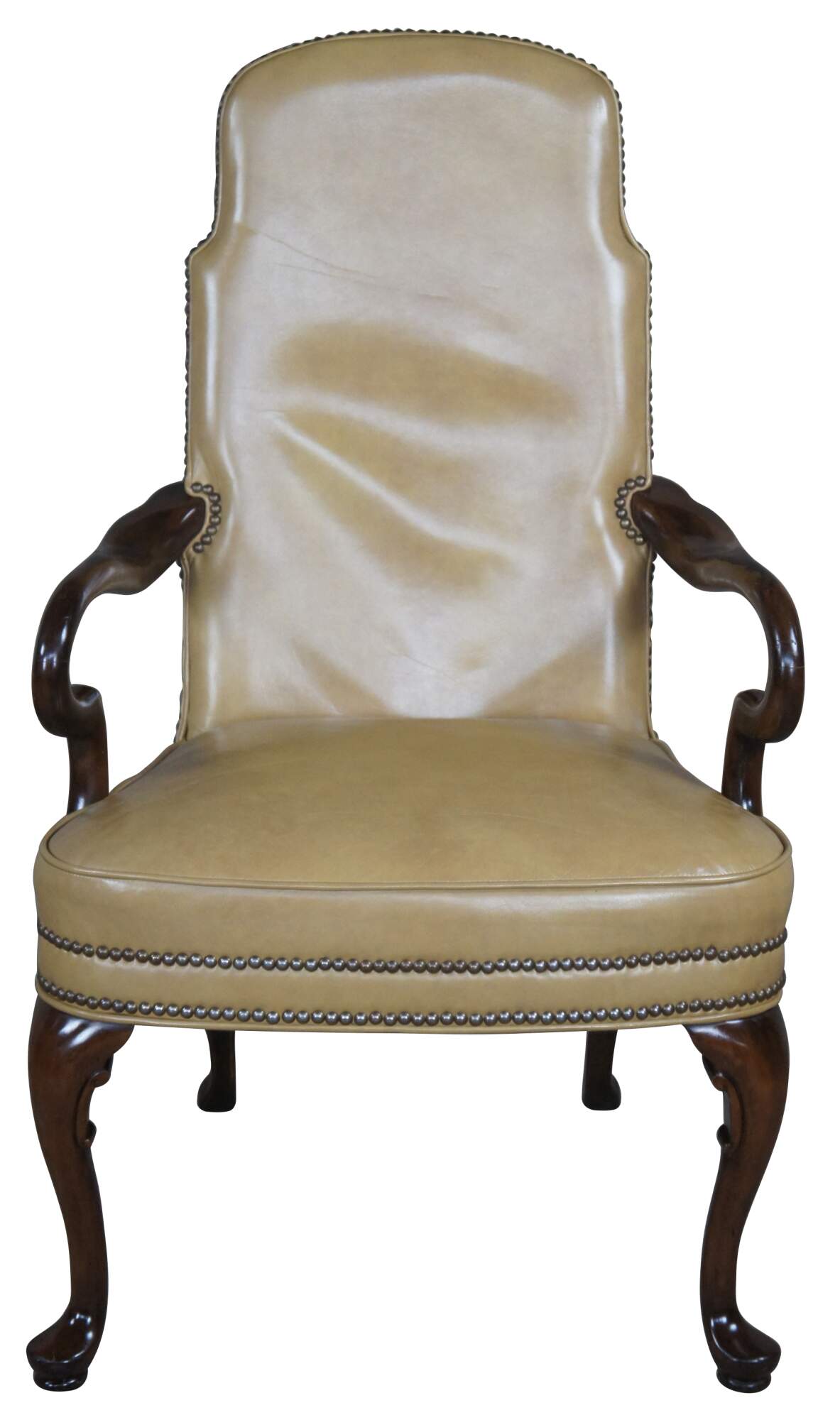 Circa 1980s Ethan Allen Georgian Court Dining Chairs. Made from solid cherry in Queen Anne styling. Features a shaped crest rail over vase shaped splat leading to seats supported by cabriole legs with pad feet. Set includes 4 side chairs and 2 leather upholstered gooseneck arm chairs with nailhead trim. 11-2611 & 20-7609