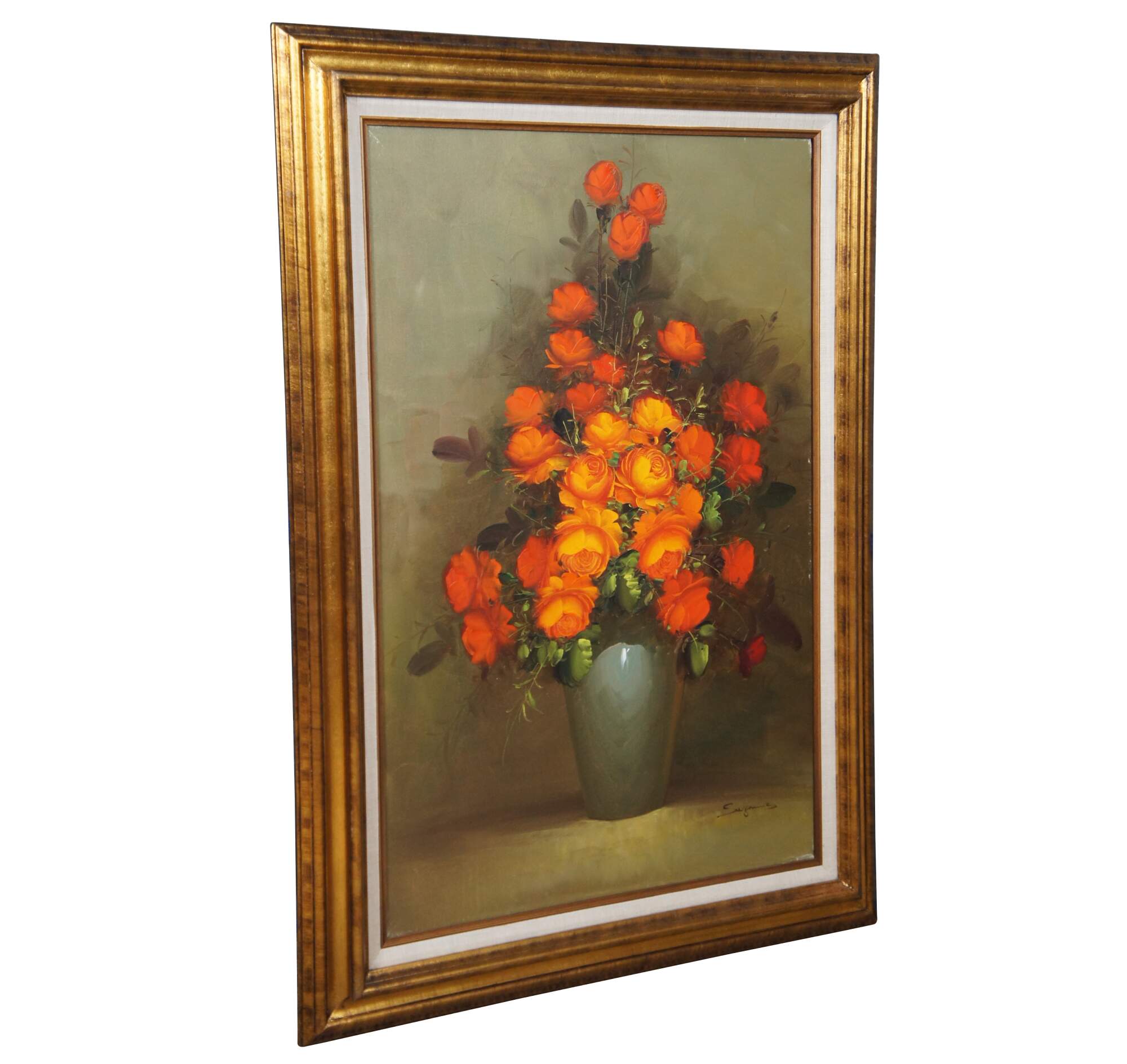 Vintage still life oil painting on canvas of a bouquet of orange roses in a light blue vase. Signed by artist Suzanne in lower left.