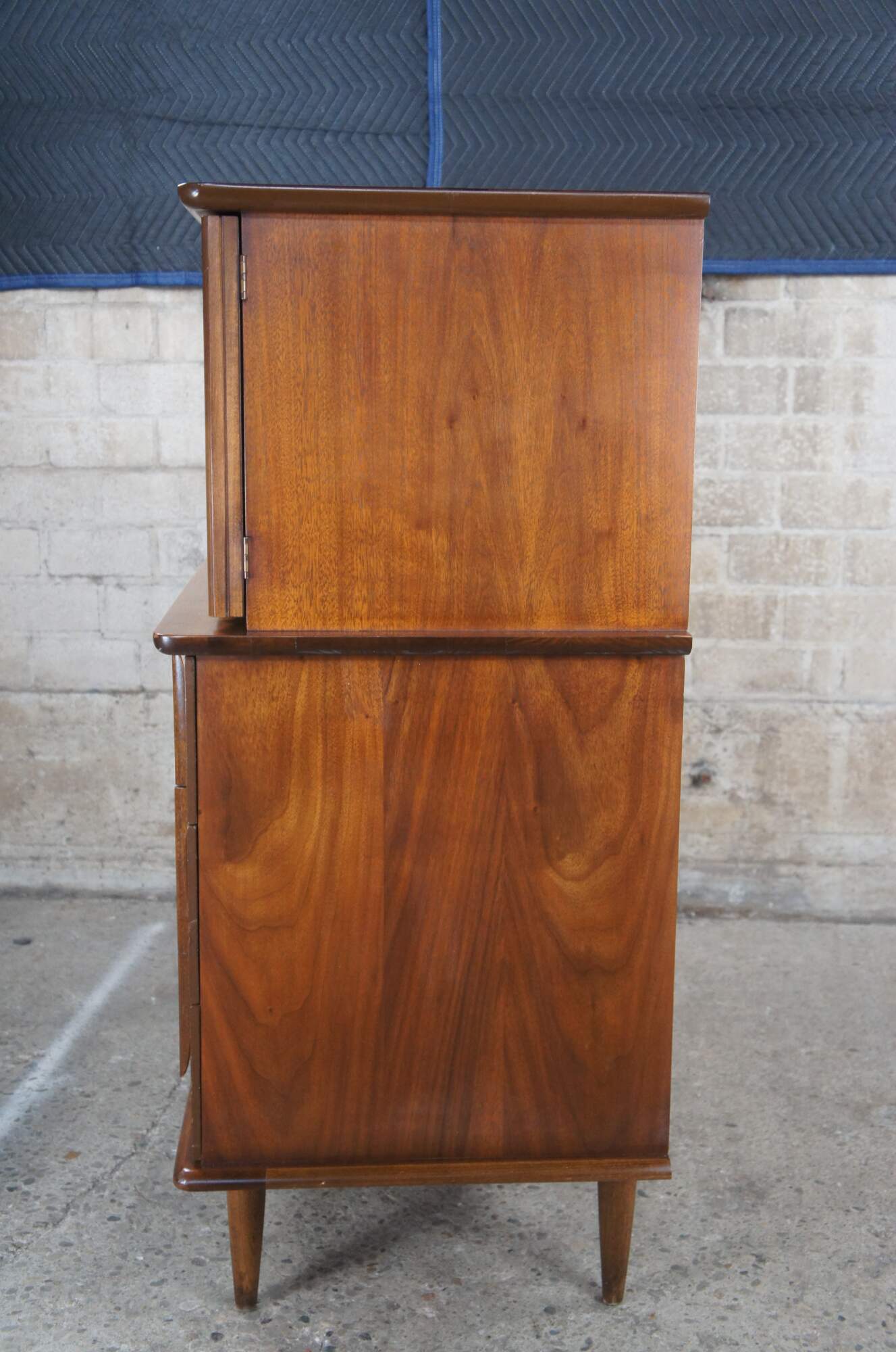 An exceptional Mid Century Modern dresser by United Furniture Corporation. Made from walnut with a sculptural top that conceals 4 upper drawers. Lower section features three larger drawers with sculpted drawer pulls. Each drawer is dovetailed and made from solid oak. The dresser is supported by turned and tapered legs.