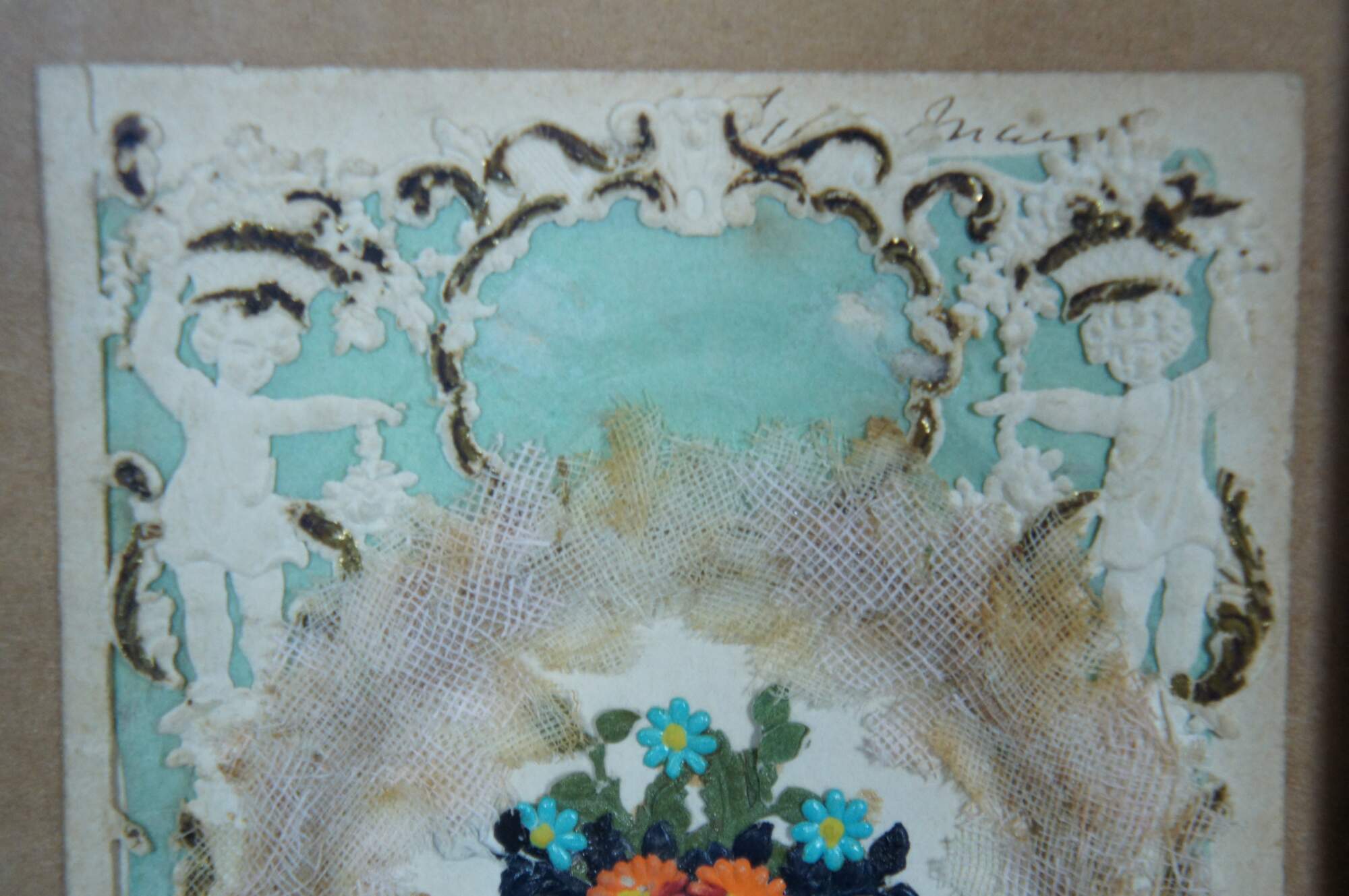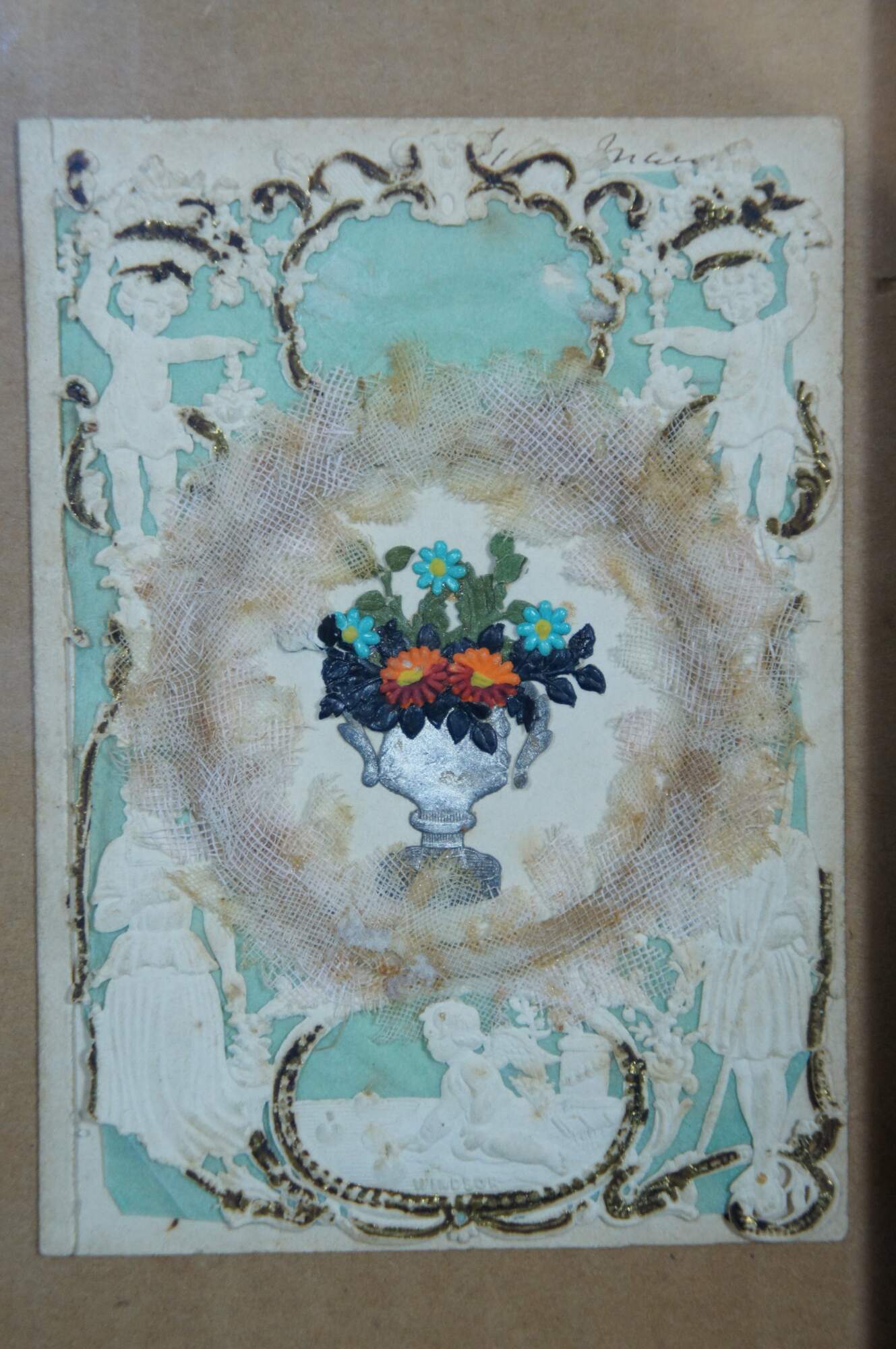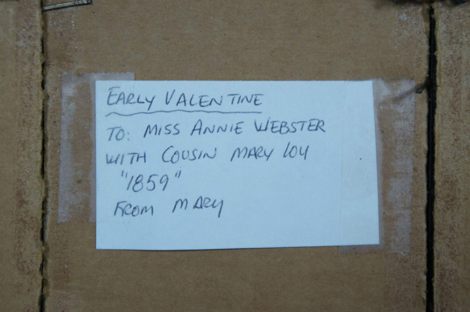 Antique framed Victorian Valentine to Miss Annie Webster with Cousin Mary Lou, 1859, from Mary. Front features an embossed die cut frame over robin’s egg blue showing cherubs and a pair of male and female figures, and a wreath of cloth leaves around a central urn of painted flowers.