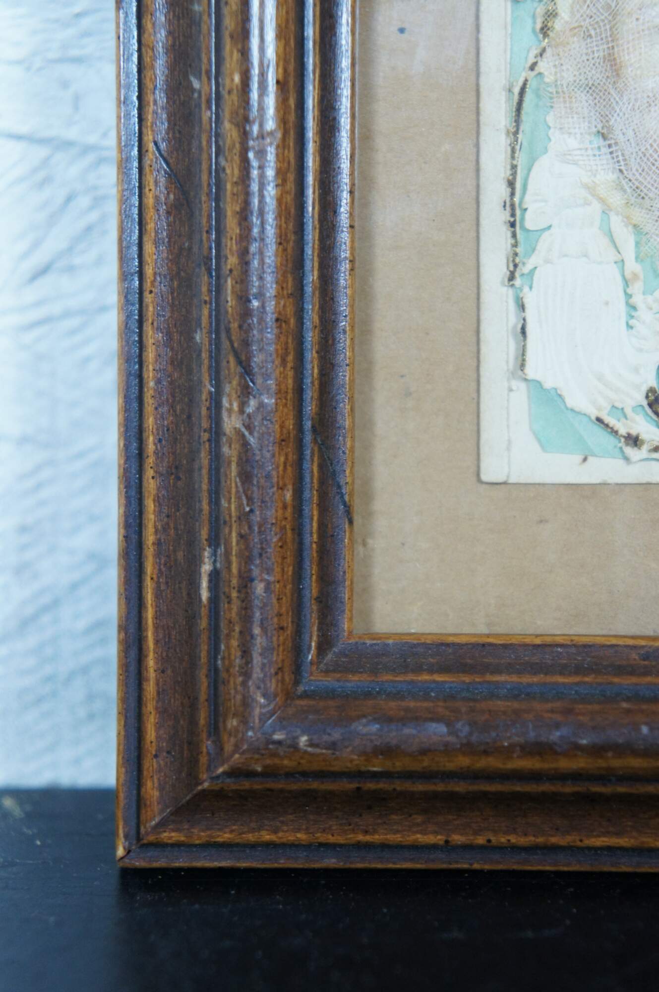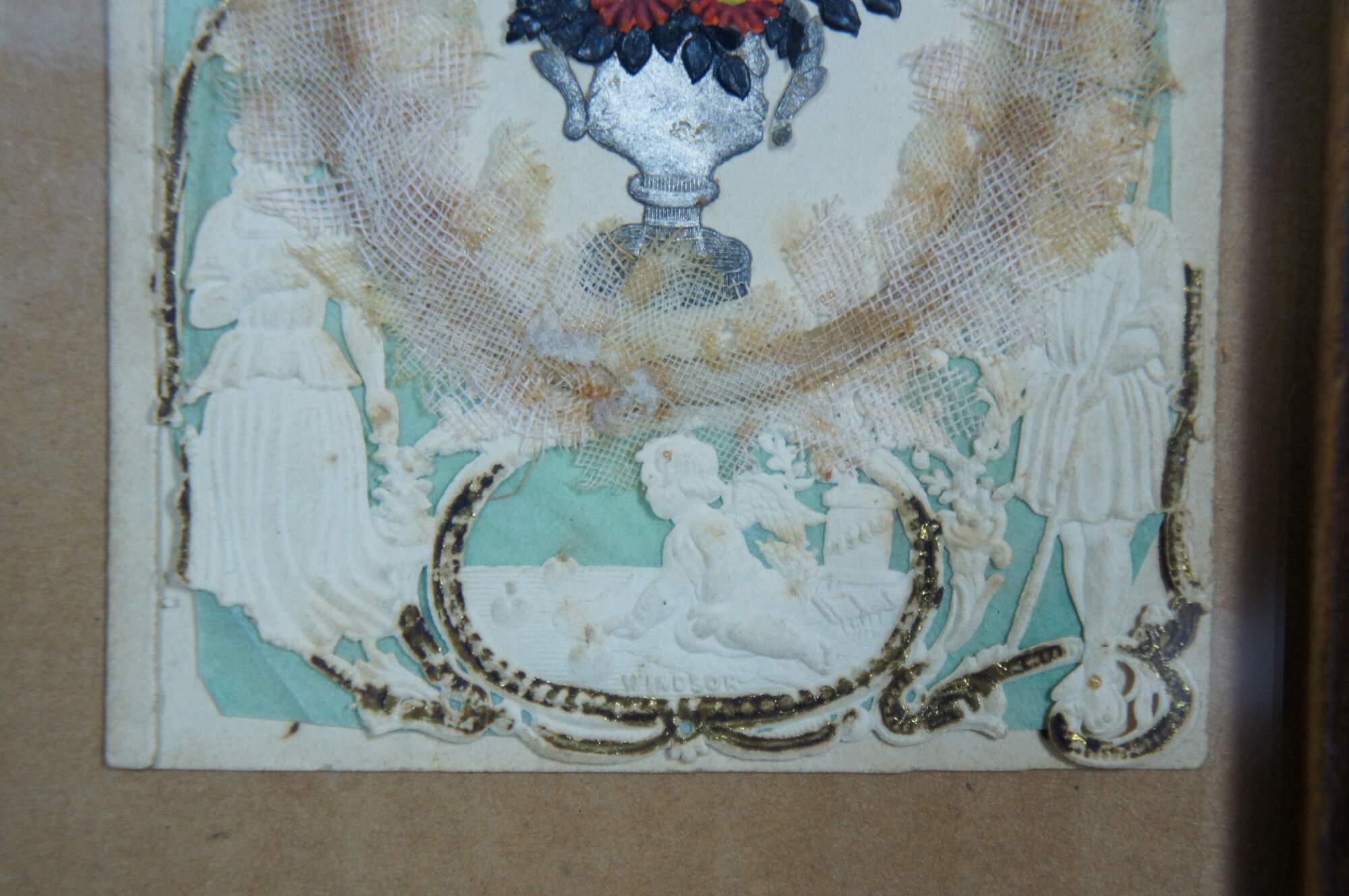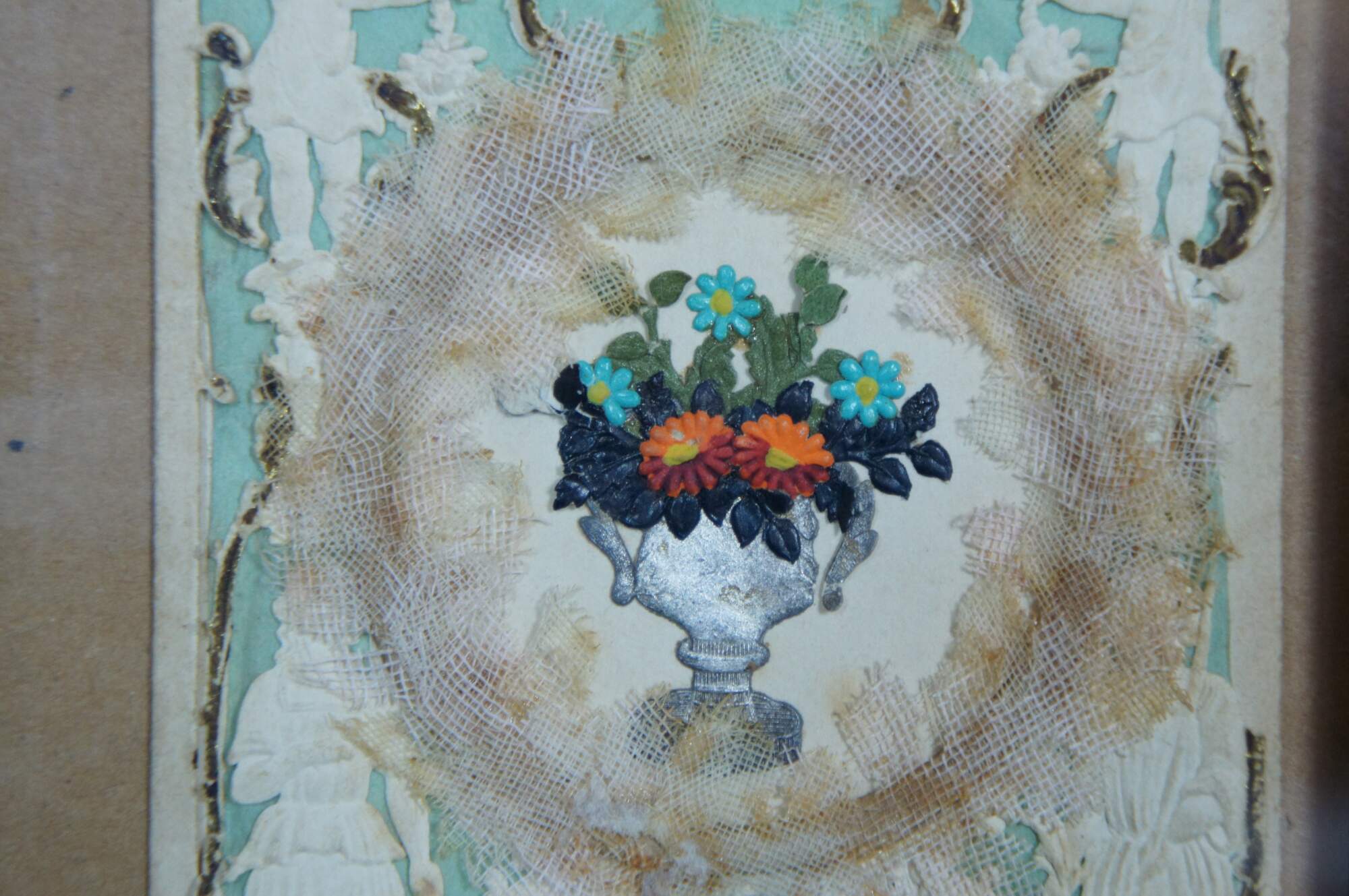 Antique framed Victorian Valentine to Miss Annie Webster with Cousin Mary Lou, 1859, from Mary. Front features an embossed die cut frame over robin’s egg blue showing cherubs and a pair of male and female figures, and a wreath of cloth leaves around a central urn of painted flowers.