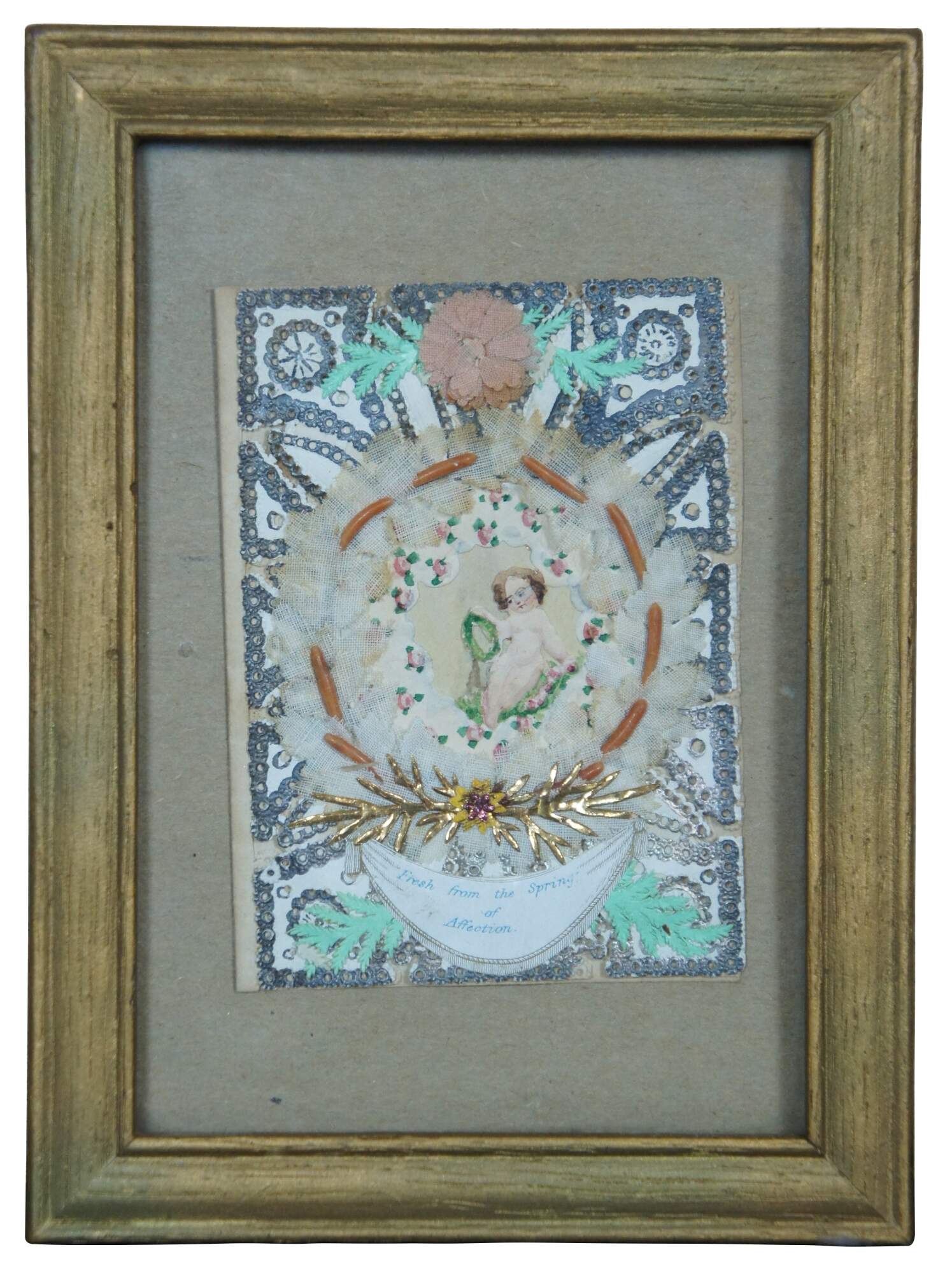 Antique framed Victorian Valentine, inscribed inside “From Wm. Kennedy 1861.” Front features a frame of painted paper lace doily, a wreath of fabric leaves and flowers surrounding a hand painted cherub and roses, with a banner below, printed with the words “Fresh from the Spring of Affection.”