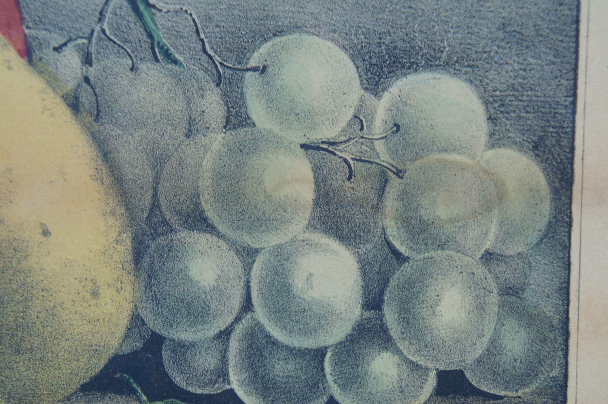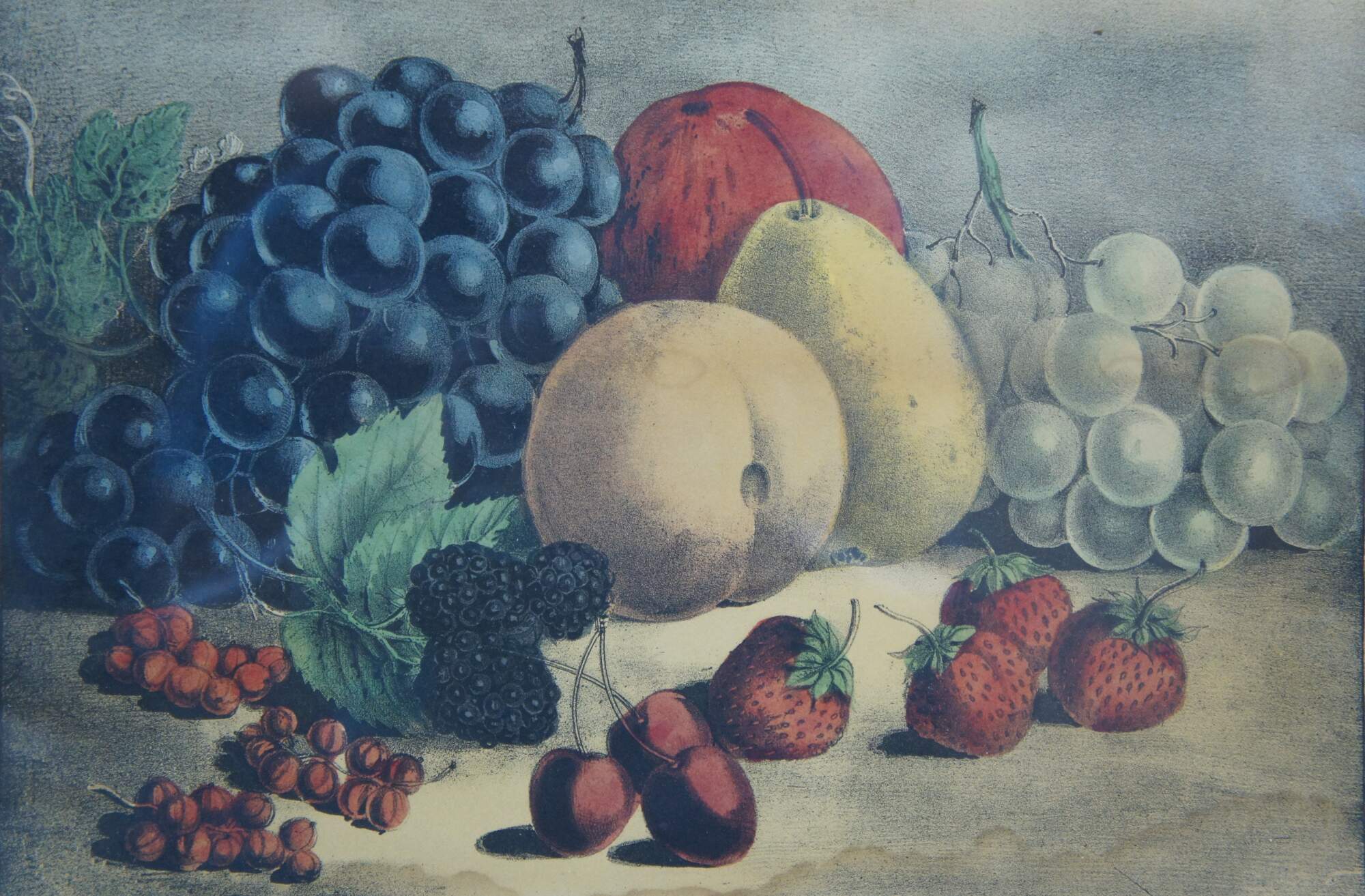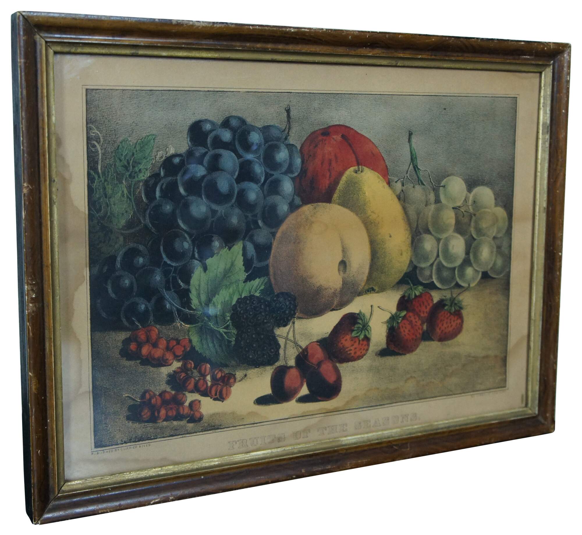 Antique Victorian hand colored lithograph print published circa 1872 by Currier & Ives, titled Fruits of the Seasons.