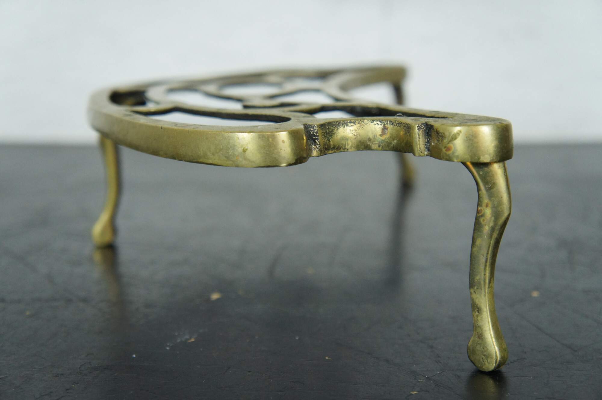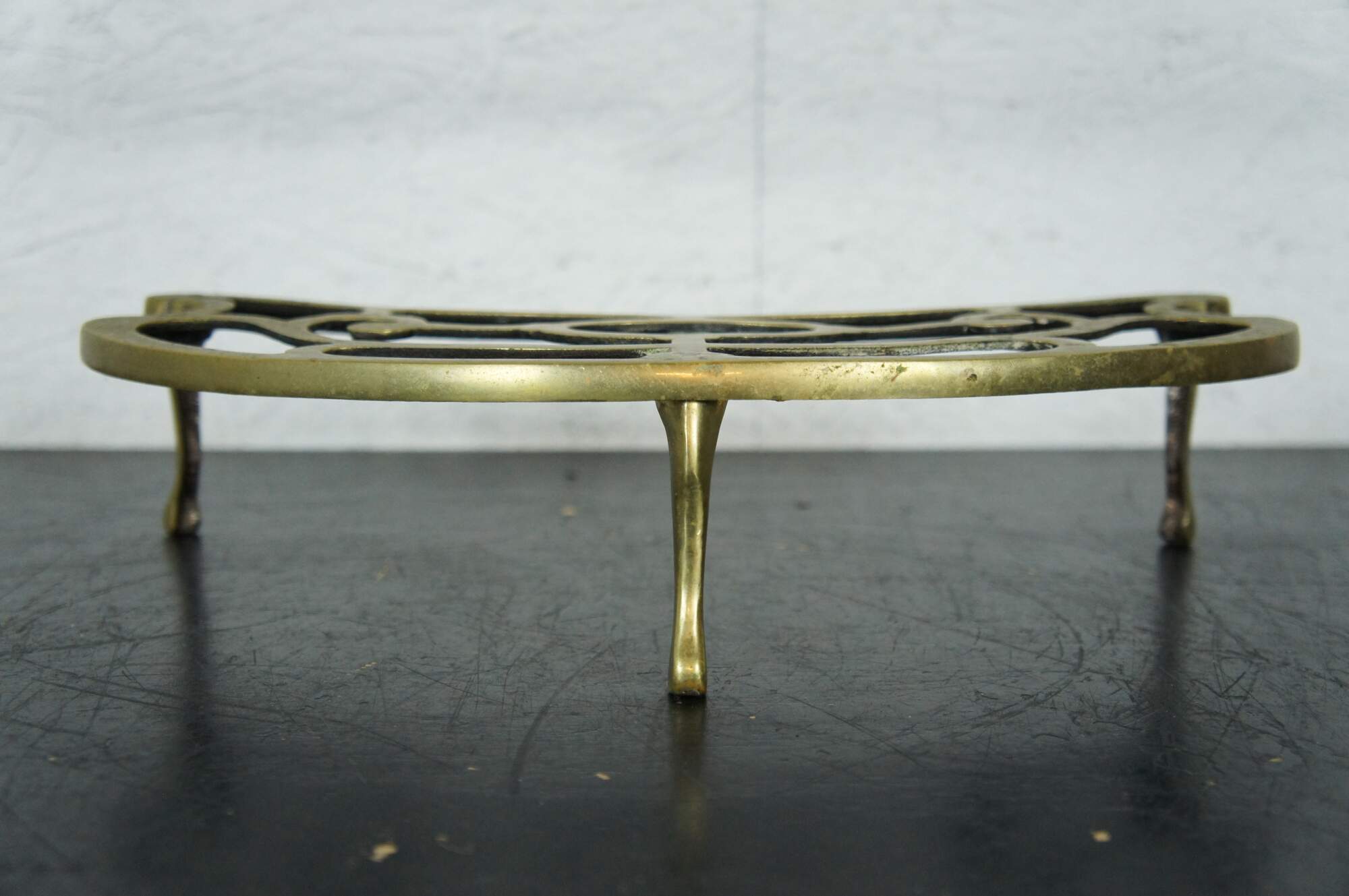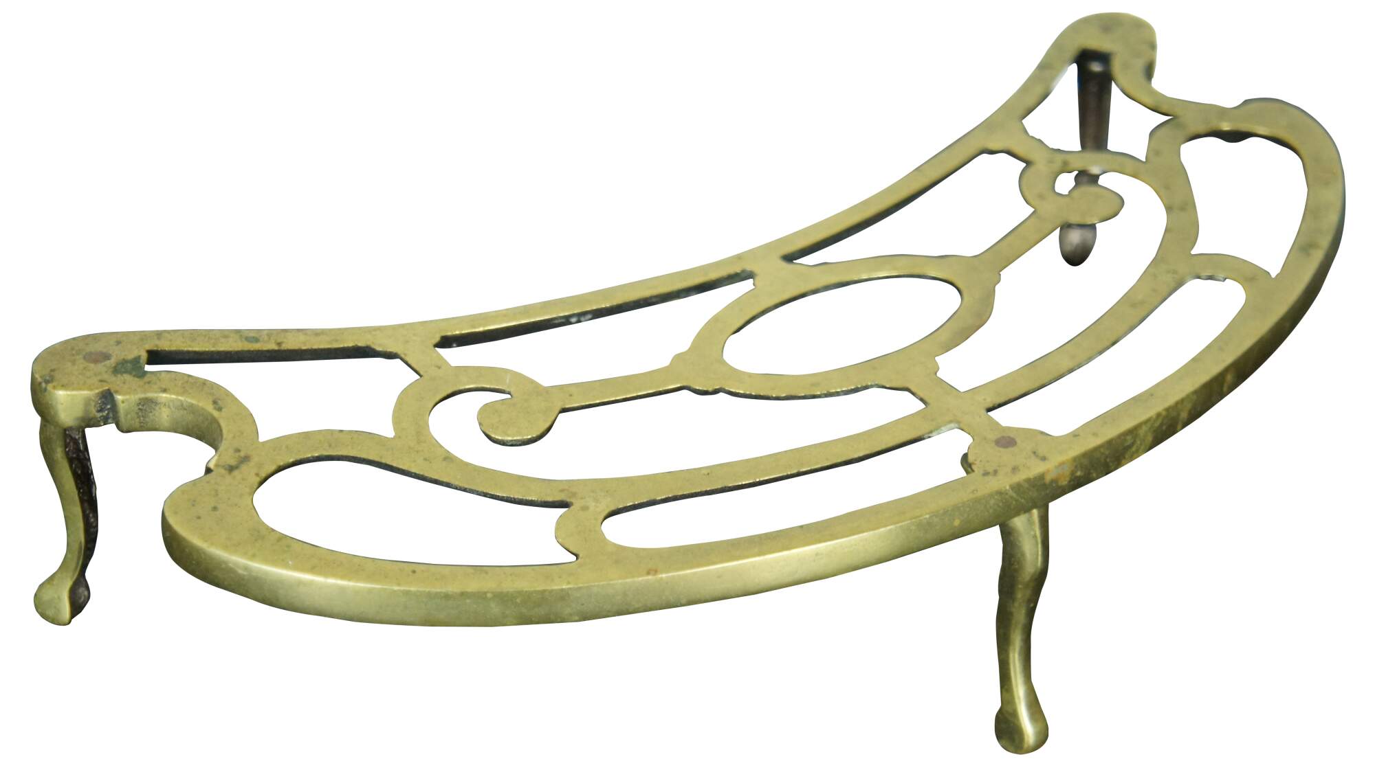 Antique demilune pierced brass footman or fireplace trivet / plant stand supported on three cabriole style feet.