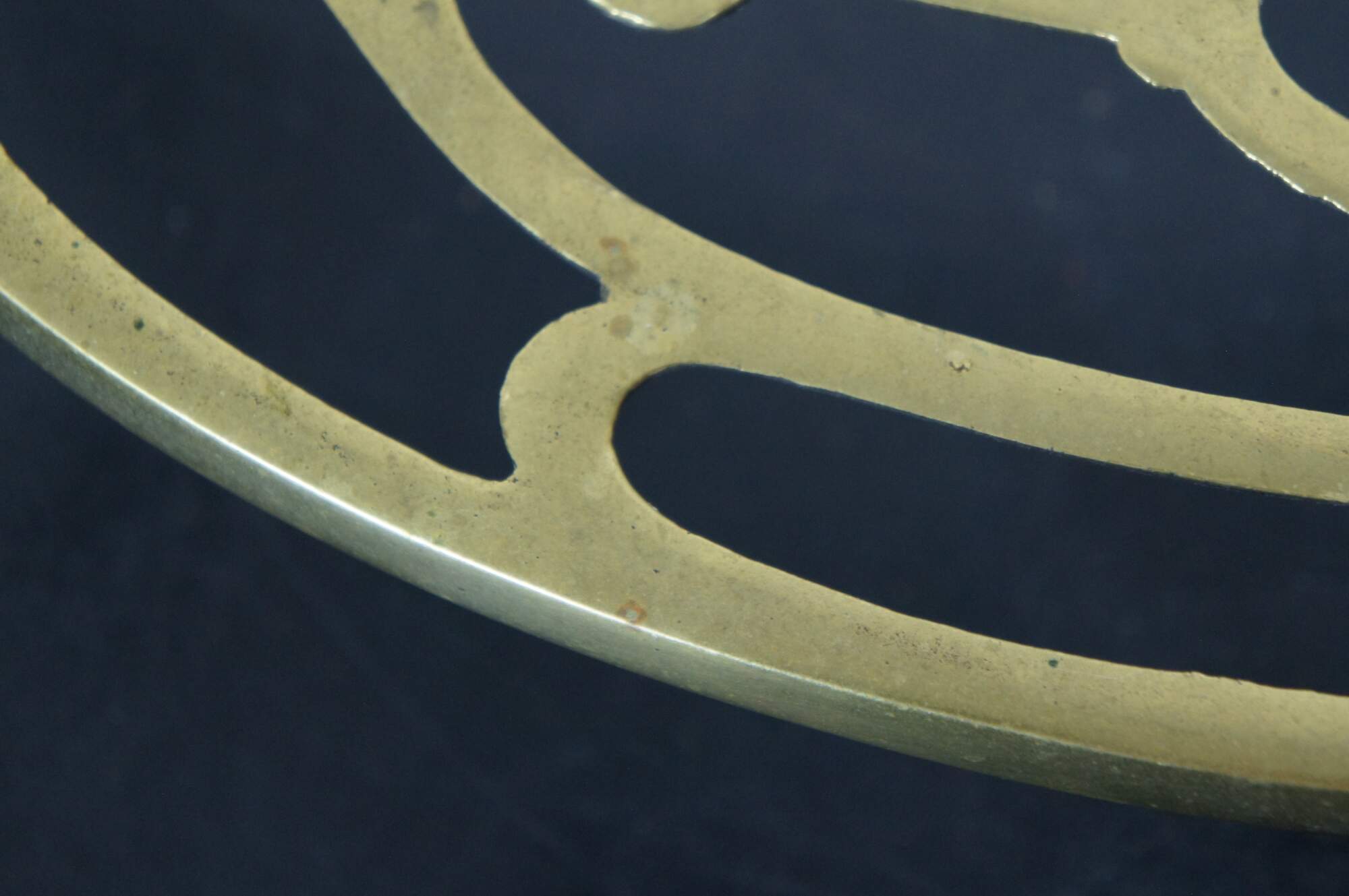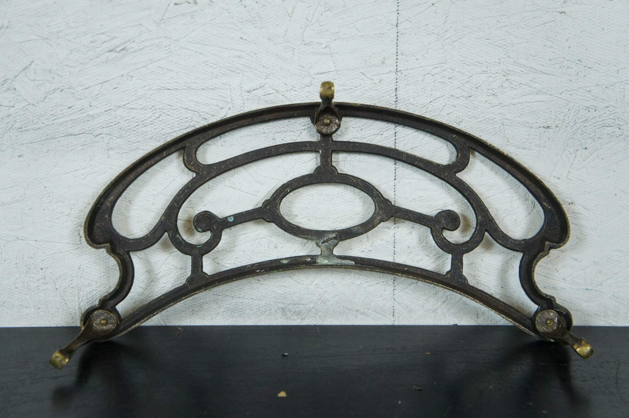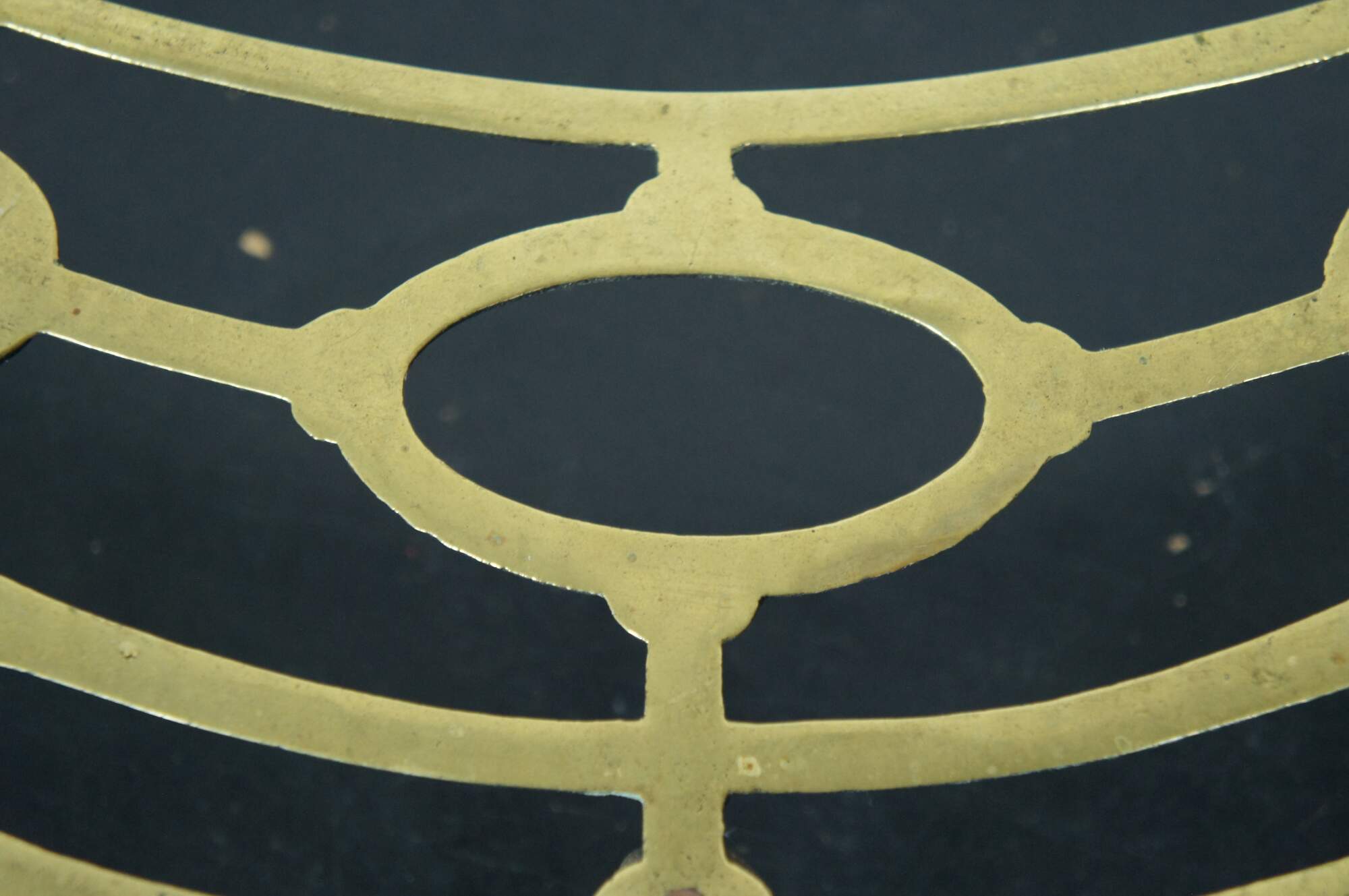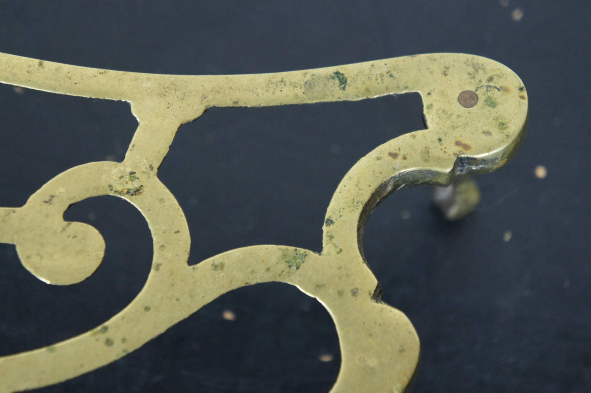 Antique demilune pierced brass footman or fireplace trivet / plant stand supported on three cabriole style feet.