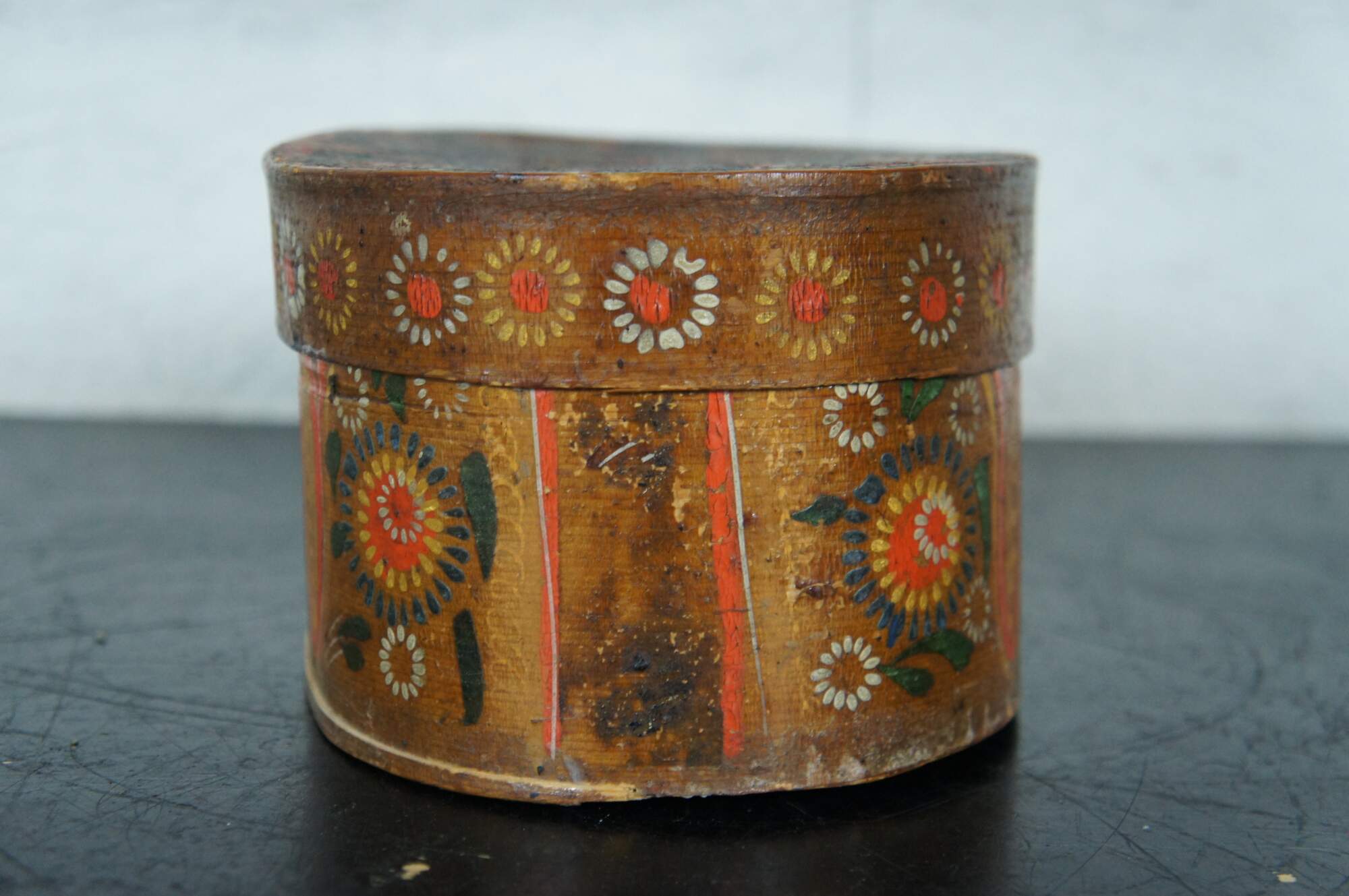 Antique 19th century German or Pennsylvania Dutch folk art Bride’s Box, crafted of bentwood and hand painted with floral and star motifs.
