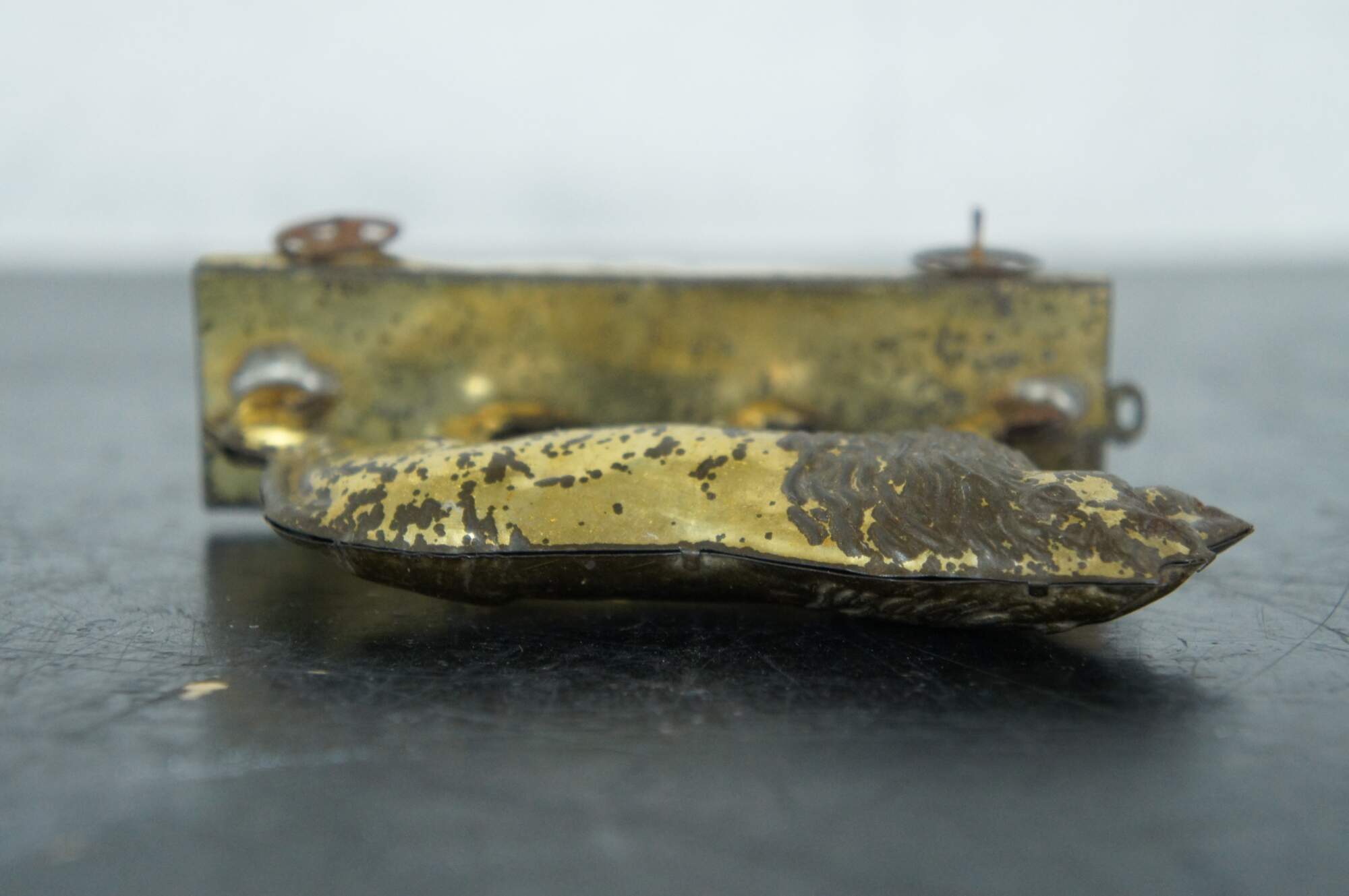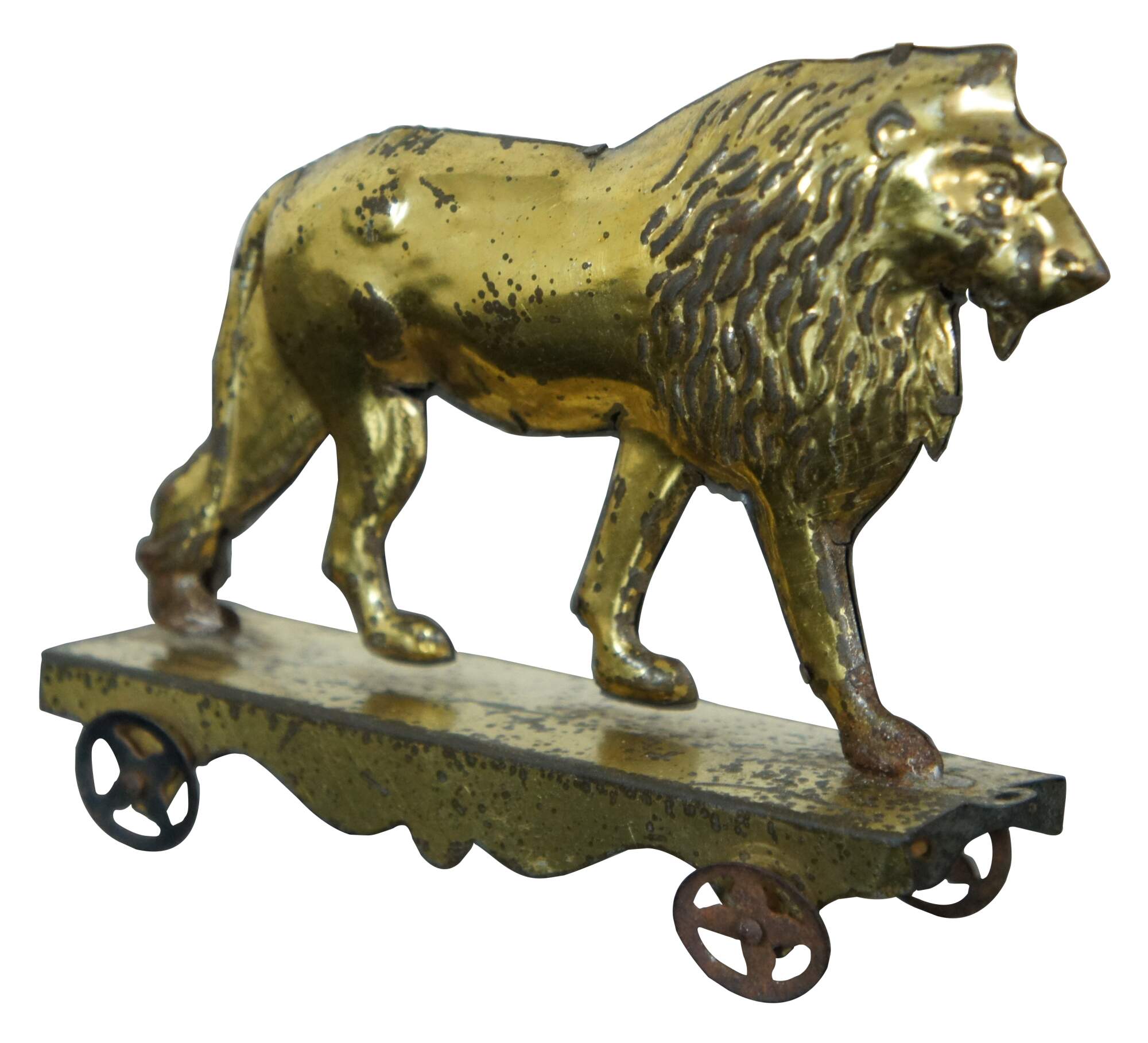 Antique tin pull toy in the shape of a male lion standing on a decorative platform with wheels and holes for a pull string, in brass finnish.