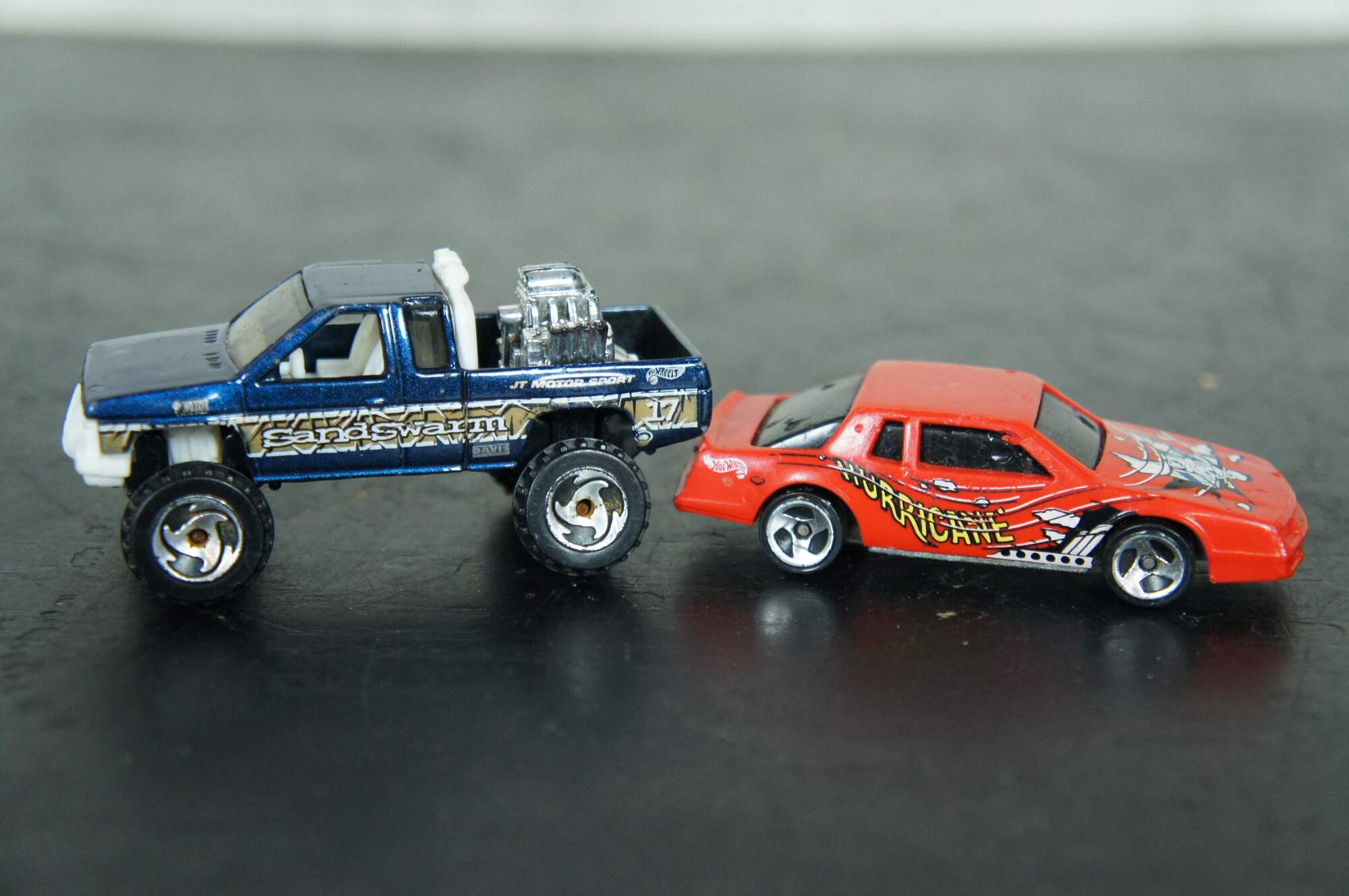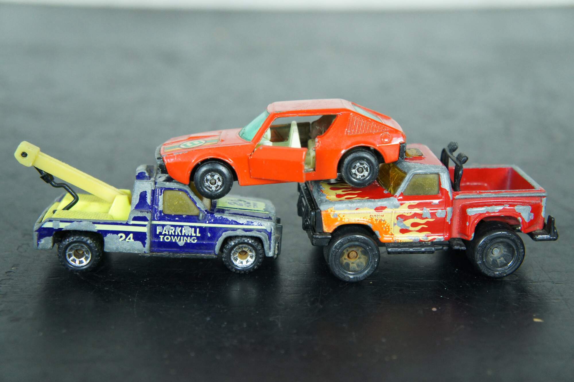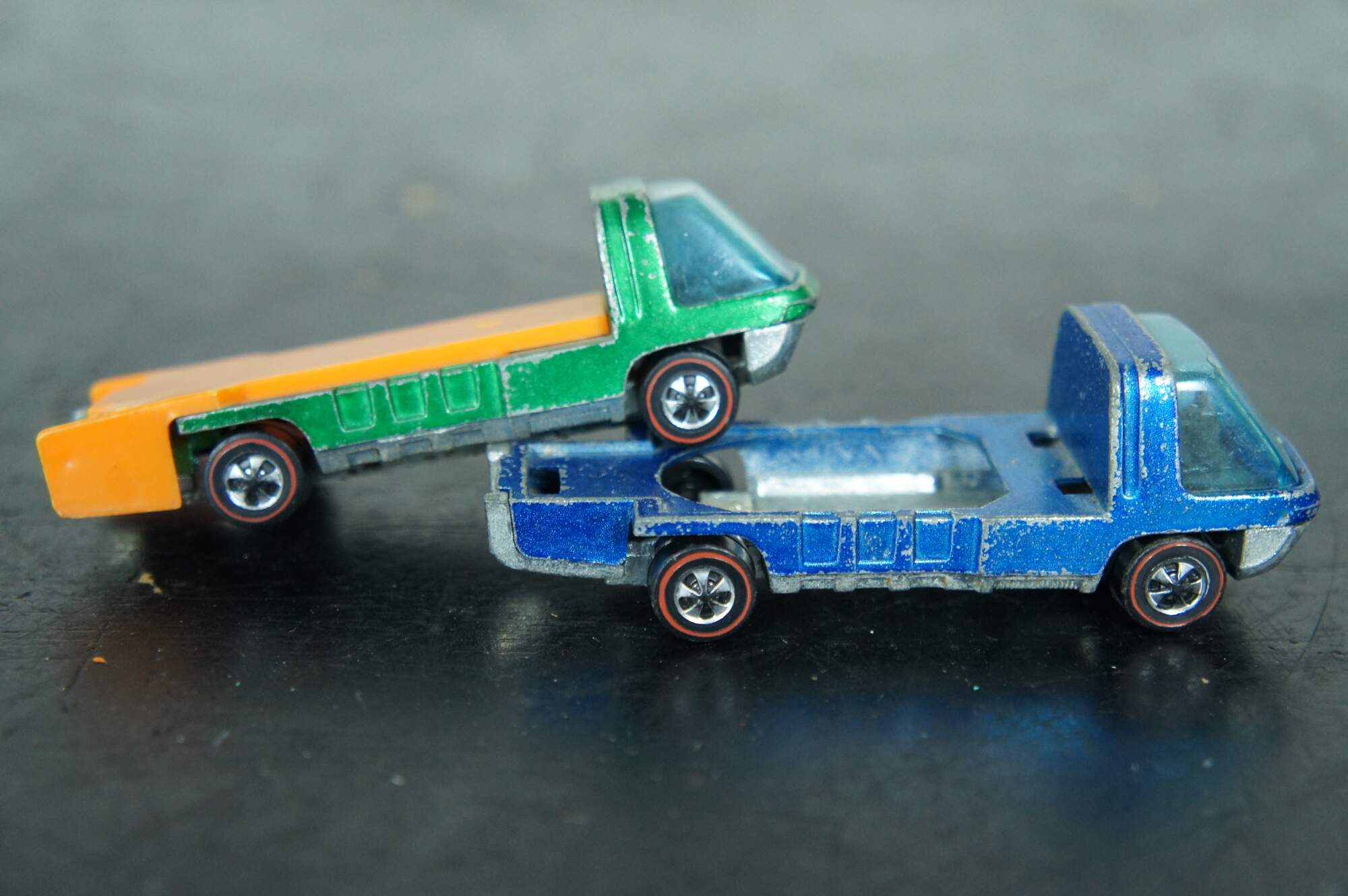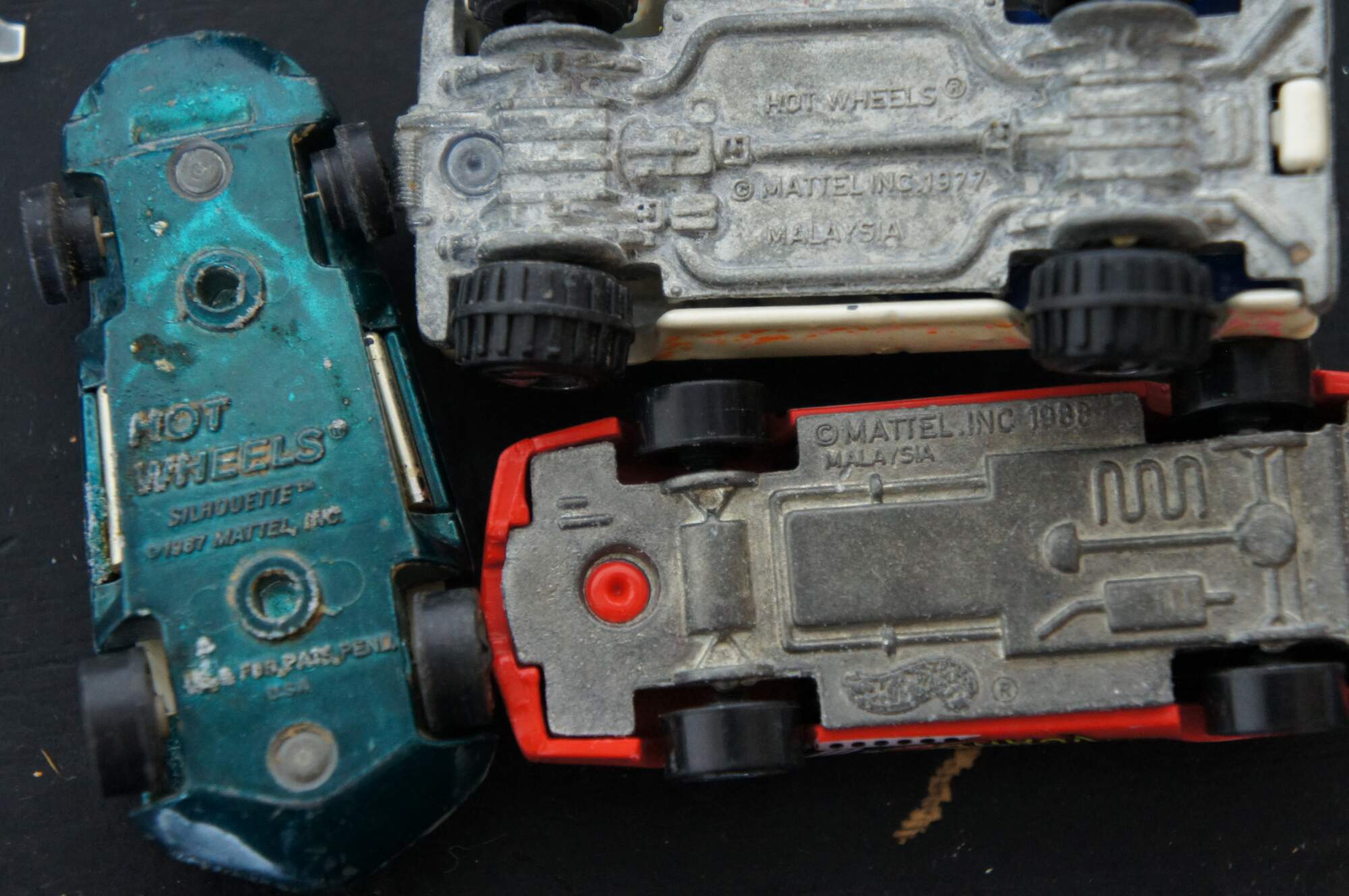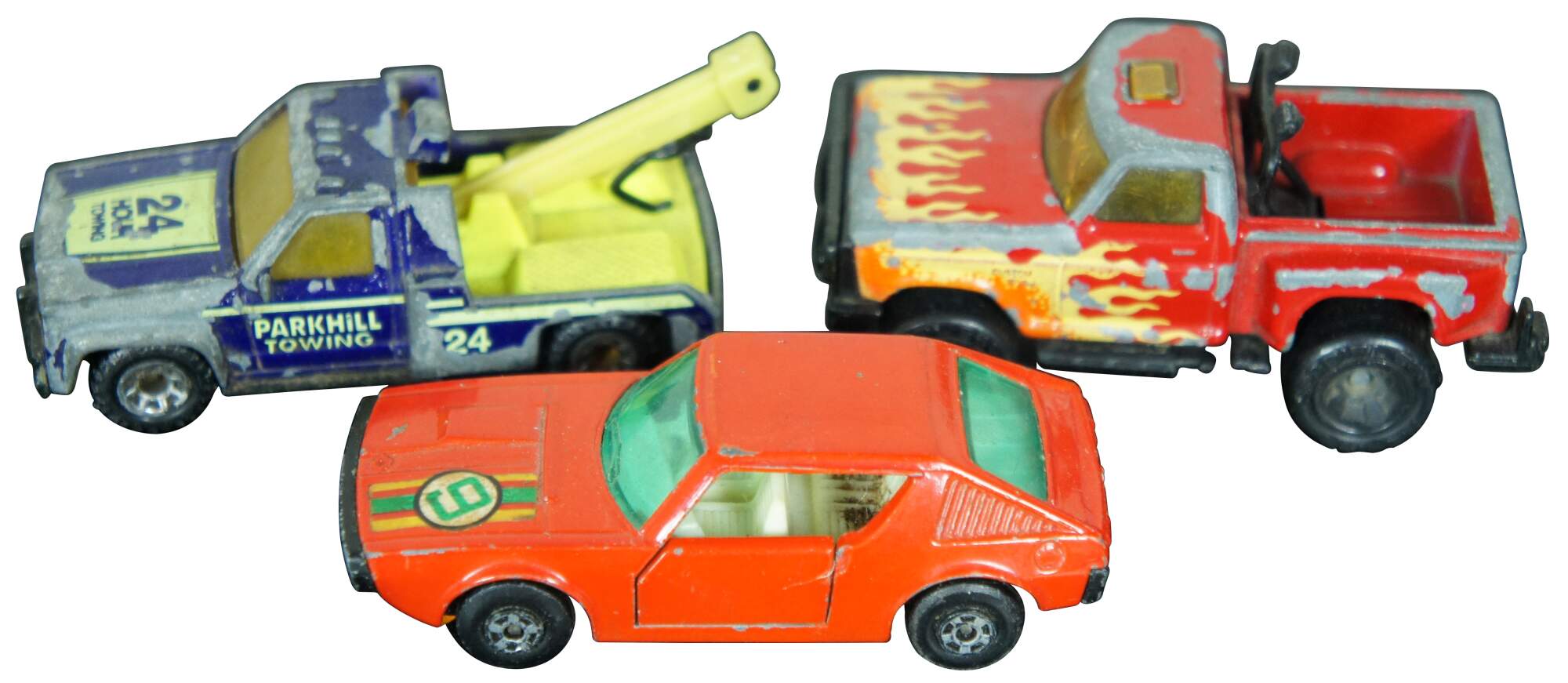 Lot of 15 rare assorted 1960s-1980s Matchbox and Hot Wheels cars and trucks. Well played with. Matchbox: 1971 Superfast Mod Rod No 1, 1974 No 62 Renault 17 TL, 1982 Flareside Pick-Up, 1987 GMC Wrecker. Hot Wheels: Redline 1967 Silhouette, Redline 1967 Volkawagen, Redline 1969 The Heavyweights (one blue, one green), Redline 1969 Volkswagon Beach Bomb, Redline 1969 Warpath, Redline 1974 911 Porsche, 1977 white pick up truck, 1987 Sandswarm, 1988 Hurricane.