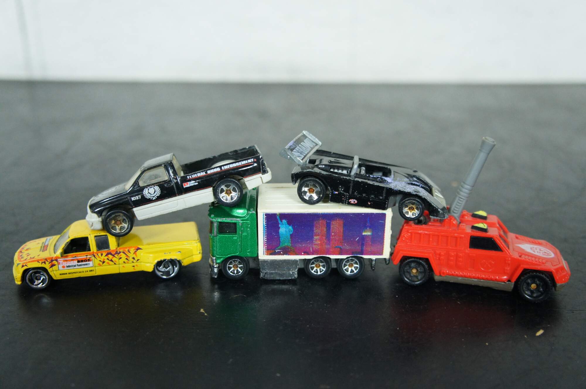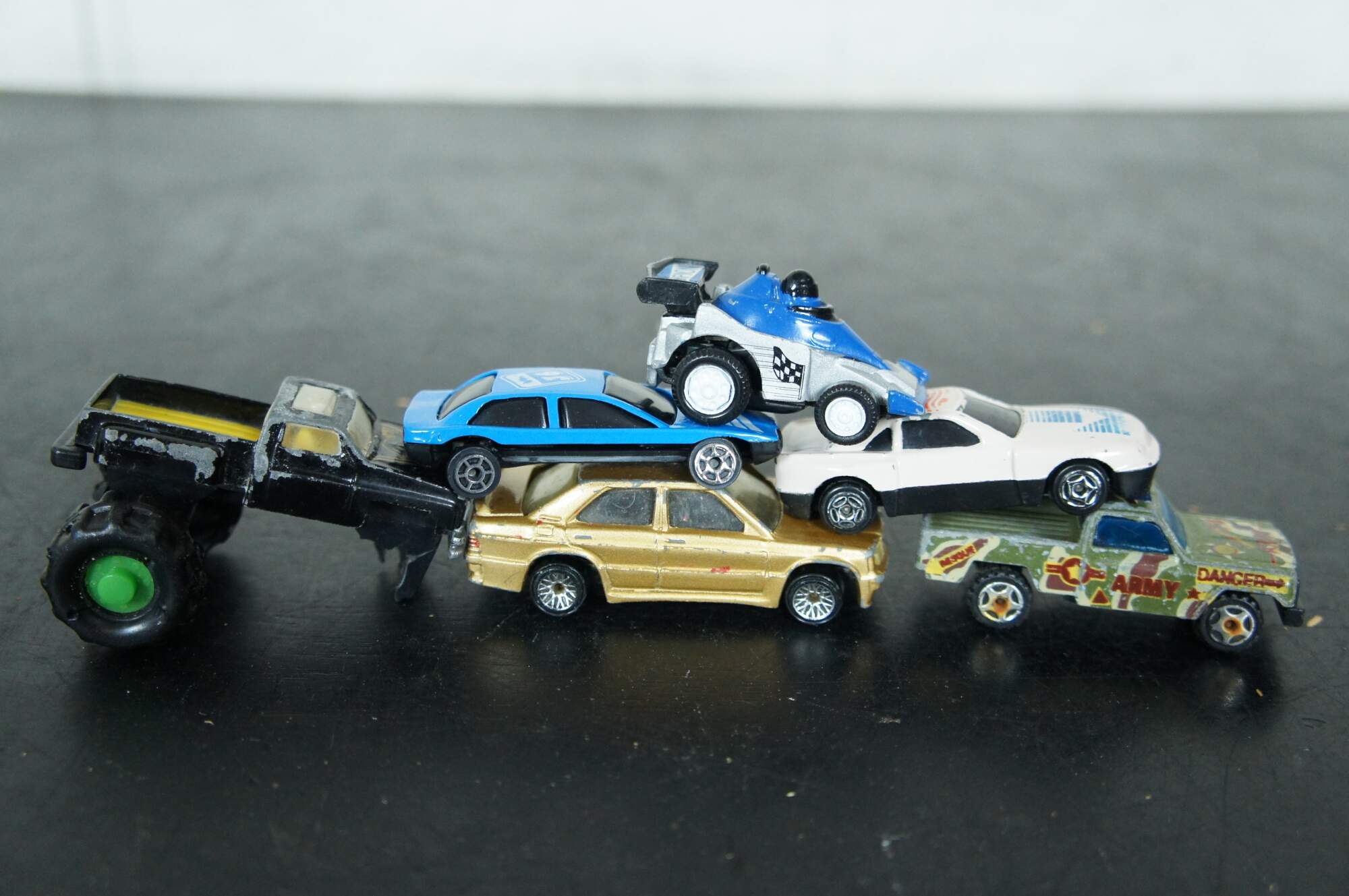 Lot of 22 assorted die cast cars and trucks, mostly by Hot Wheels, Matchbox and Hasbro; some unbranded. Undated: white race car #40, Army camo pick-up, Champion drag racer, KM 36 race car, gold Hot Wheels sedan, #34 monster truck. Hot Wheels: 2002 Swoop Coupe, 2001 Custom 59 Cadillac, 2000 Monoposto, 2000 Cadillac LMP, 2000 MX48 Turbo, 1997 Call Away C-7, 1994 Dodge Ram Truck, 1991 380SEL, 1997 Customized C3500, 1991 Twin Towers Truck, 1999 Shadow MK 11A, 1994 fire truck, 192 USA race car, 1993 blue flame race car, 1995 Mazda RX-7. Hasbro 1995 DC Comics Batman car.