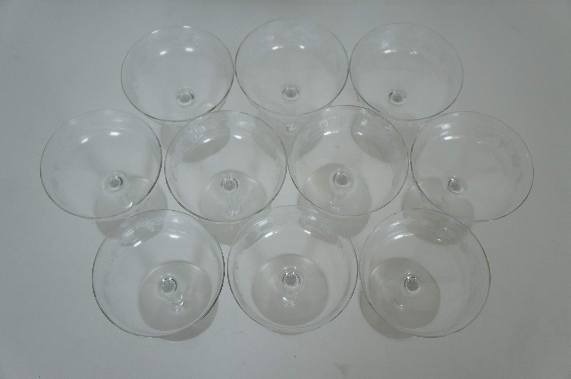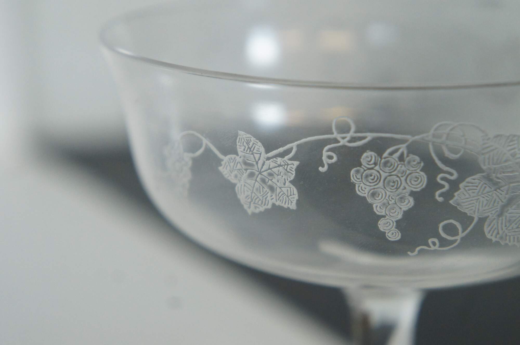 Set of ten antique Fostoria sherbert or champagne barware glasses featuring etched grapevine grape leaf design.