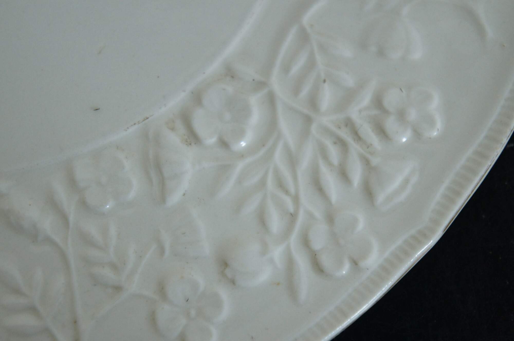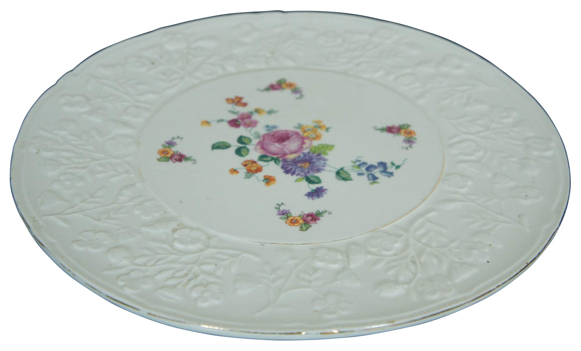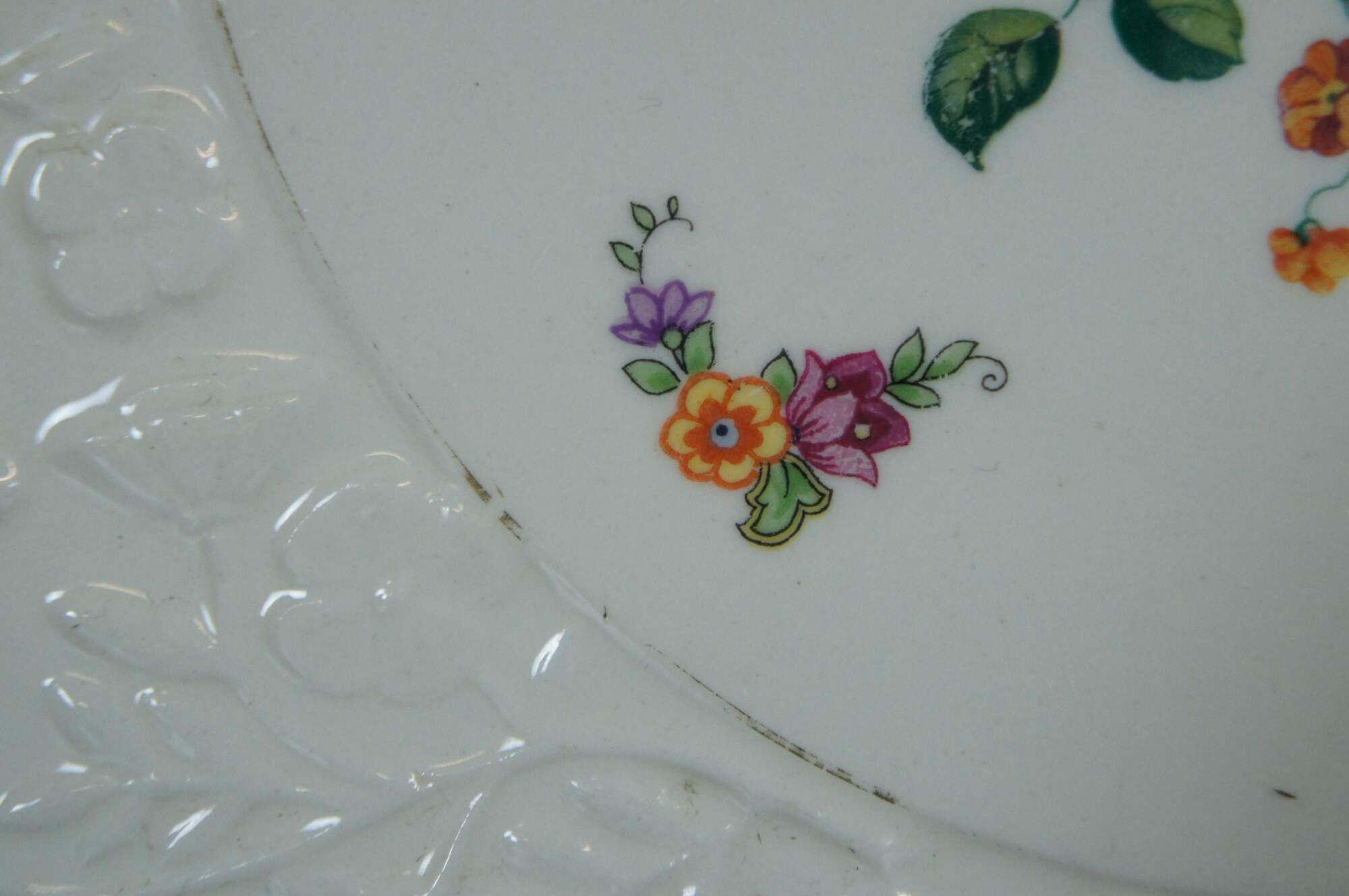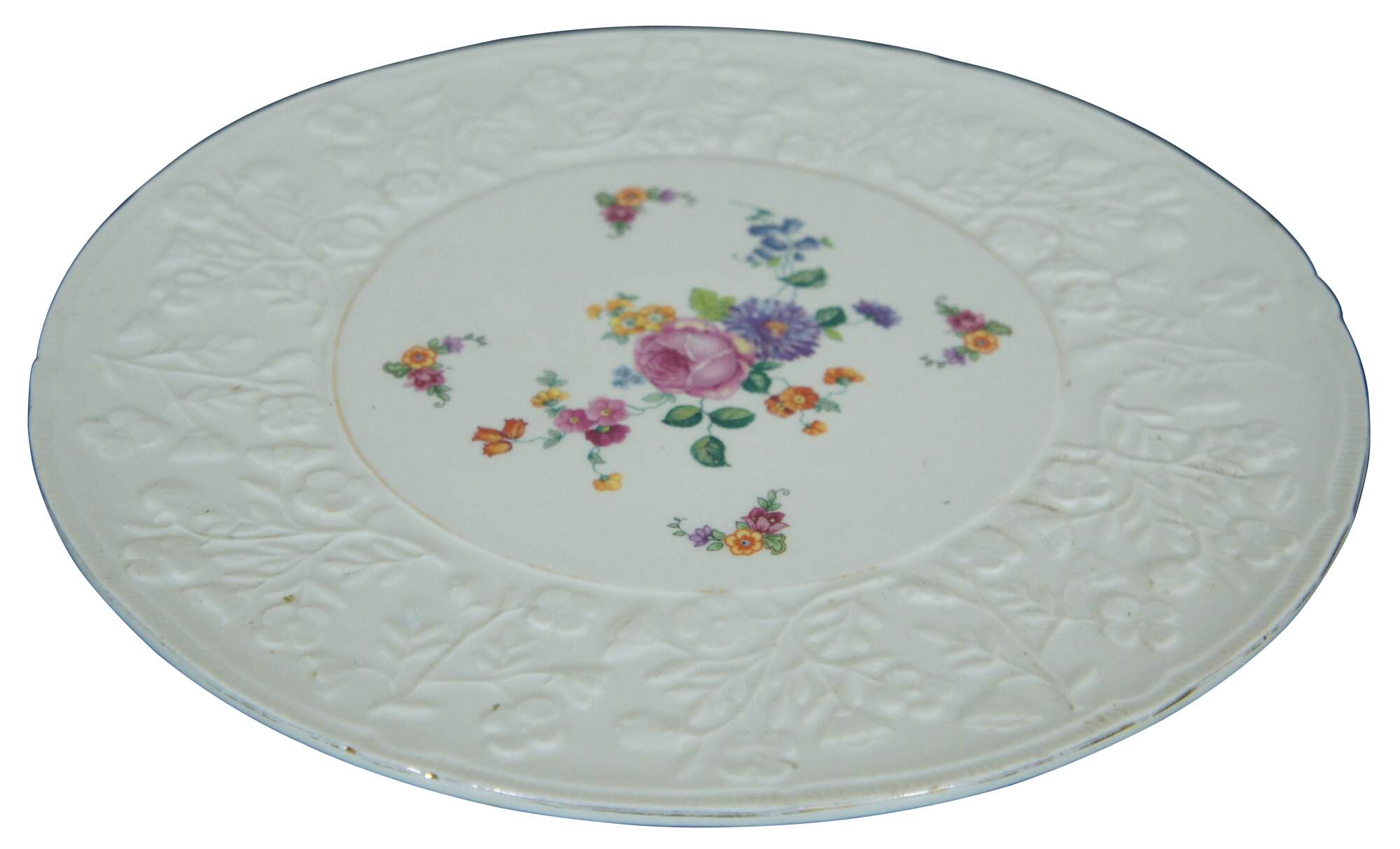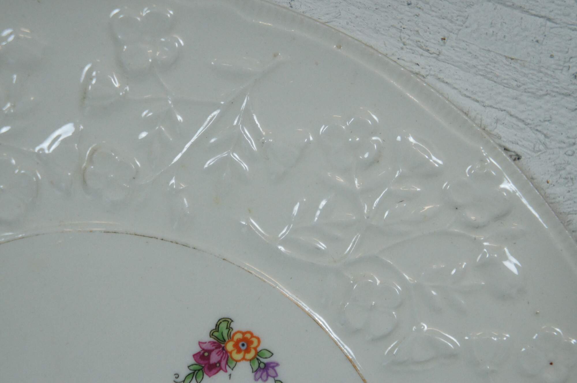 Vintage cream colored ceramic cake plate / teapot stand or trivet with molded flowers around the edge and printed flowers in the center. Made in Czechoslovakia. Attributed to E&R ERphila.