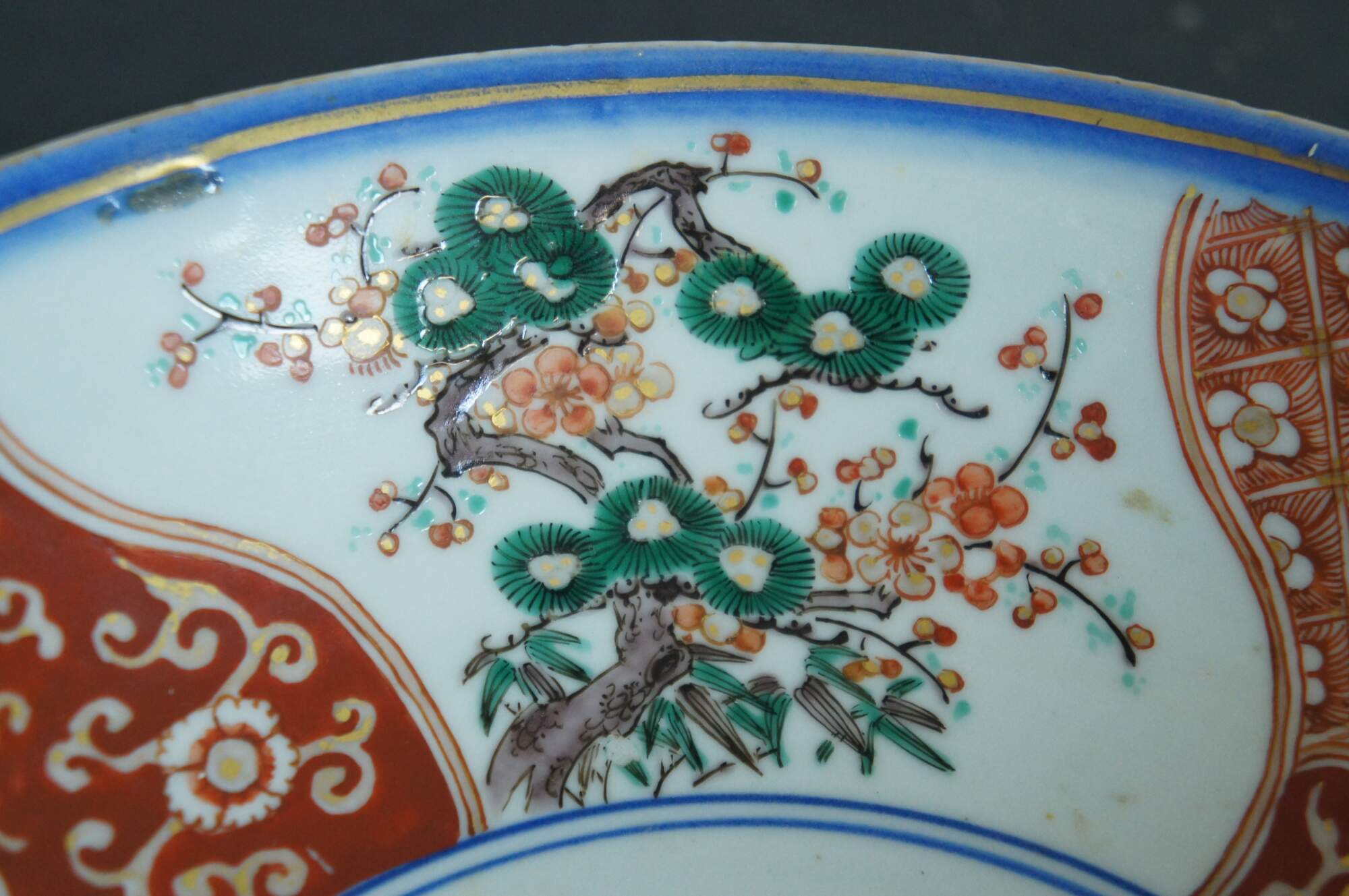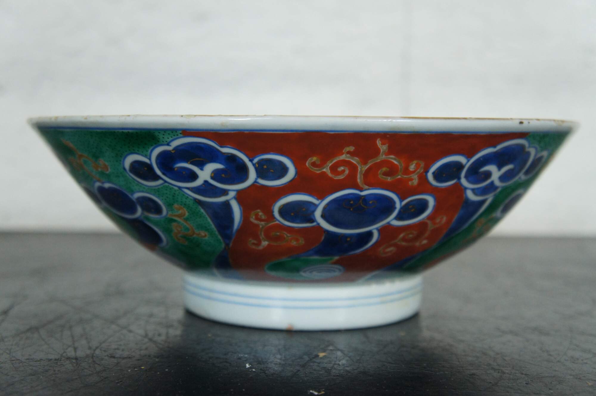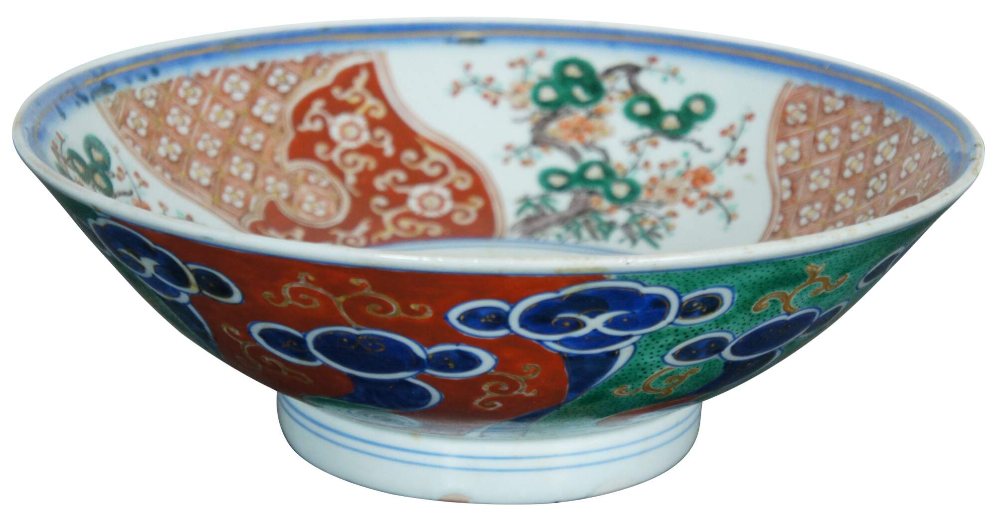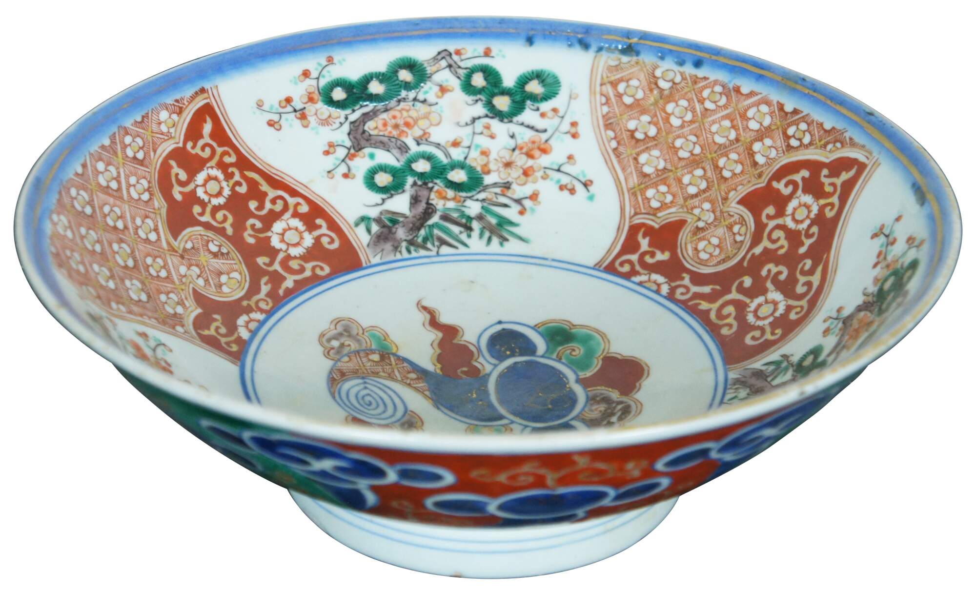 Antique Japanese Meiji period porcelain polychrome footed serving or centerpiece bowl, decorated with red and white florals, gnarled pines, and swirling clouds.