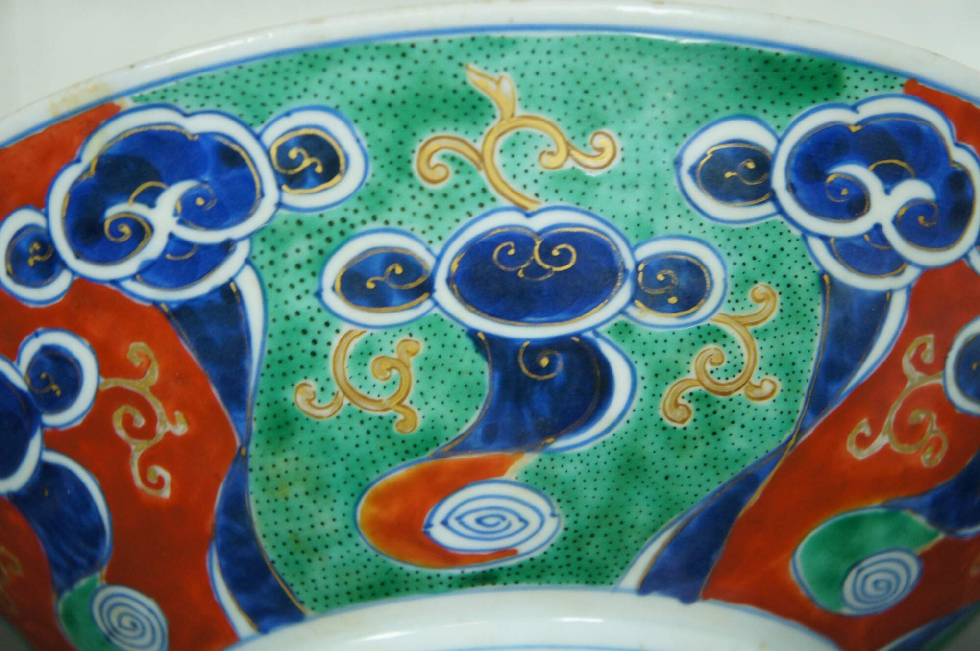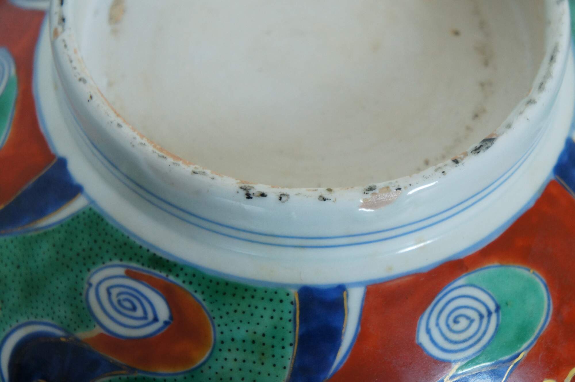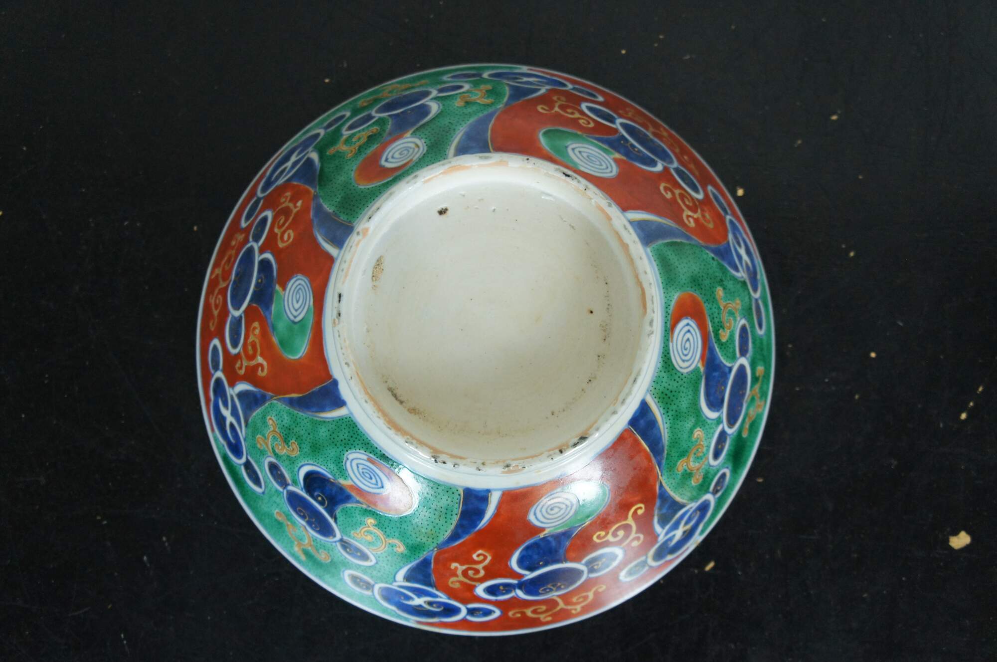 Antique Japanese Meiji period porcelain polychrome footed serving or centerpiece bowl, decorated with red and white florals, gnarled pines, and swirling clouds.