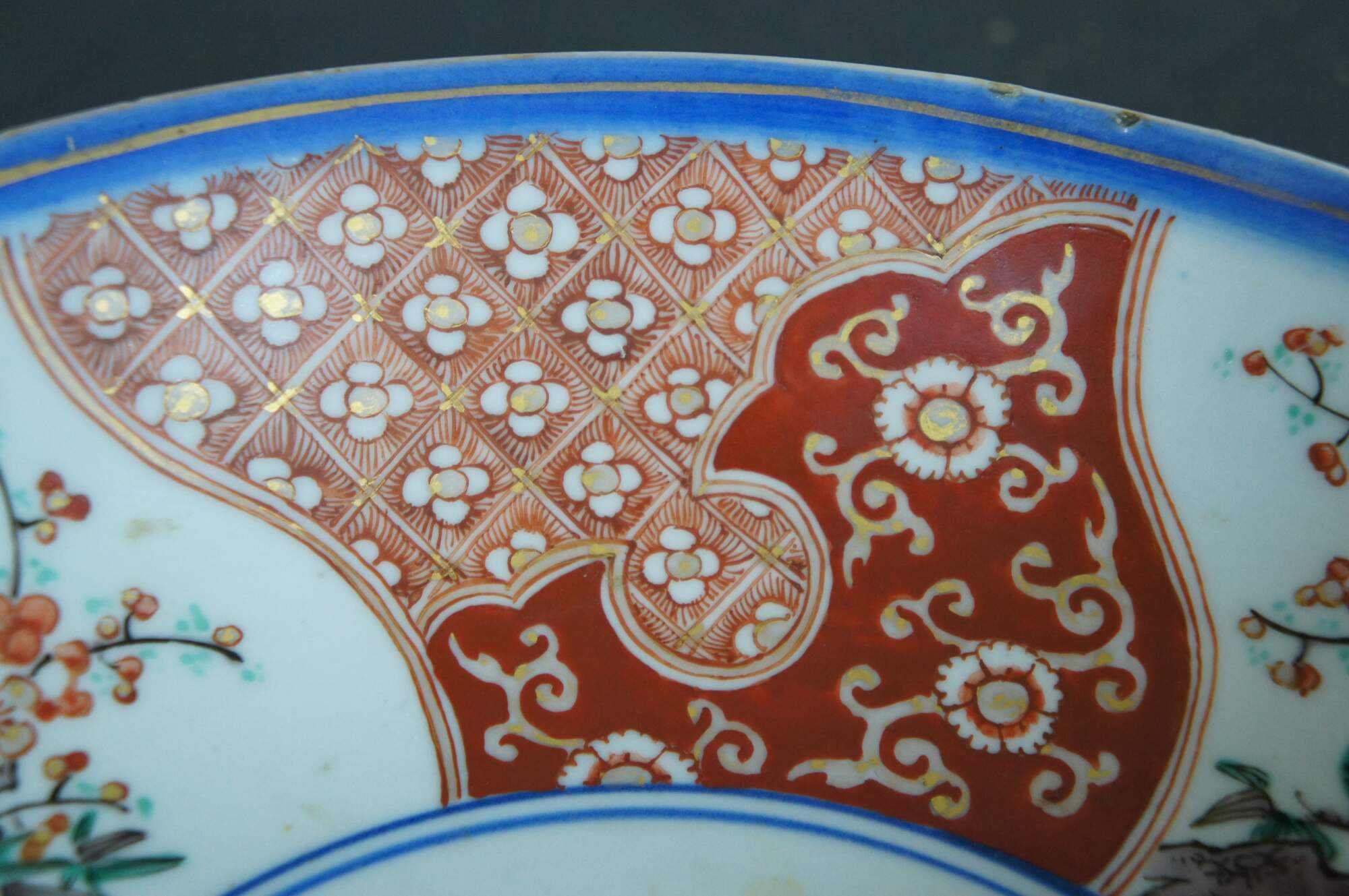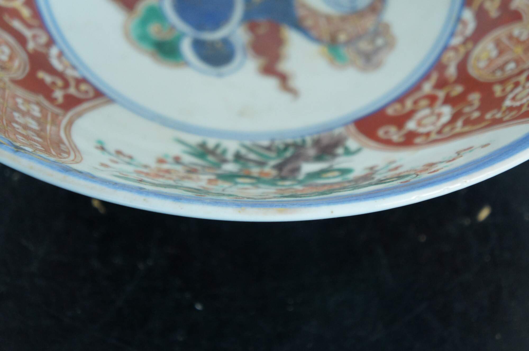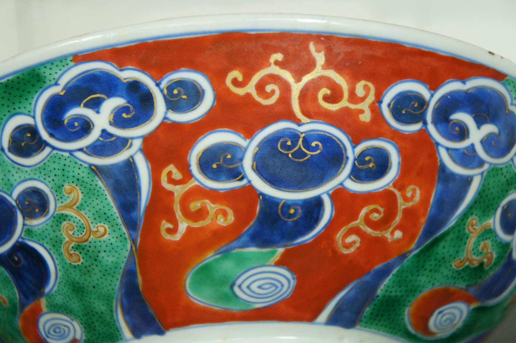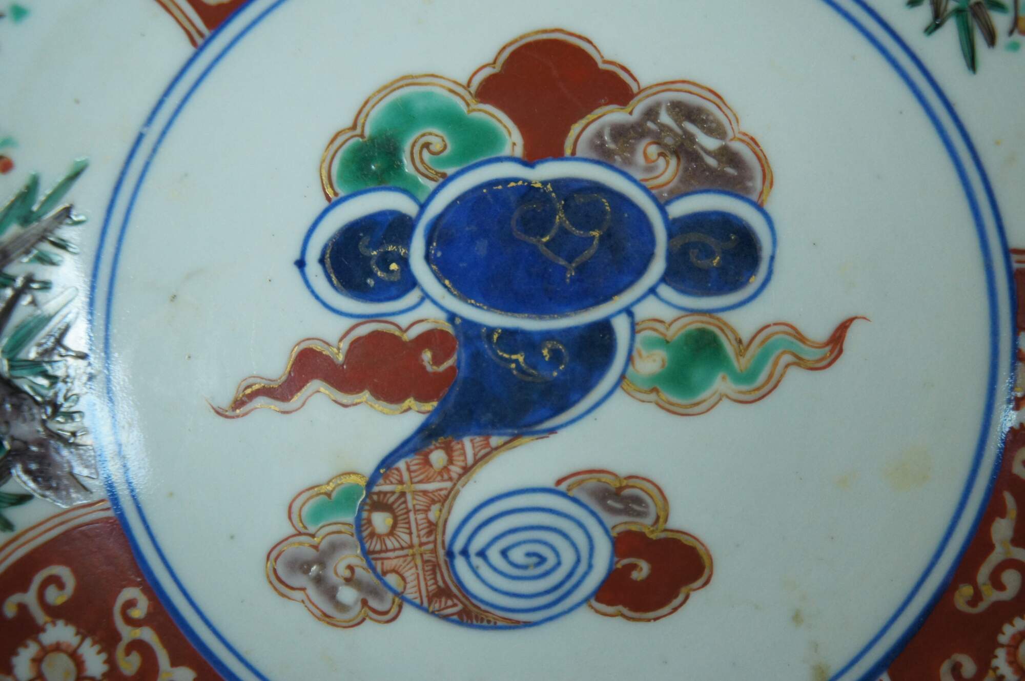 Antique Japanese Meiji period porcelain polychrome footed serving or centerpiece bowl, decorated with red and white florals, gnarled pines, and swirling clouds.