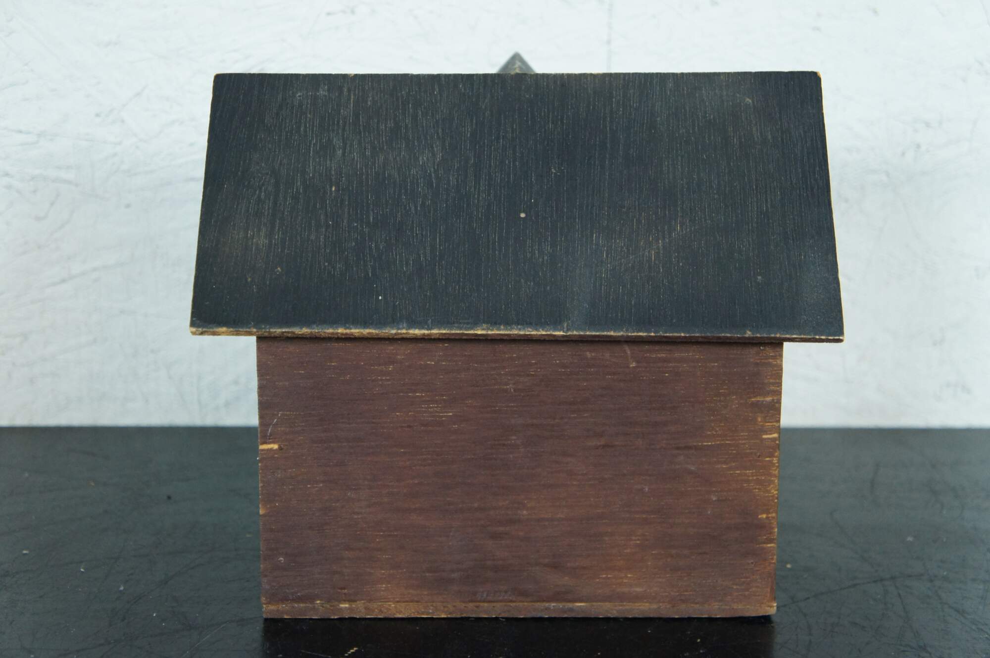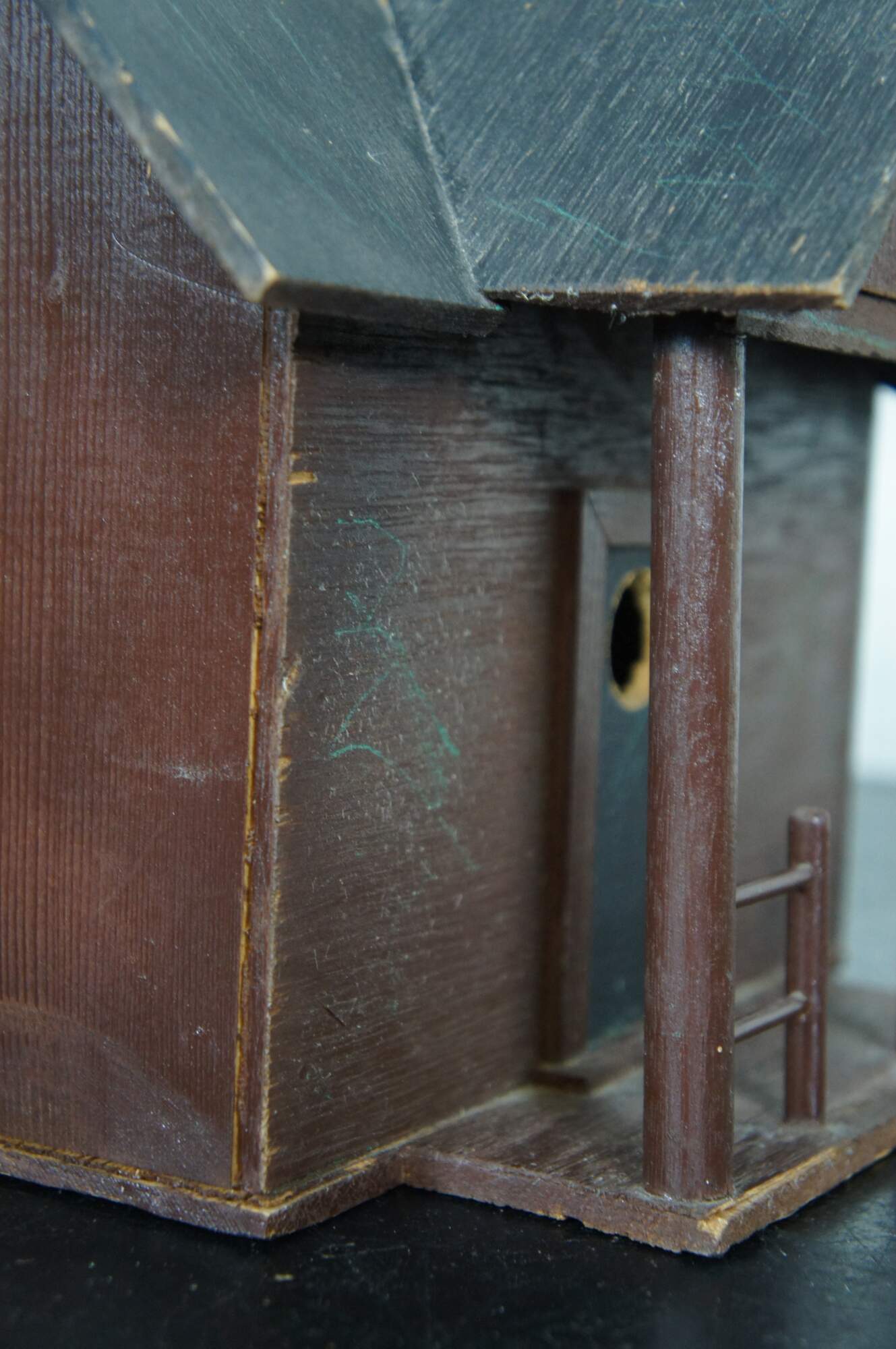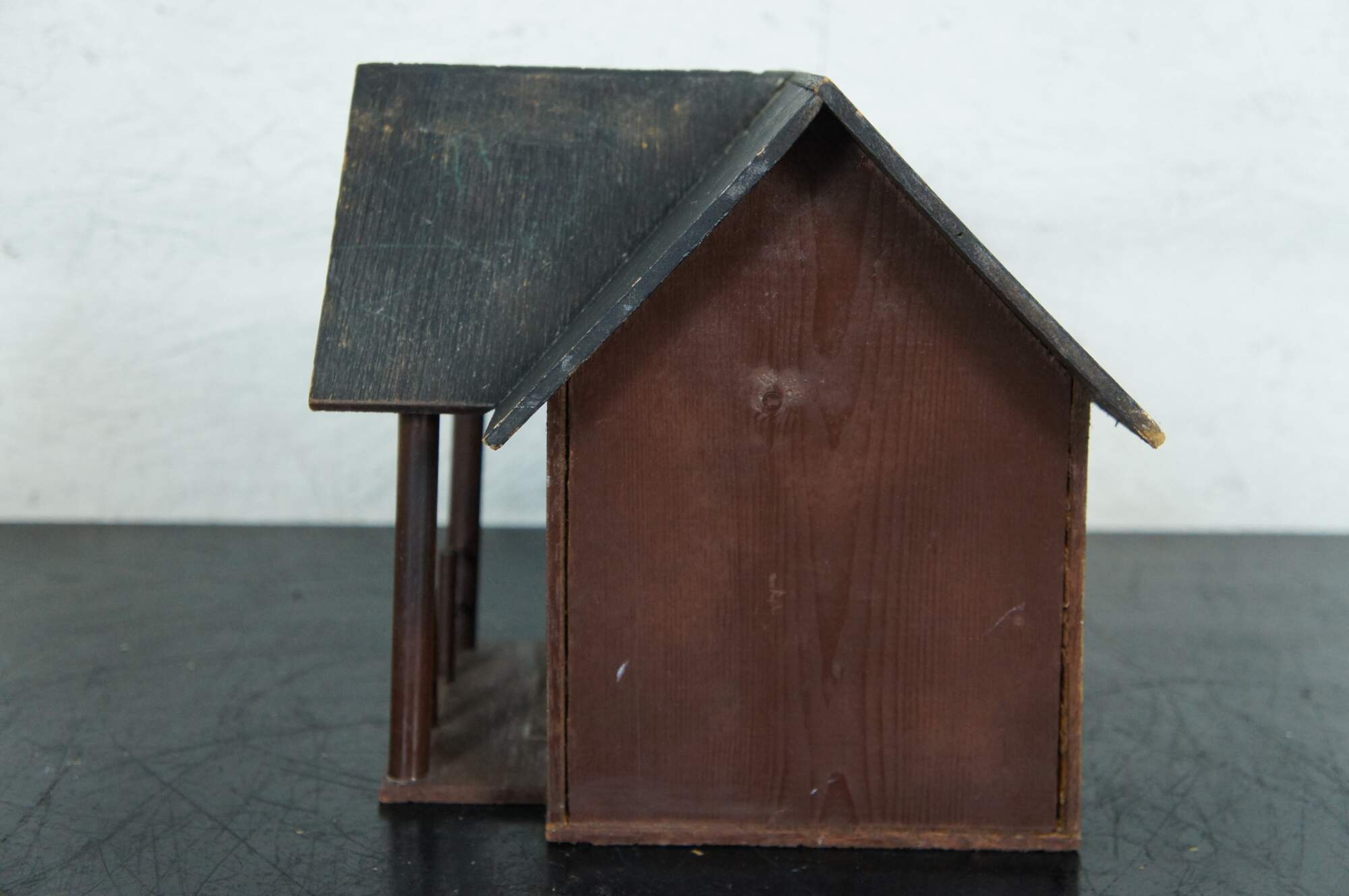 Vintage folk art bird house in the shape of a house with a porch, painted in brown and black.