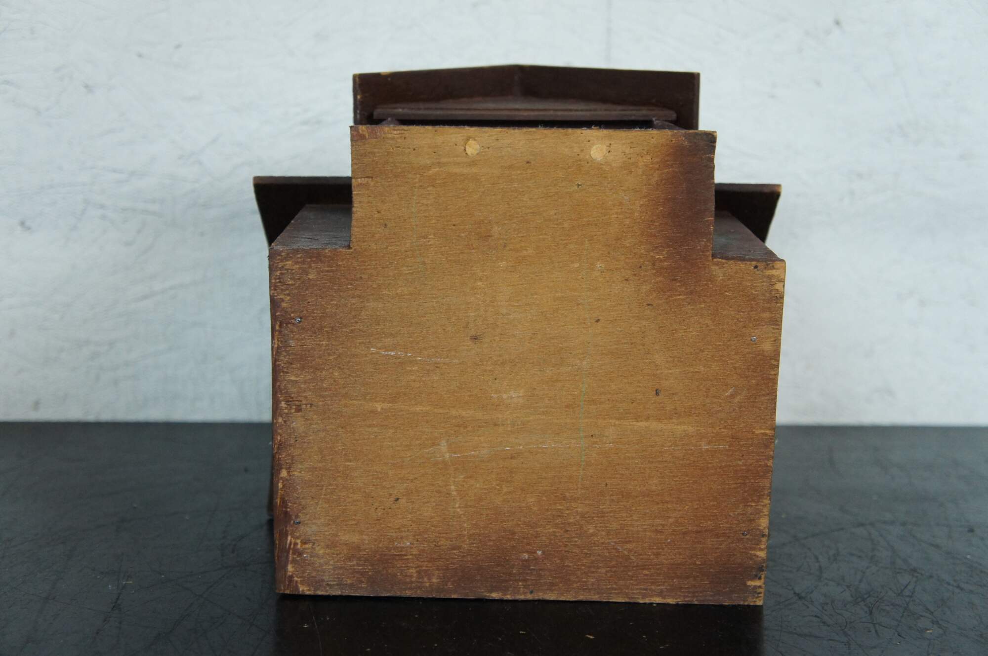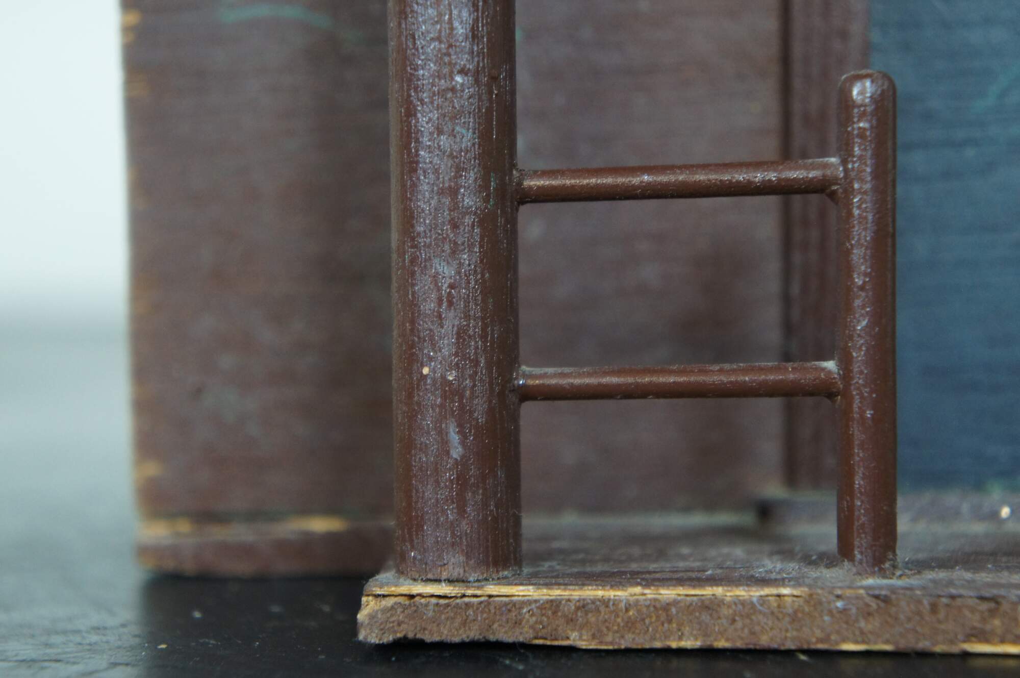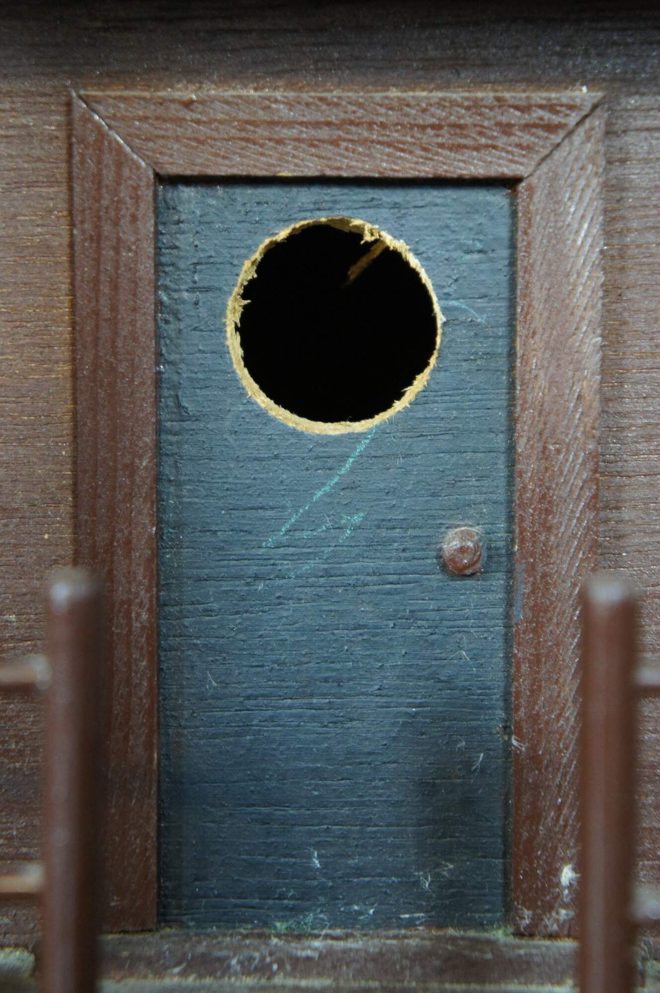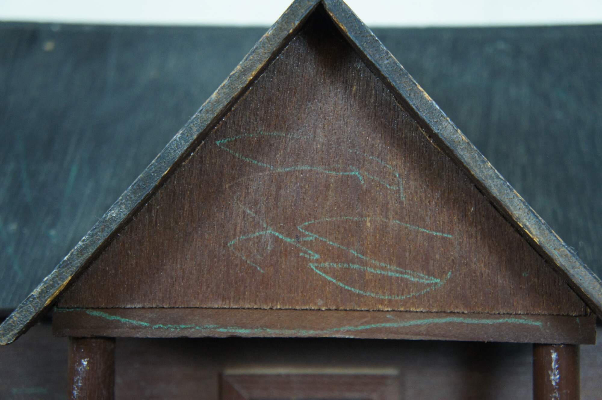 Vintage folk art bird house in the shape of a house with a porch, painted in brown and black.