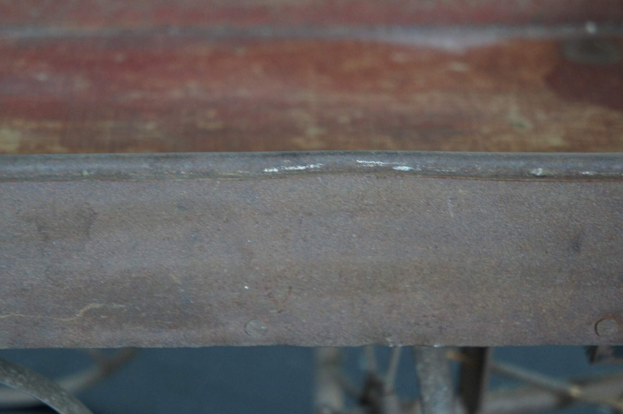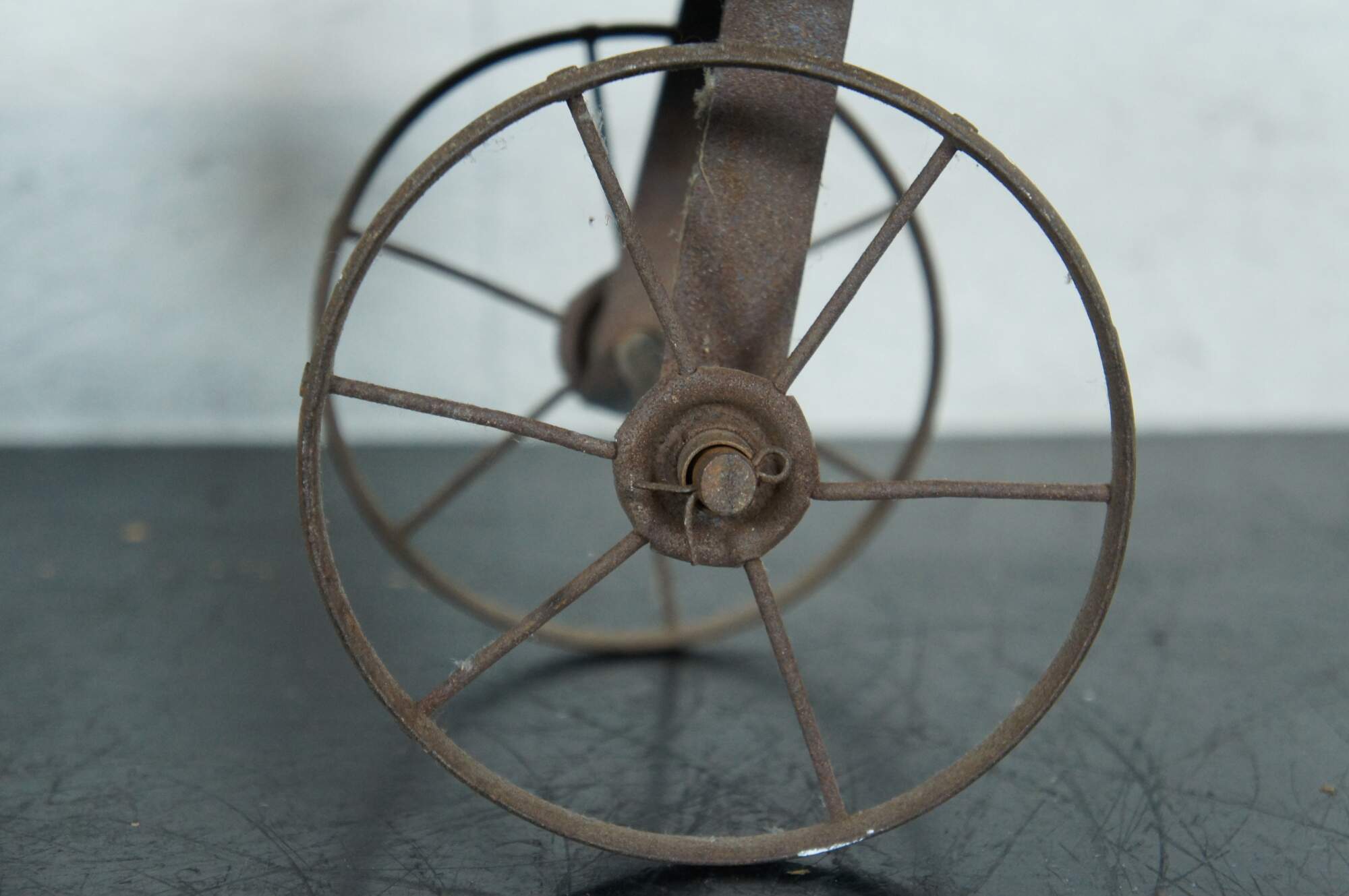 Antique 19th century folk art child’s doll sized farmhouse wagon or cart with metal body, wood base, twisted wire handle, and metal wheels, the front axle of which rotates in all directions.